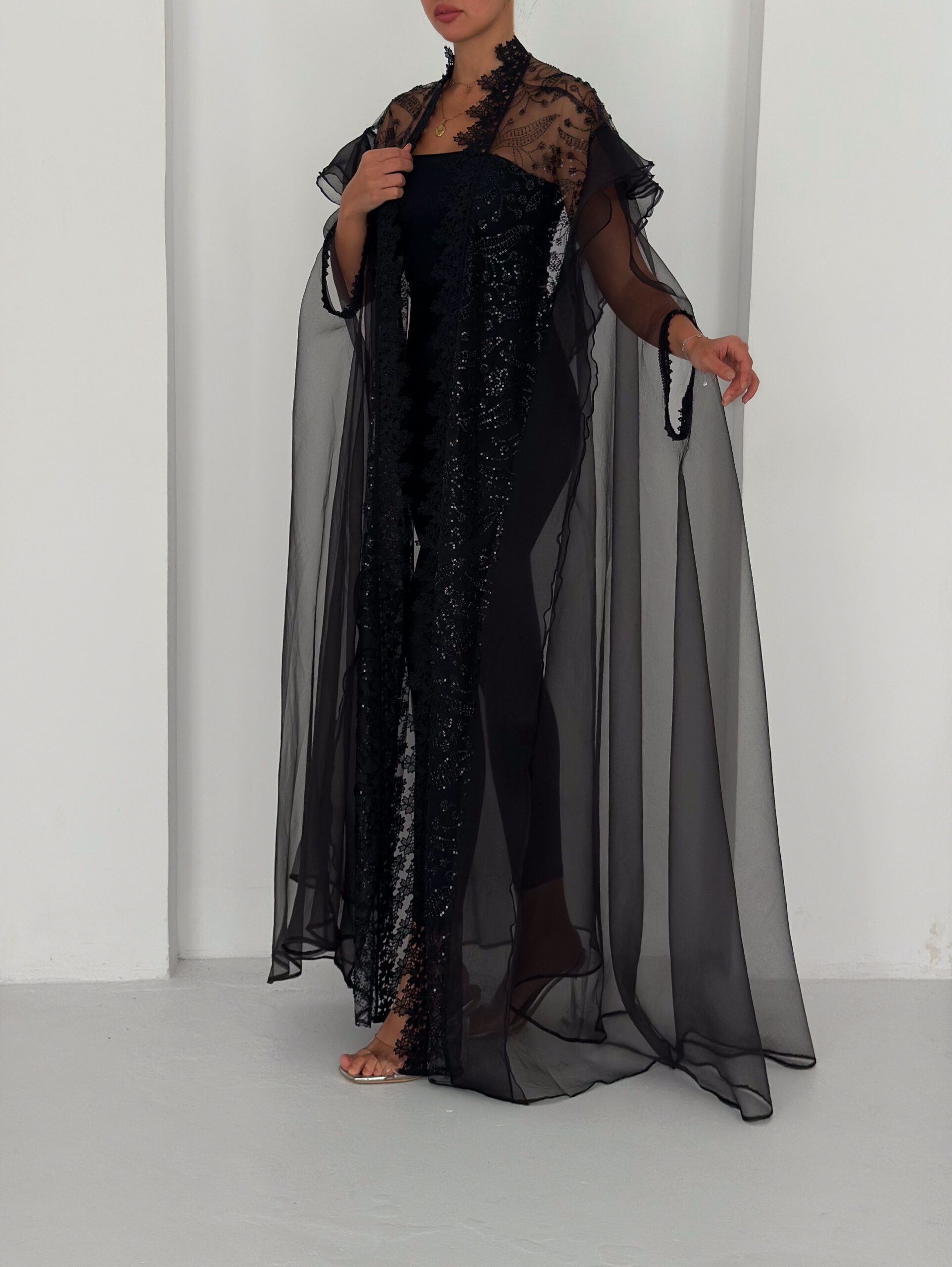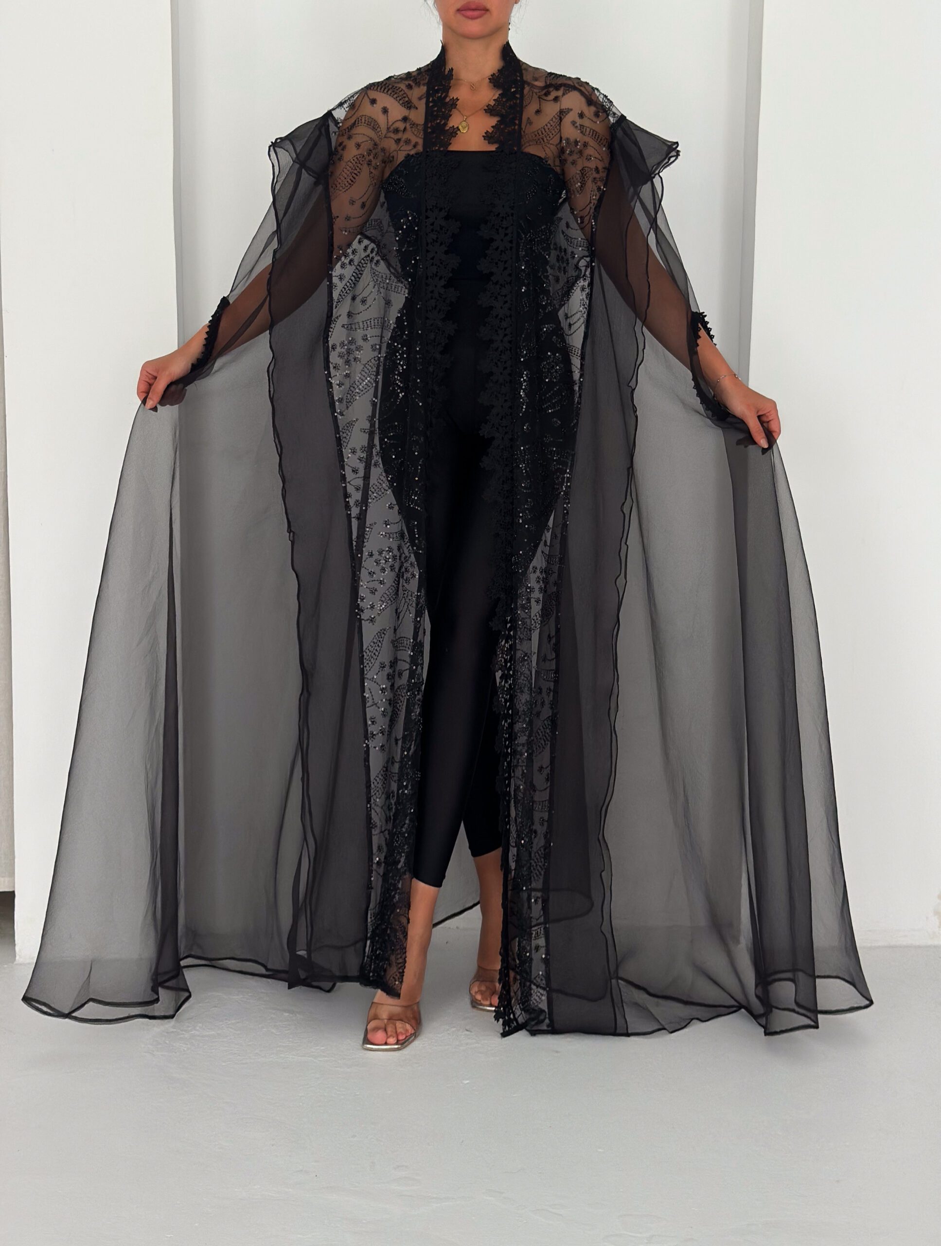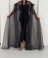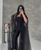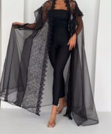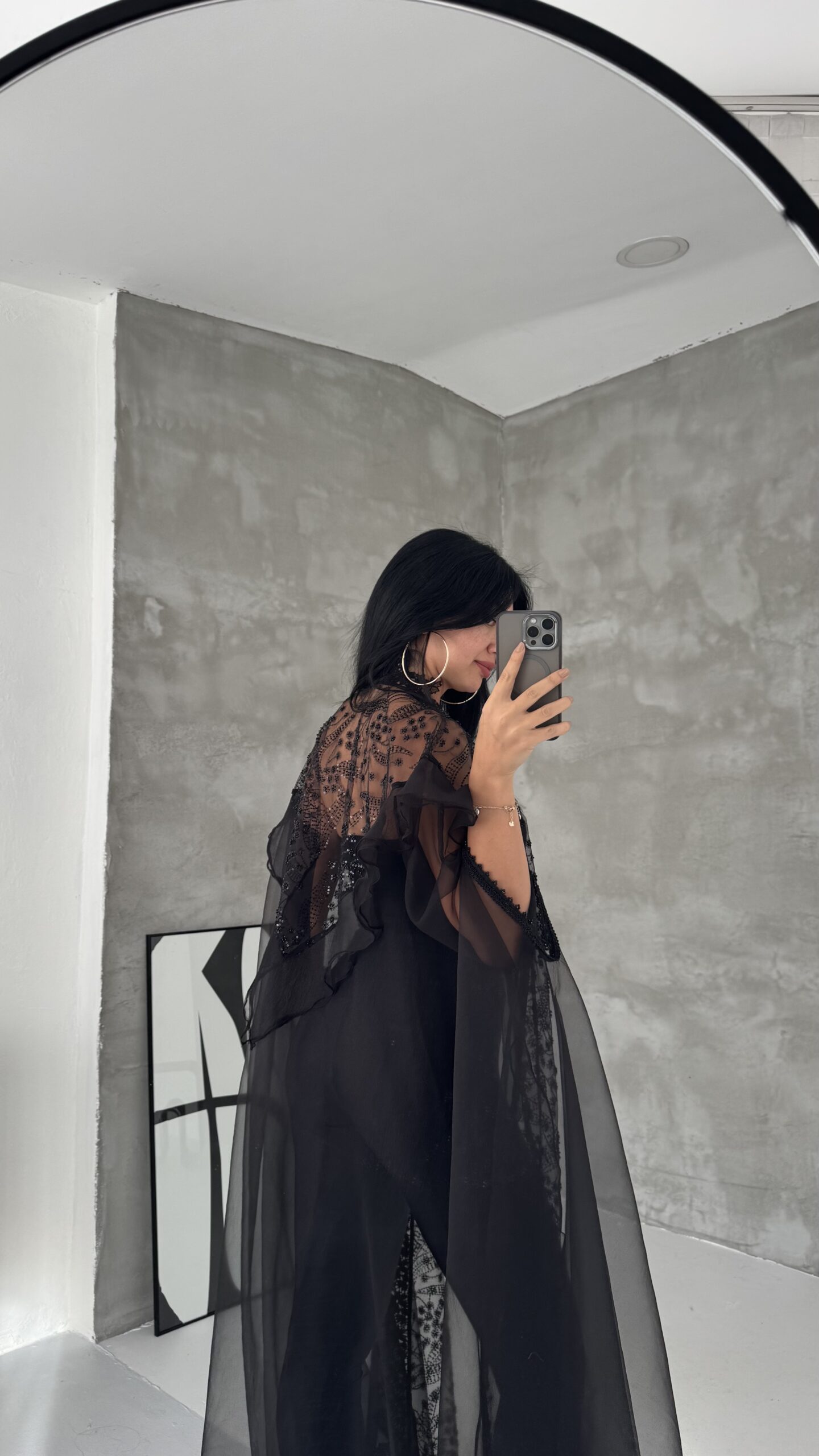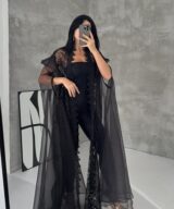 The soft transparency adds a touch of allure while maintaining elegance, making it perfect to style over a sleek jumpsuit or evening dress. Dramatic, feminine, and undeniably powerful — this abaya is made for women who own the moment.
