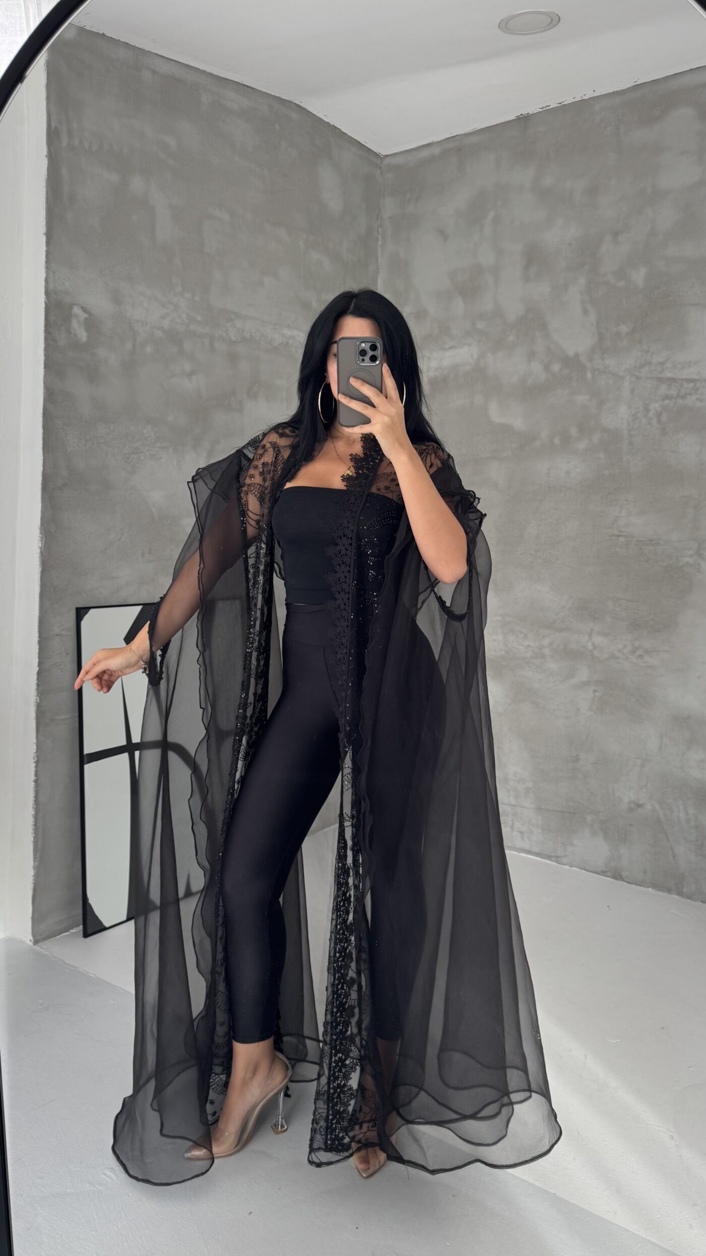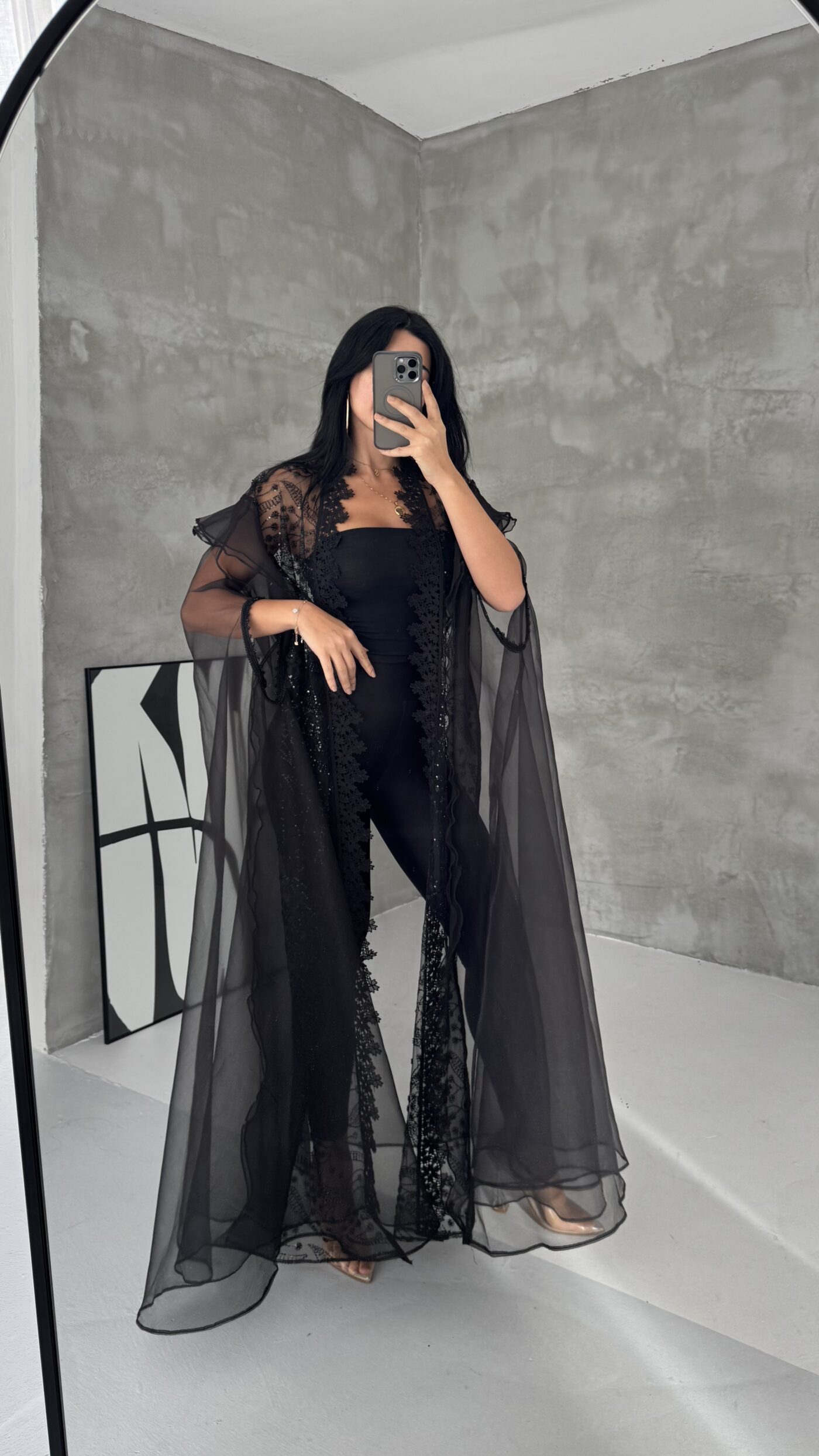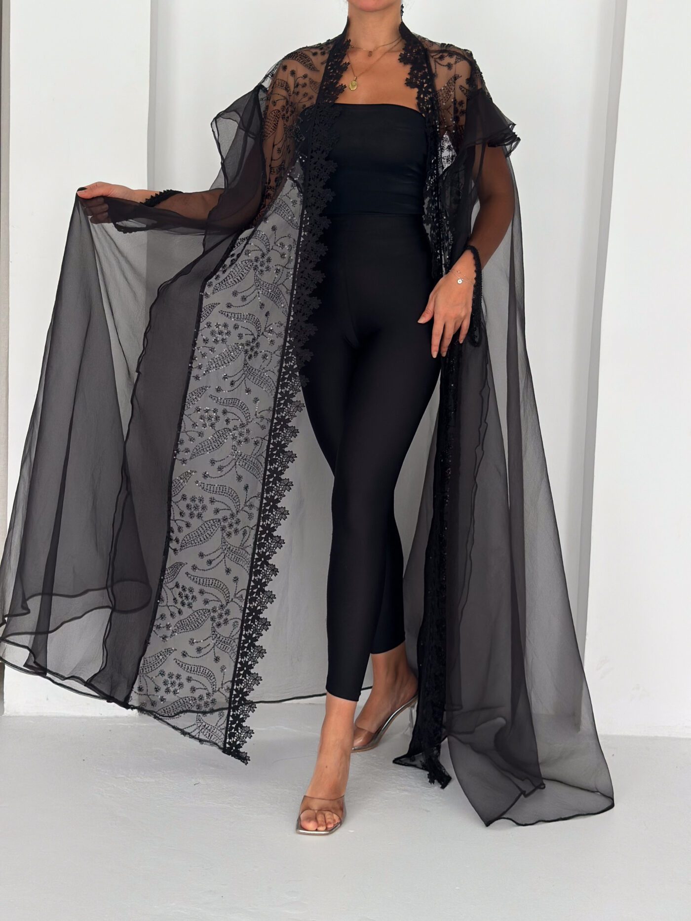 The soft transparency adds a touch of allure while maintaining elegance, making it perfect to style over a sleek jumpsuit or evening dress. Dramatic, feminine, and undeniably powerful — this abaya is made for women who own the moment.