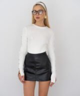 Soft ribbed knit top in off-white, featuring elegant silver pearl-button details along the sleeves. A chic piece that blends comfort and style — perfect for day-to-night looks.