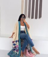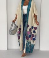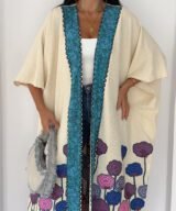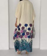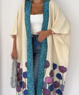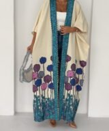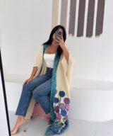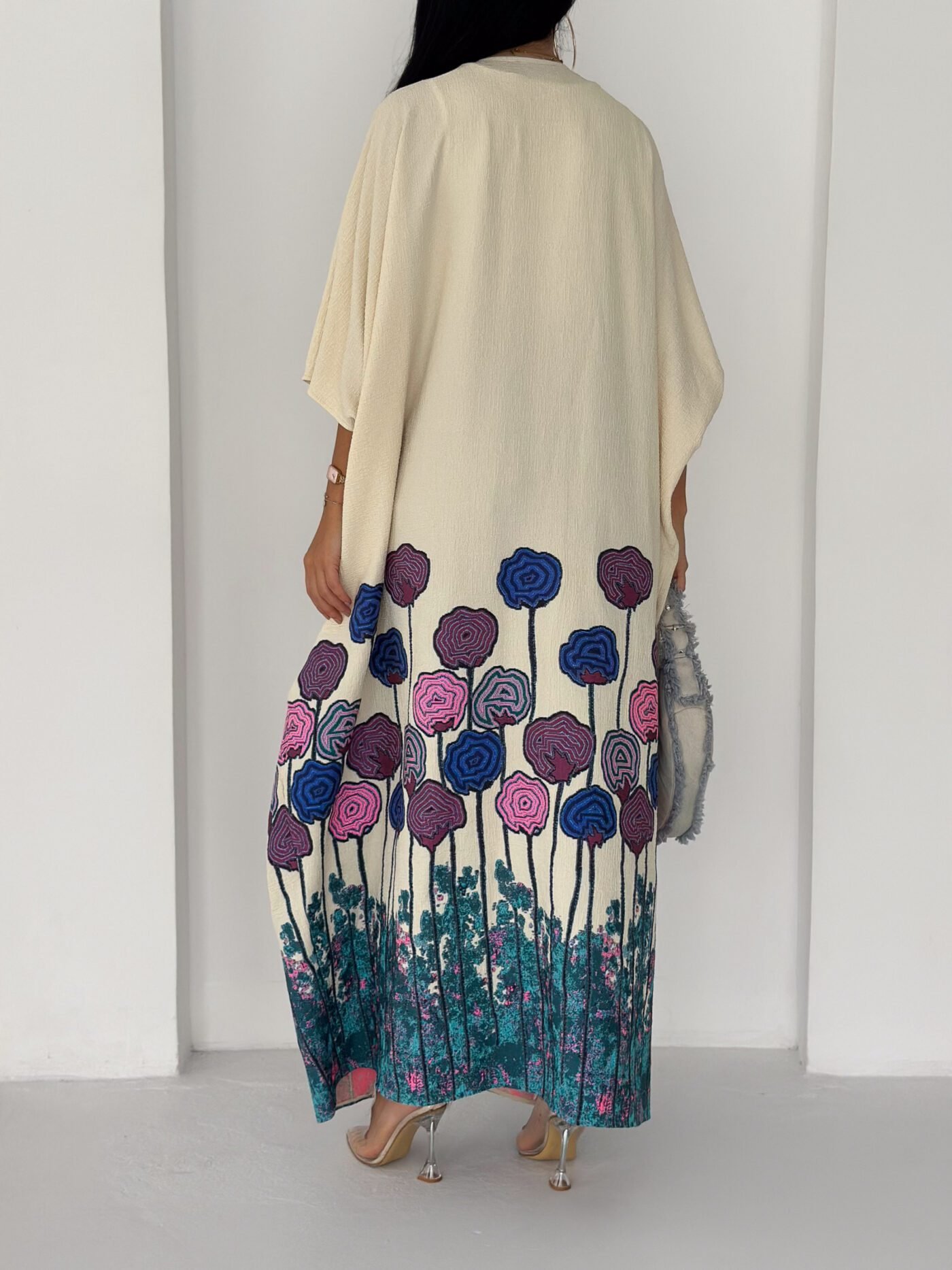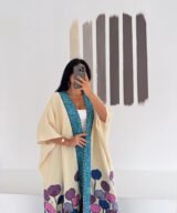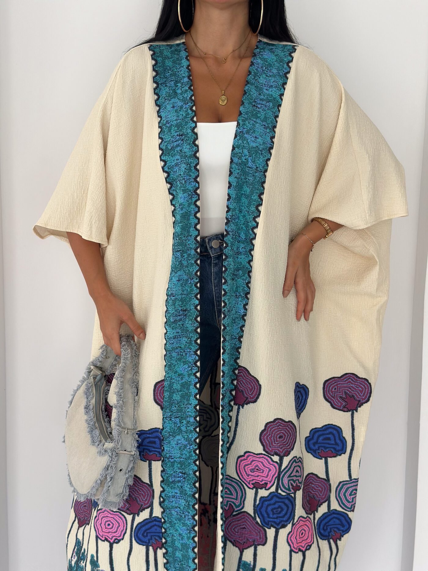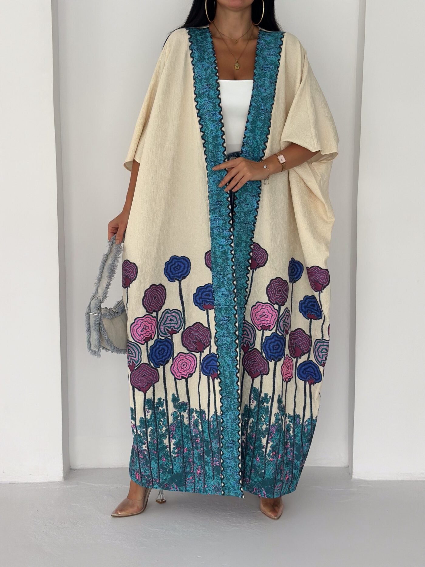 A statement open abaya inspired by blooming gardens and artistic florals. Designed in a soft cream base with vibrant embroidered flowers and a striking turquoise front trim. Lightweight, flowy and effortlessly elegant — perfect for elevating everyday outfits or styling for special outings.