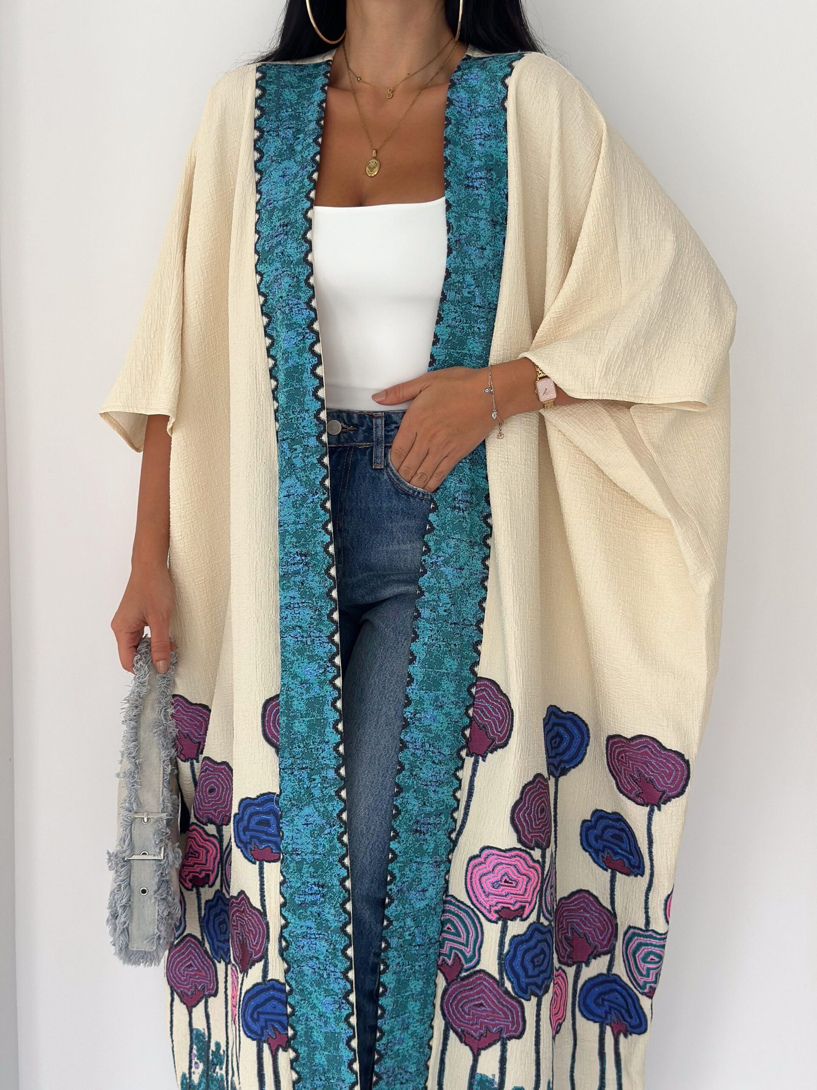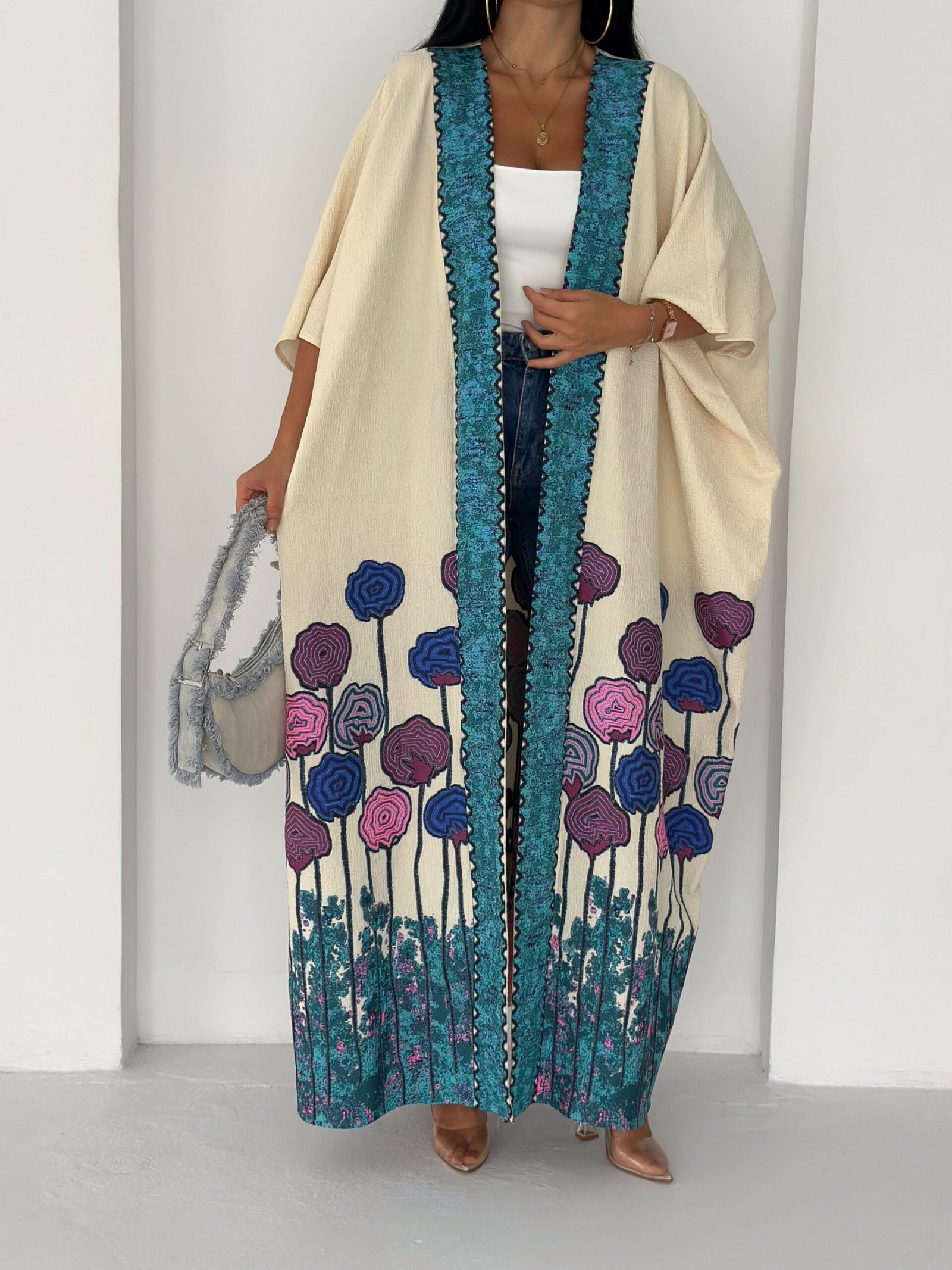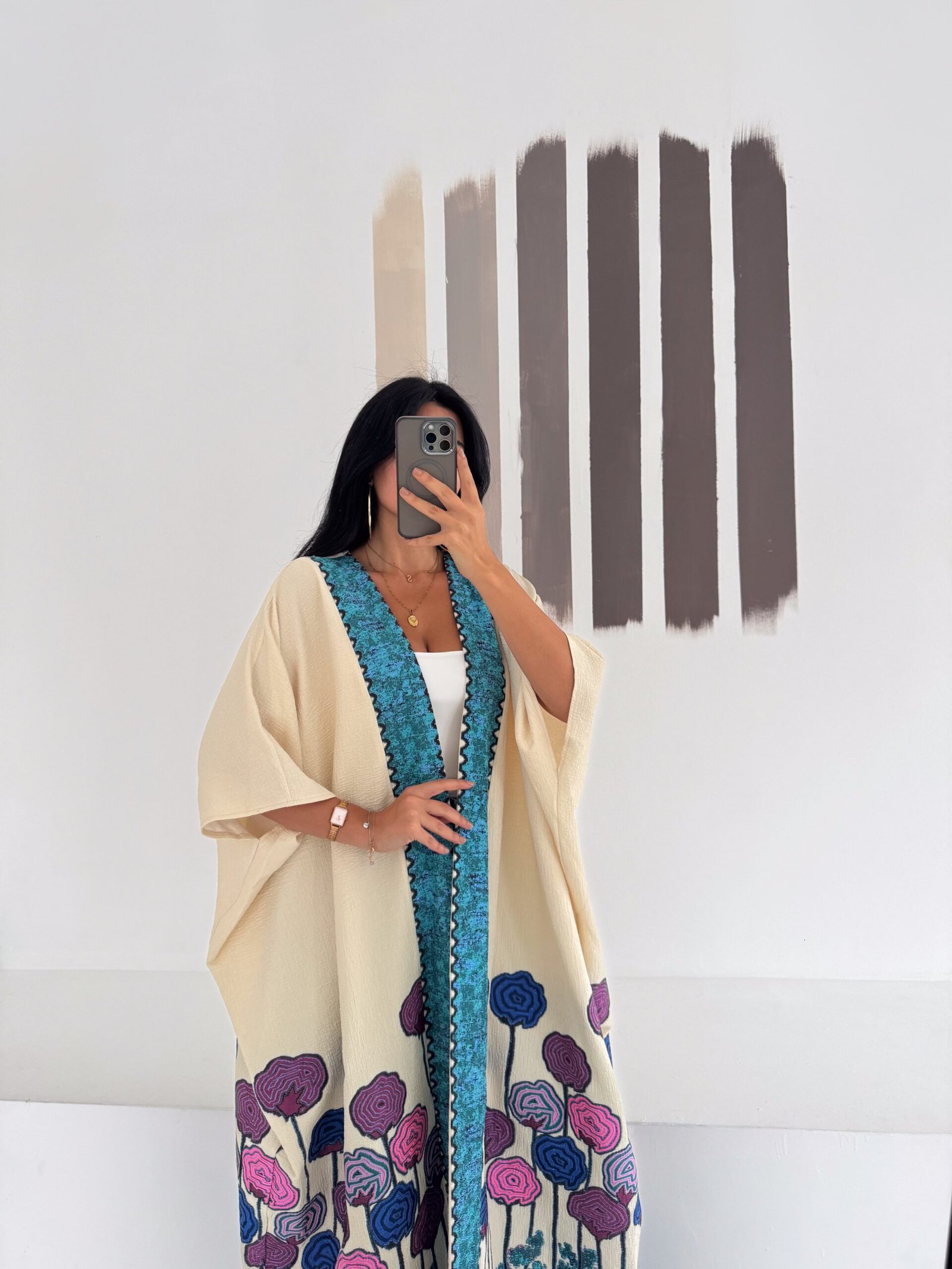 A statement open abaya inspired by blooming gardens and artistic florals. Designed in a soft cream base with vibrant embroidered flowers and a striking turquoise front trim. Lightweight, flowy and effortlessly elegant — perfect for elevating everyday outfits or styling for special outings.