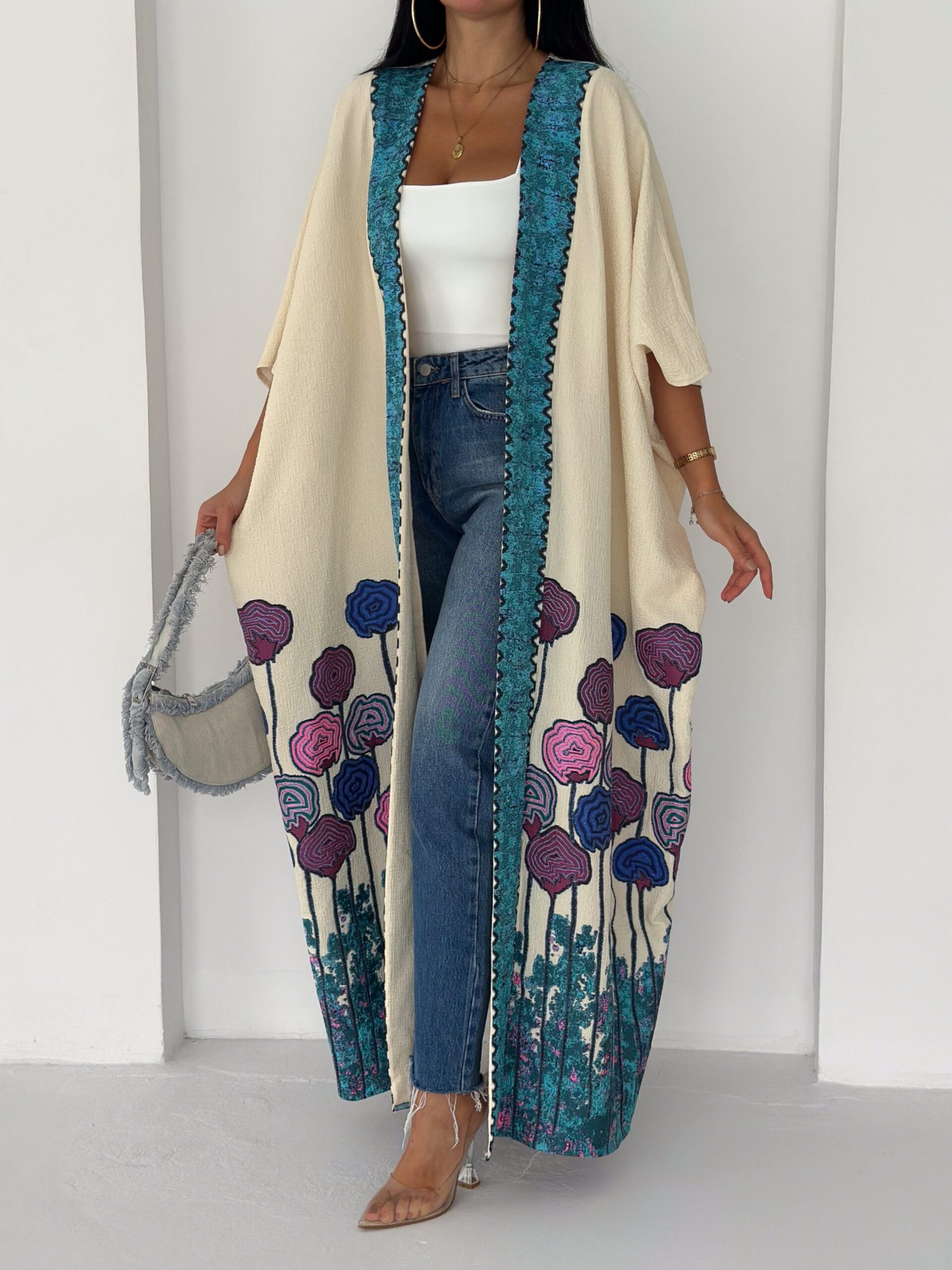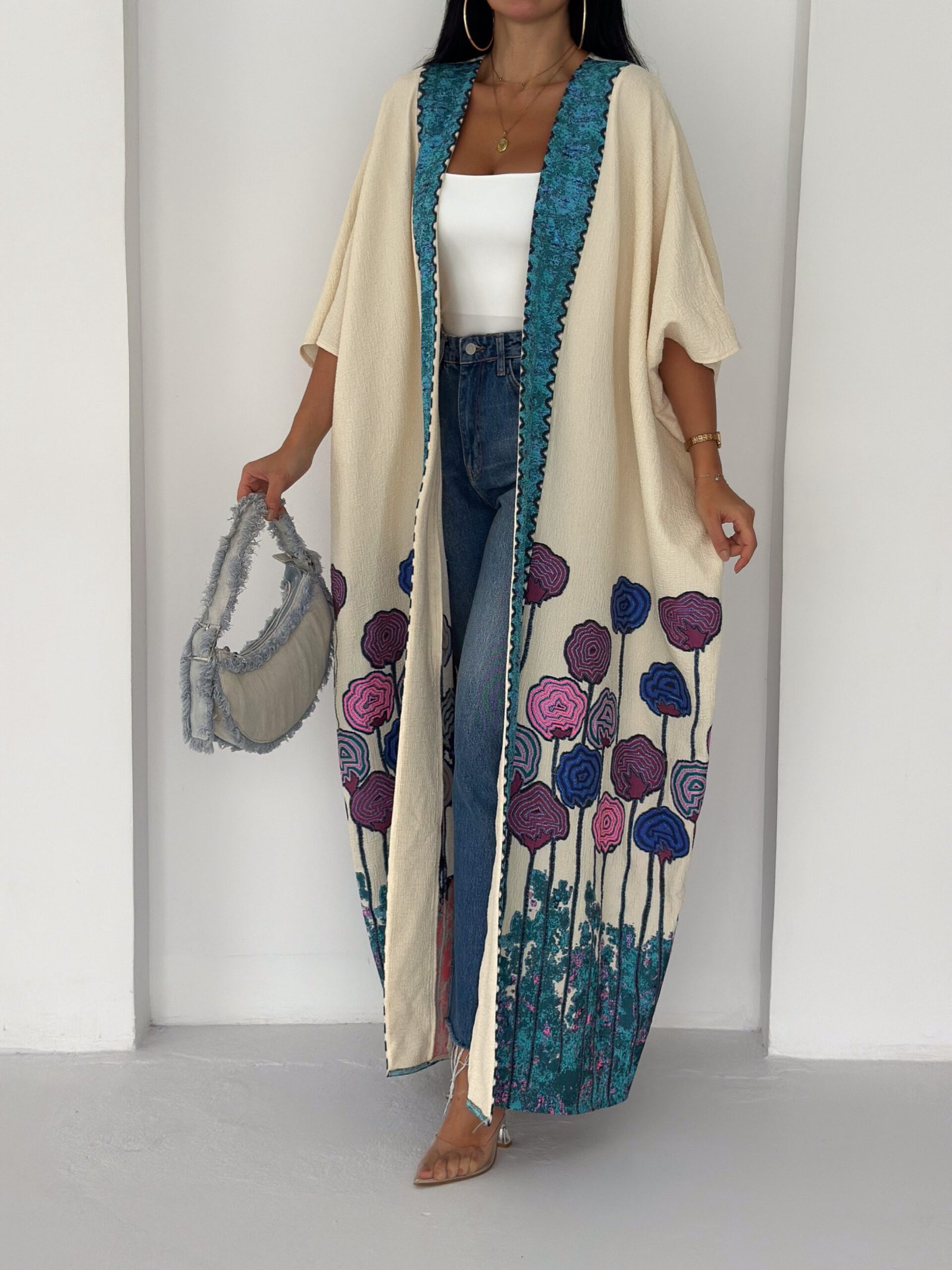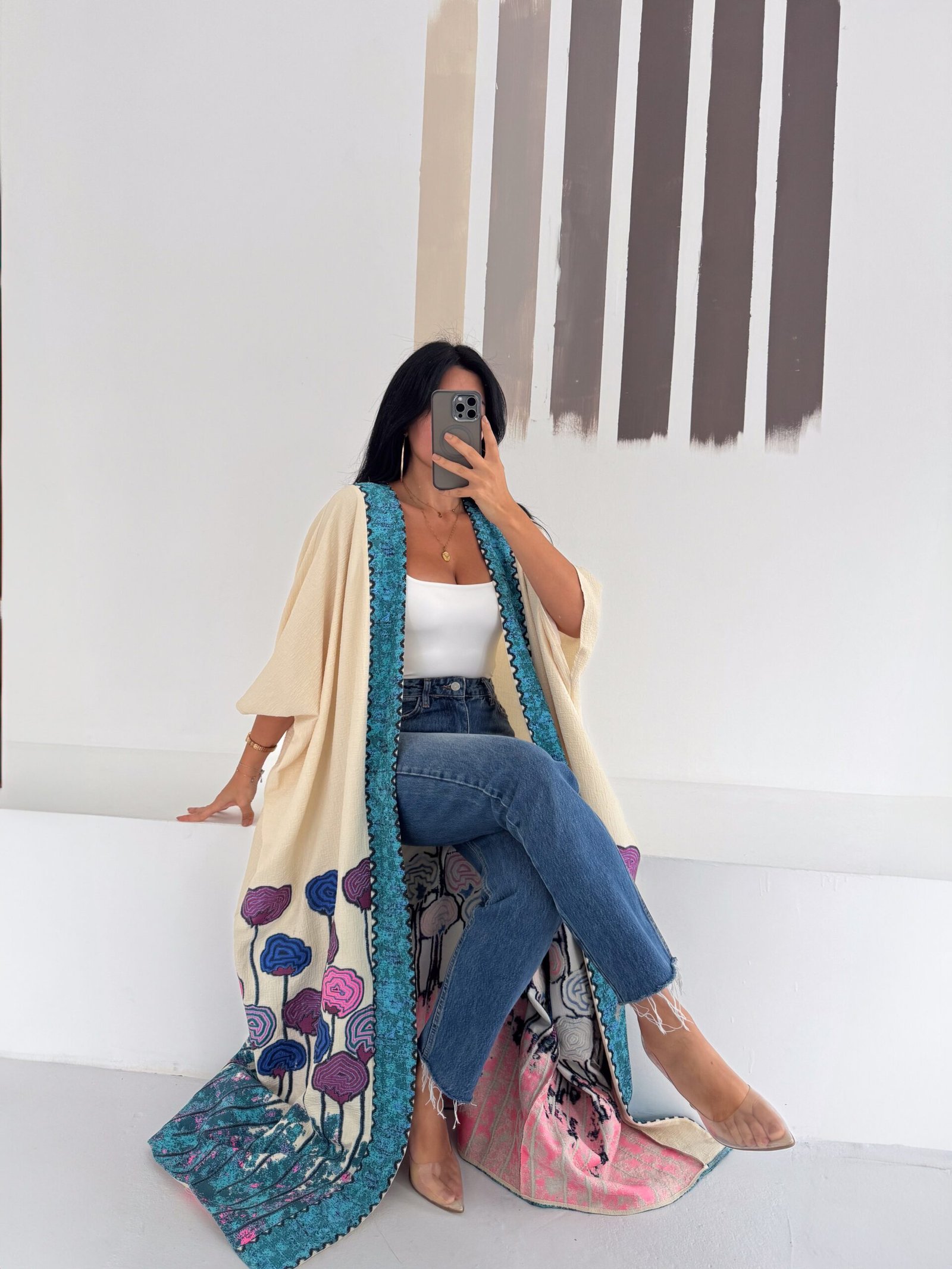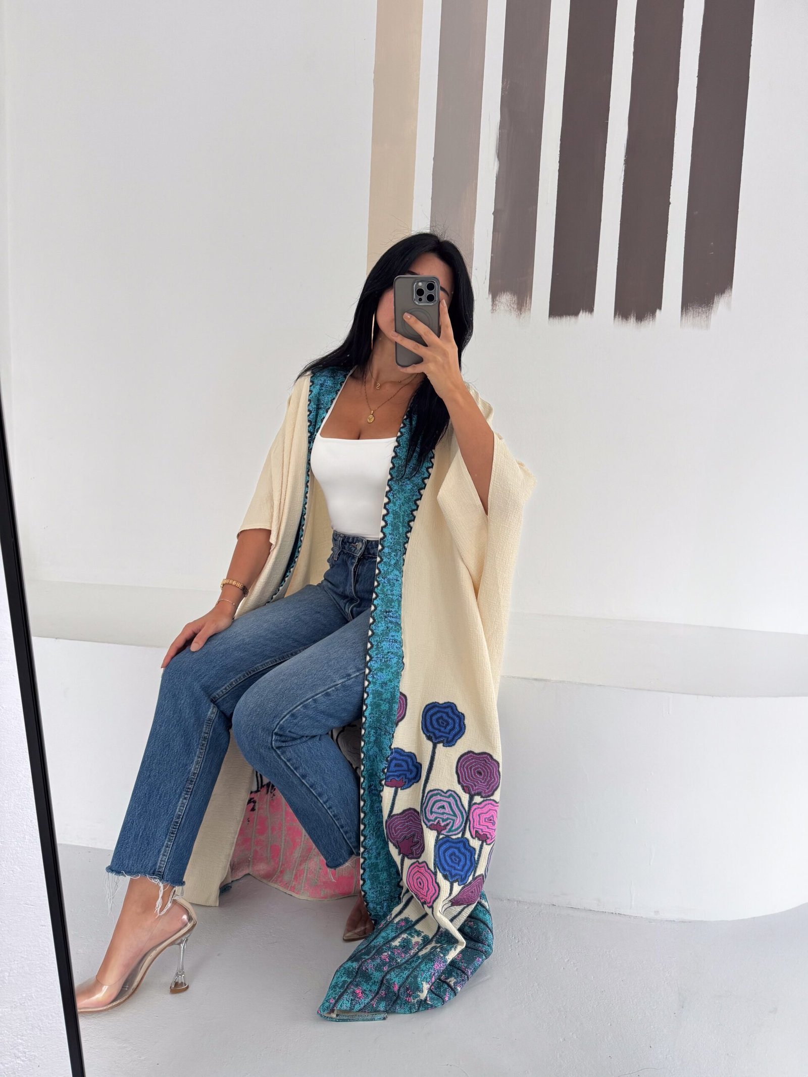 A statement open abaya inspired by blooming gardens and artistic florals. Designed in a soft cream base with vibrant embroidered flowers and a striking turquoise front trim. Lightweight, flowy and effortlessly elegant — perfect for elevating everyday outfits or styling for special outings.