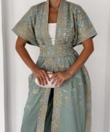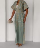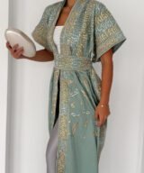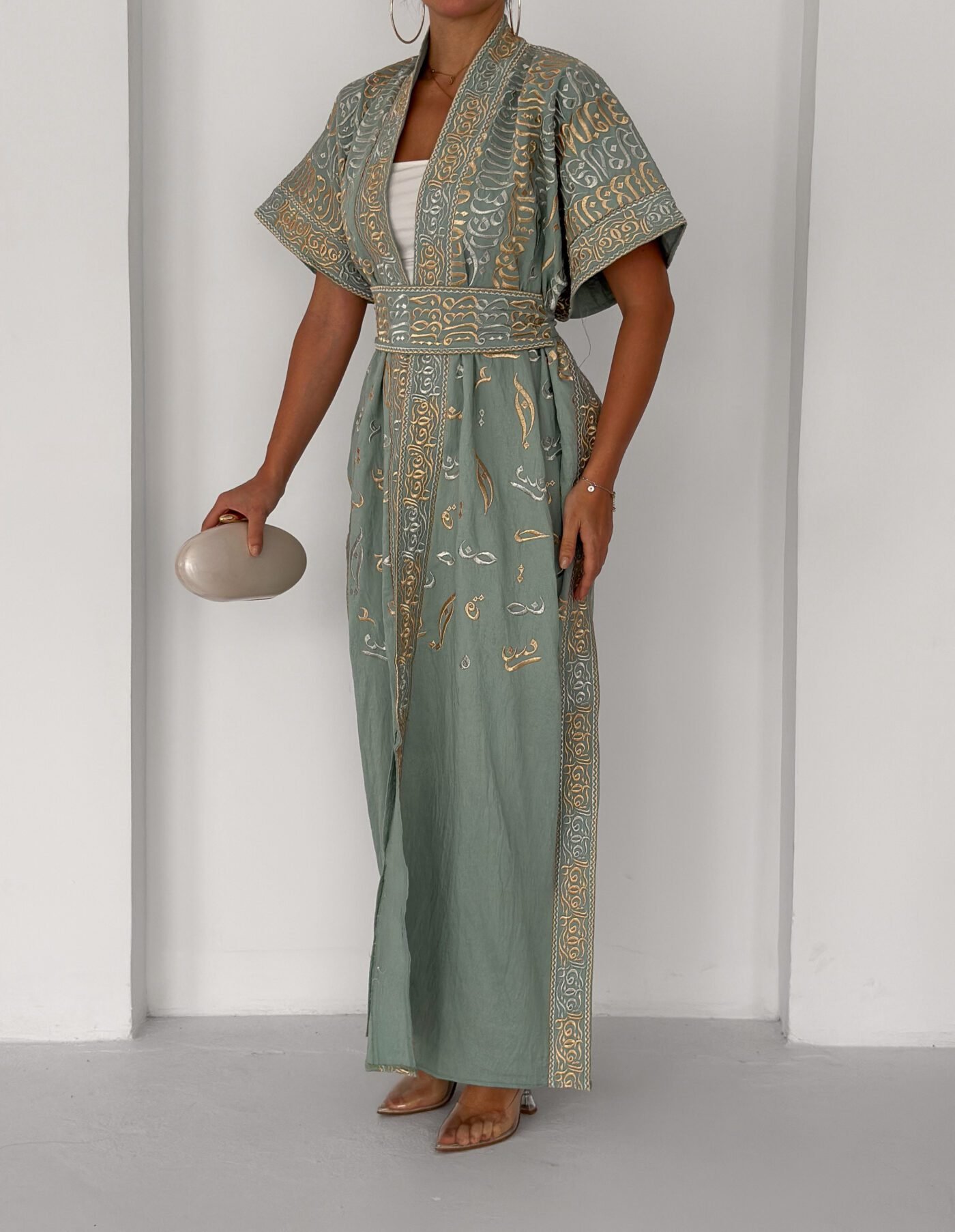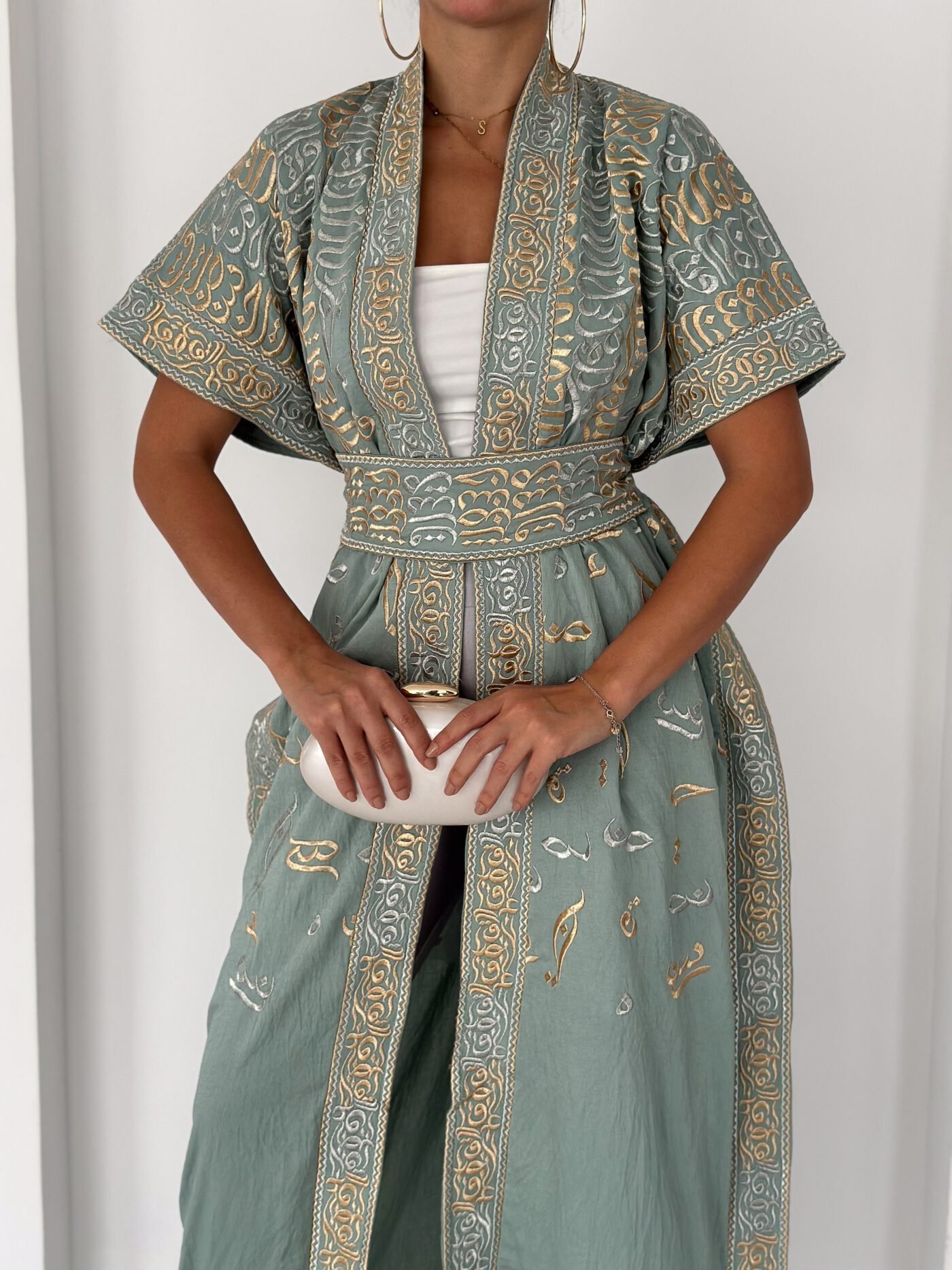 A luxurious sage green kaftan adorned with intricate Arabic-inspired gold and silver embroidery. Designed with elegant wide sleeves and a matching waist belt that beautifully defines the silhouette. The detailed embroidered borders and rich patterns create a refined, regal presence while maintaining a soft, feminine flow.