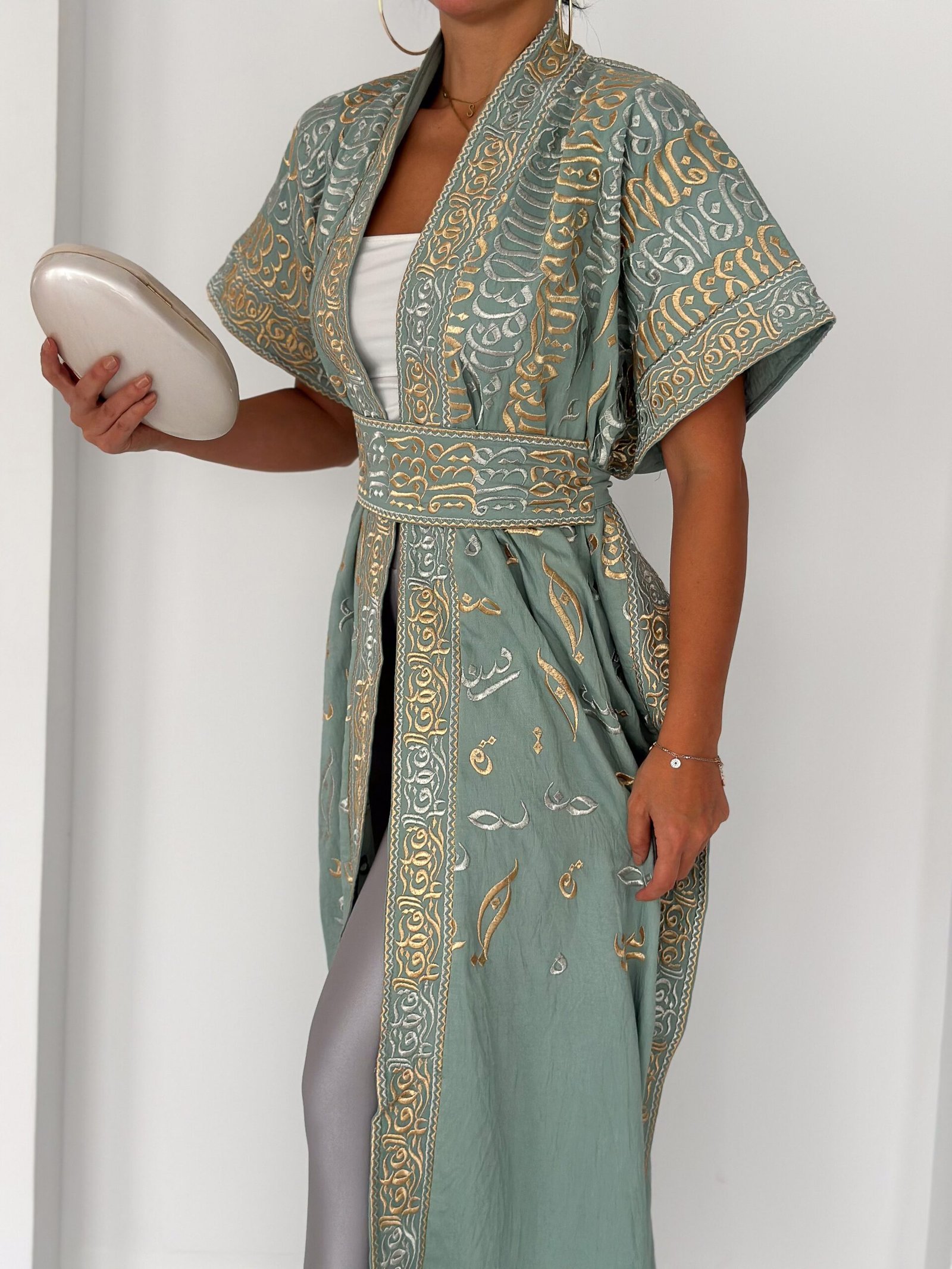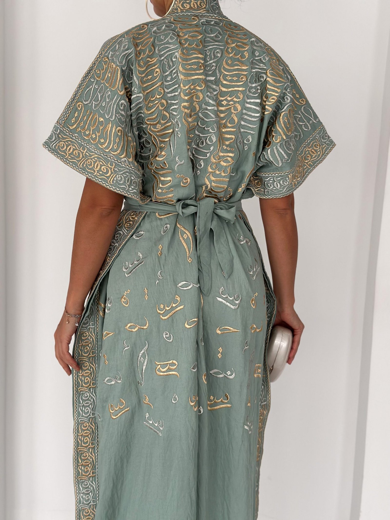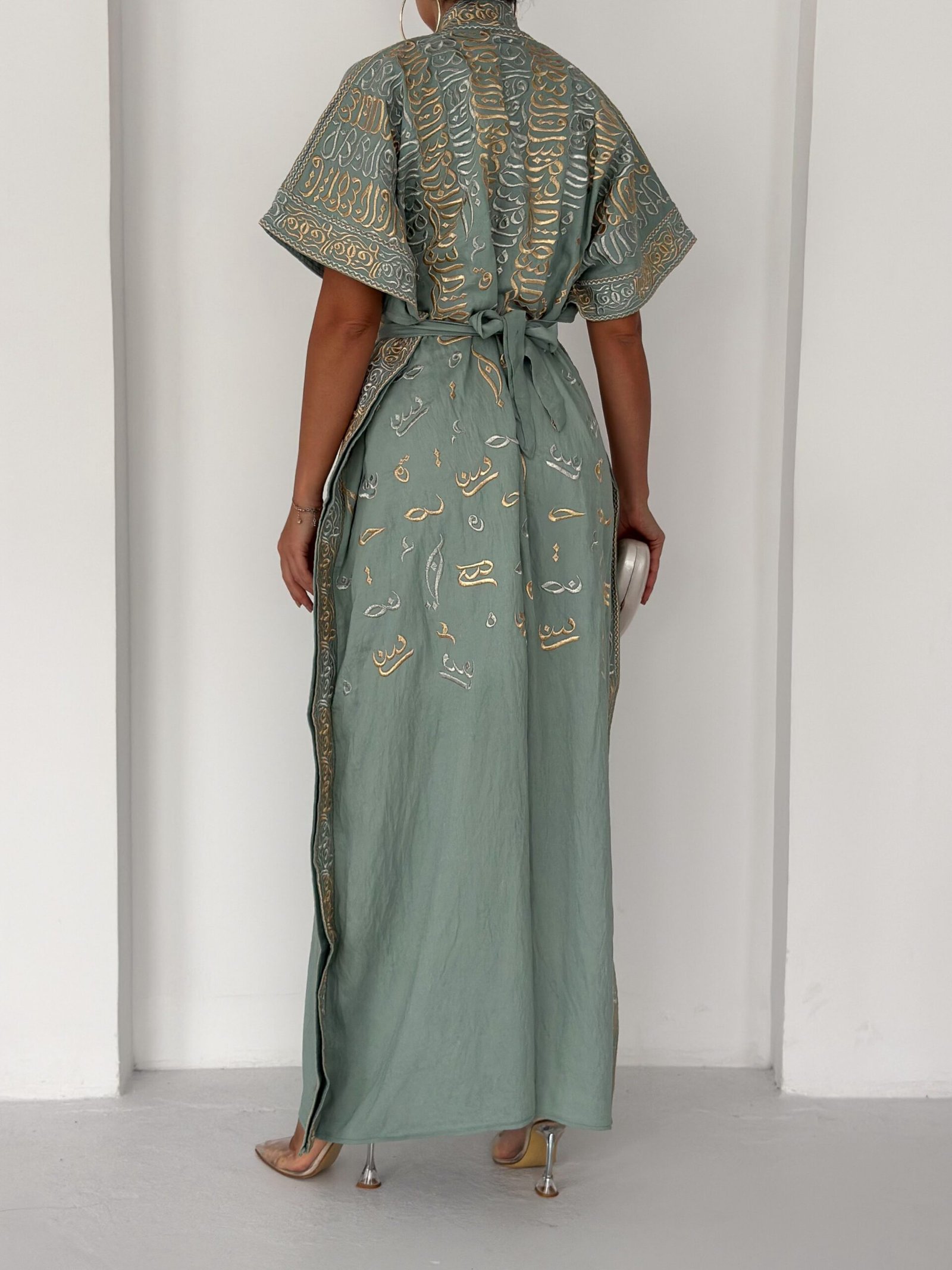 A luxurious sage green kaftan adorned with intricate Arabic-inspired gold and silver embroidery. Designed with elegant wide sleeves and a matching waist belt that beautifully defines the silhouette. The detailed embroidered borders and rich patterns create a refined, regal presence while maintaining a soft, feminine flow.