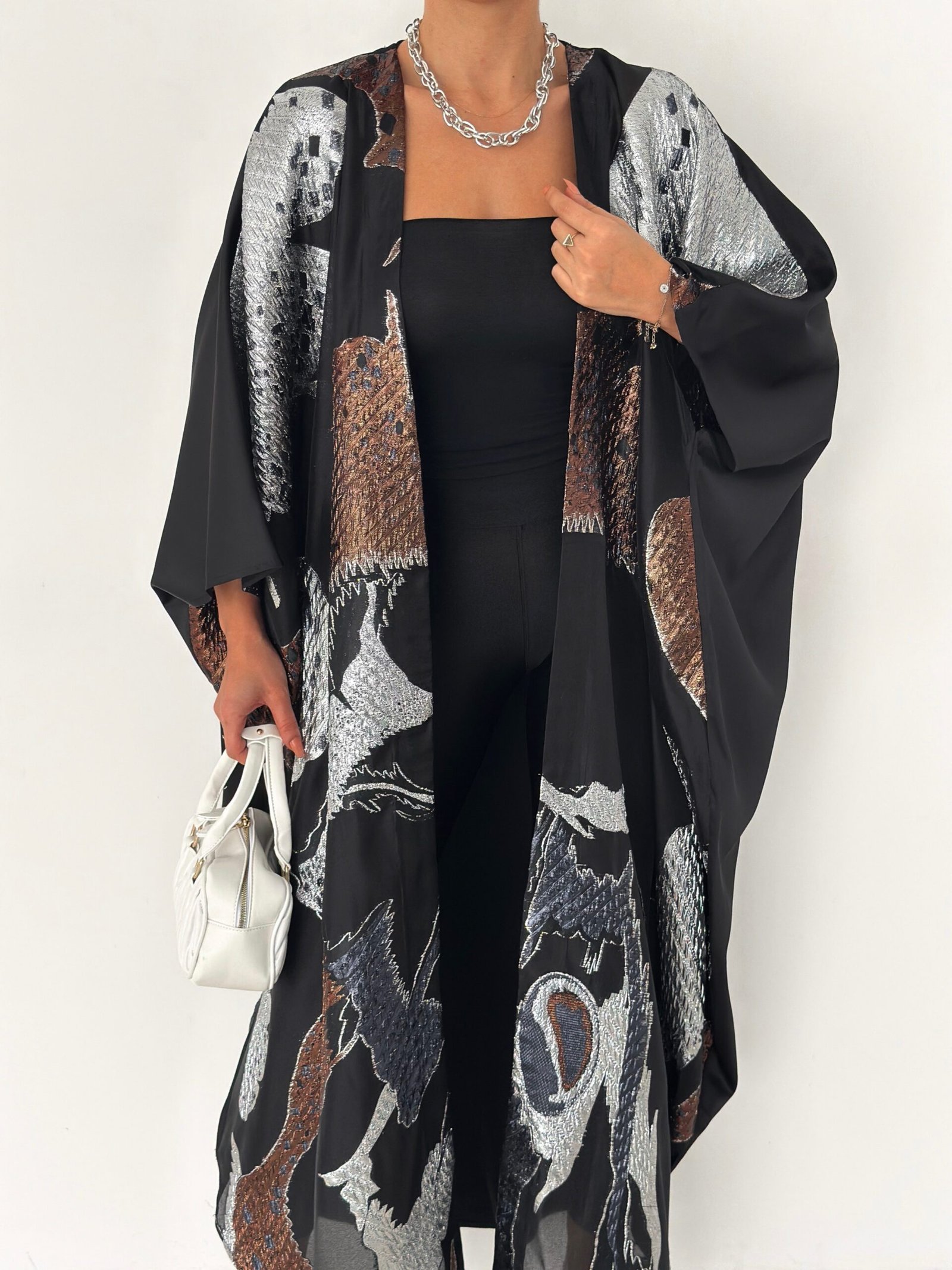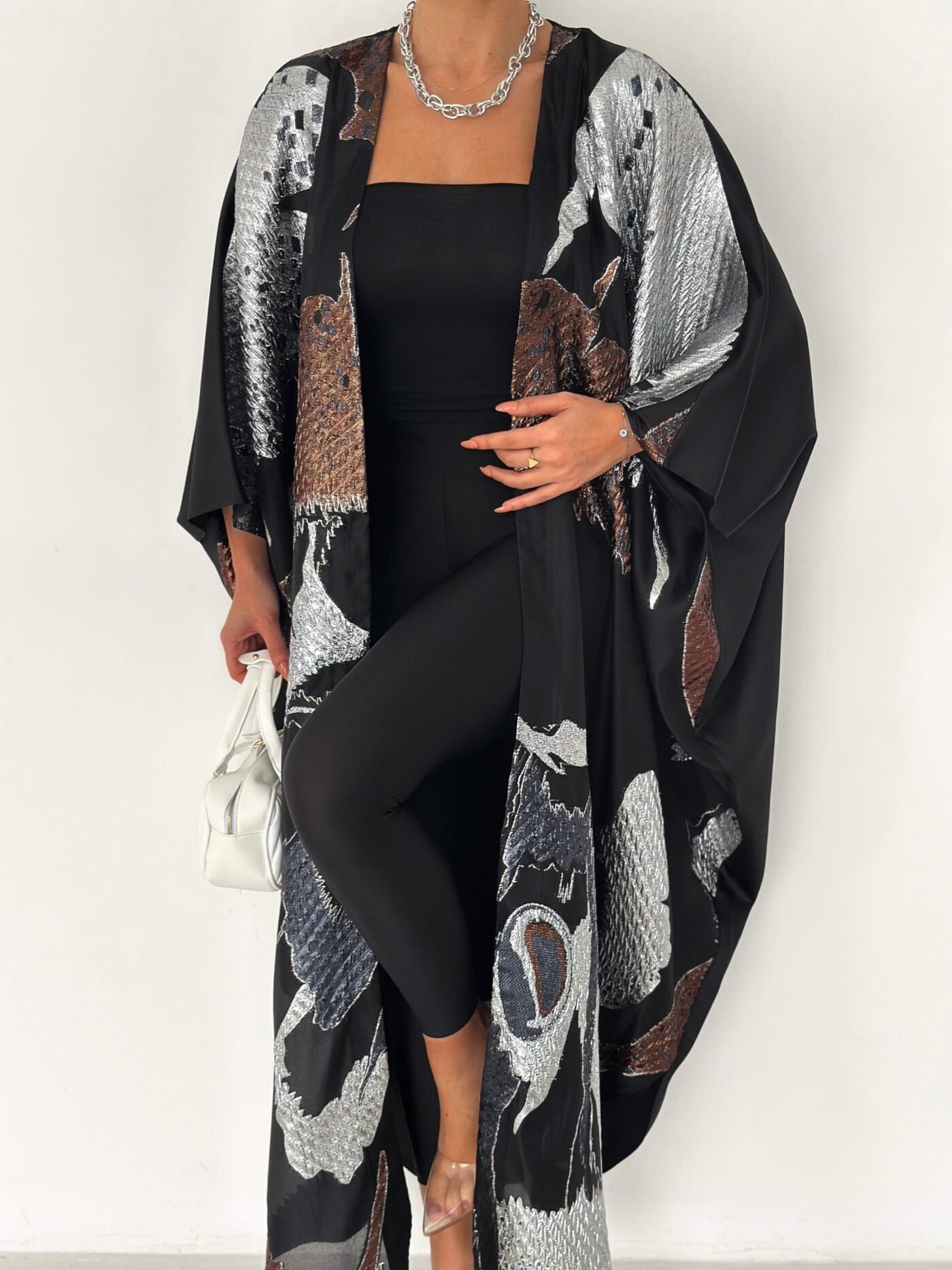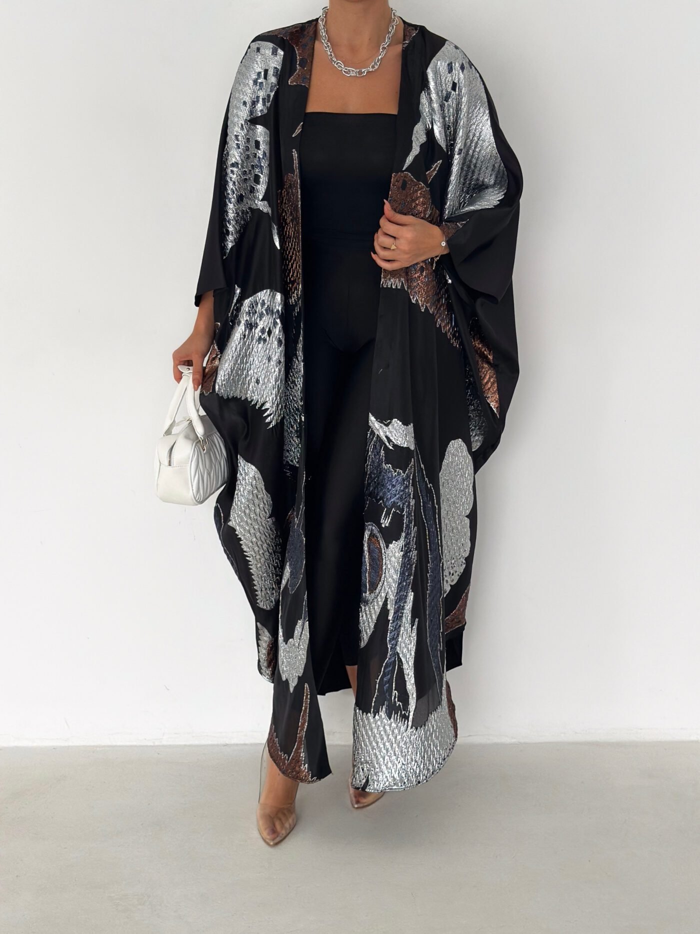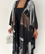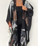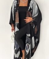Inspired by calm Ramadan nights, this abaya features luminous silver tones over a deep black base, creating a graceful and polished silhouette.