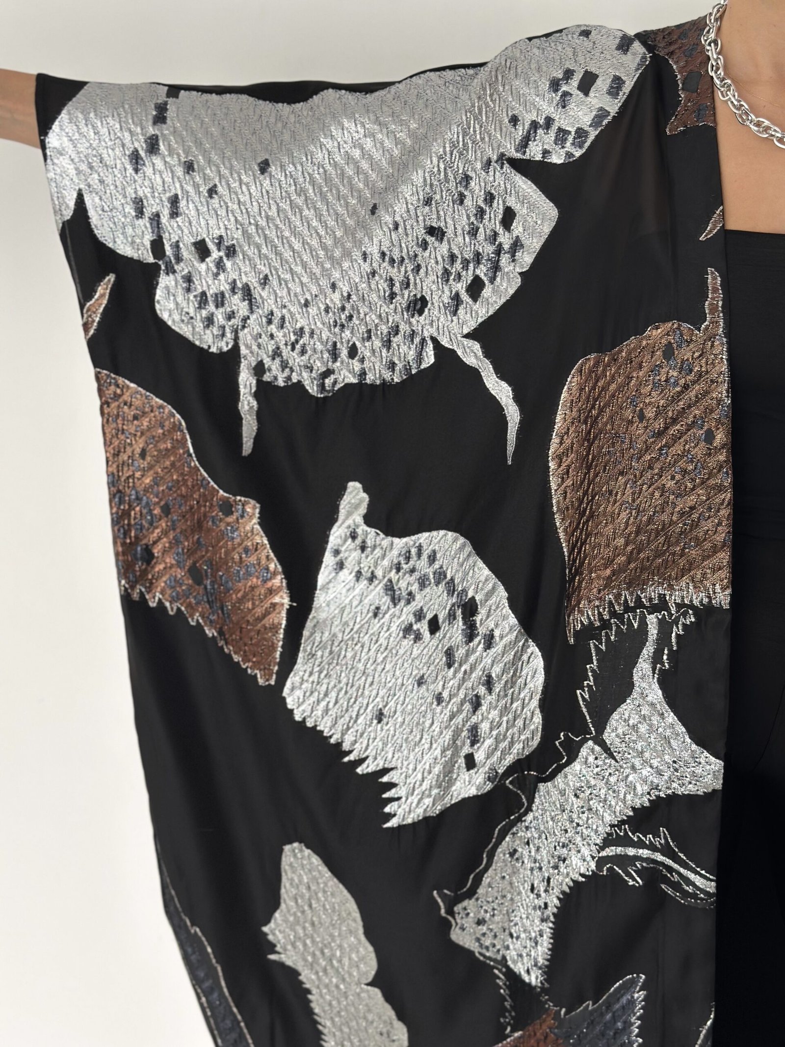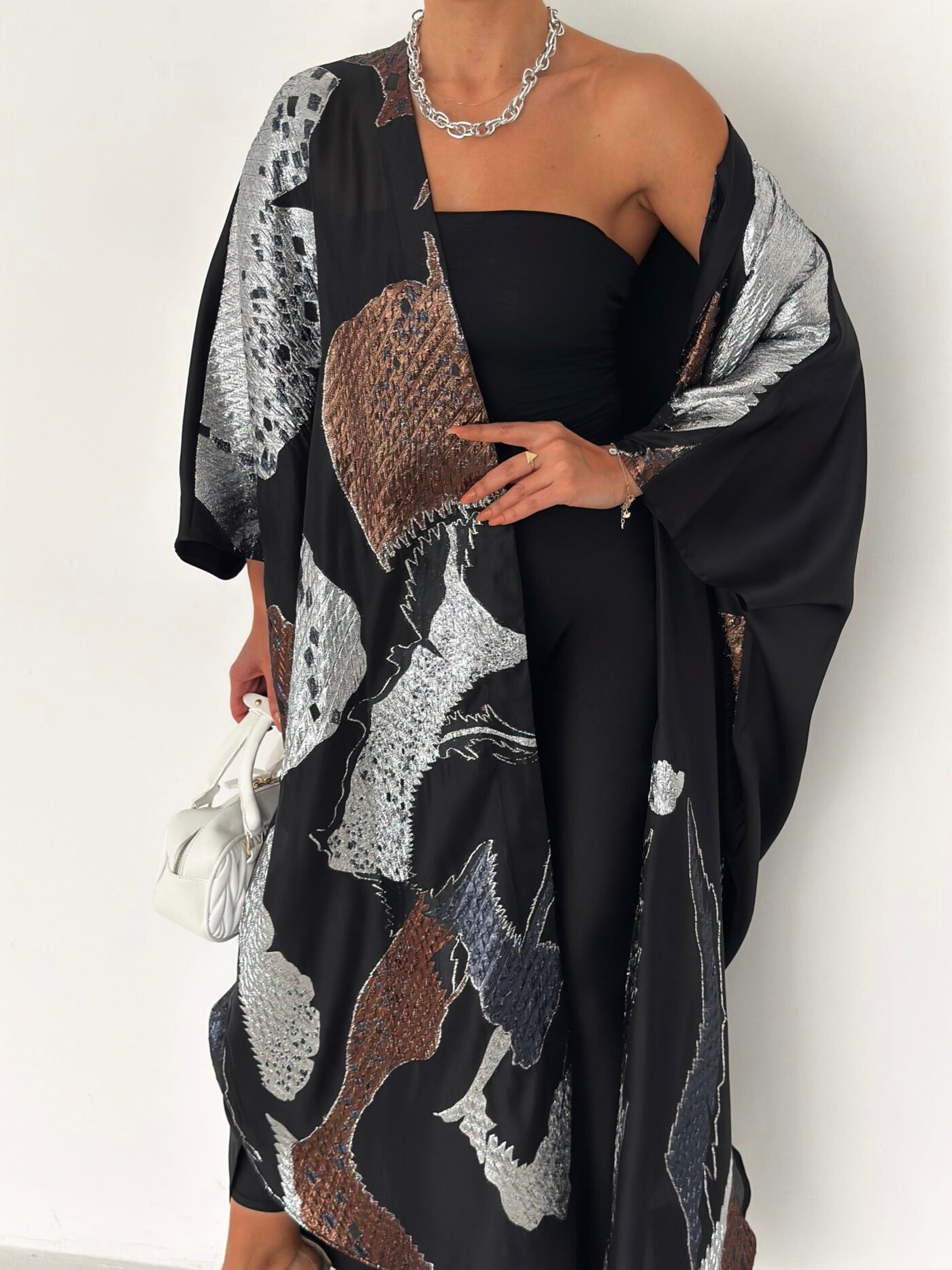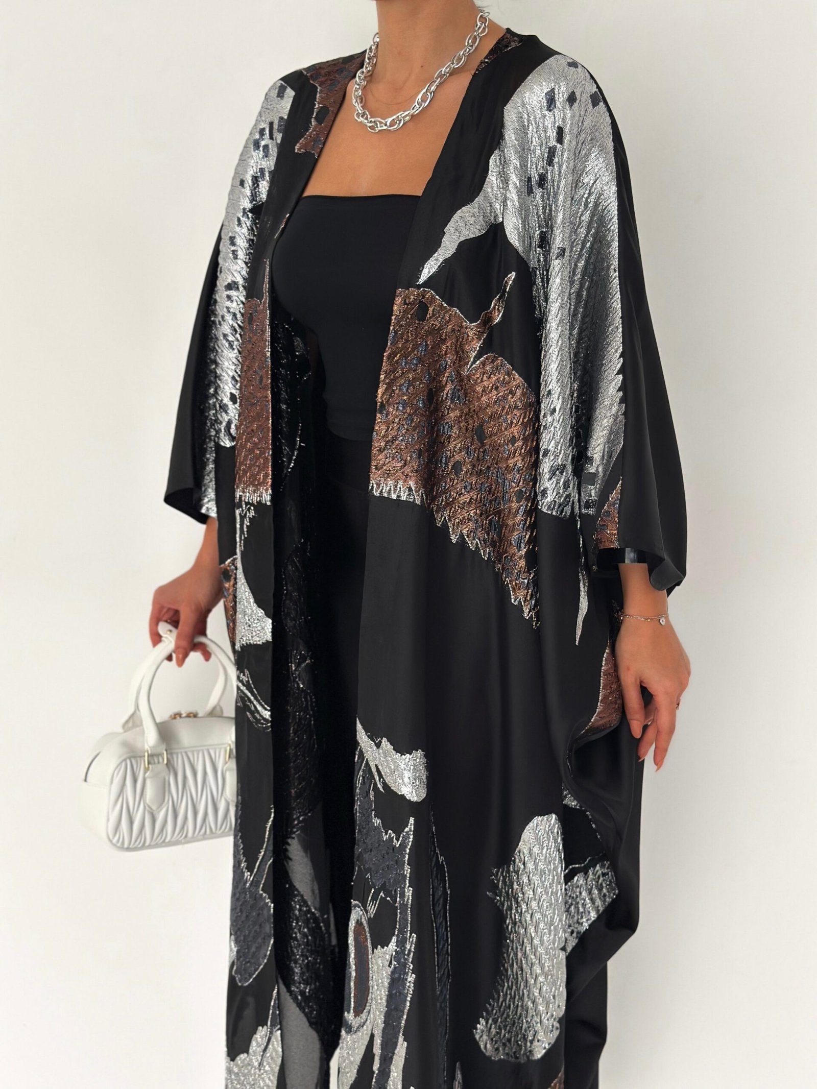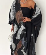 Inspired by calm Ramadan nights, this abaya features luminous silver tones over a deep black base, creating a graceful and polished silhouette.