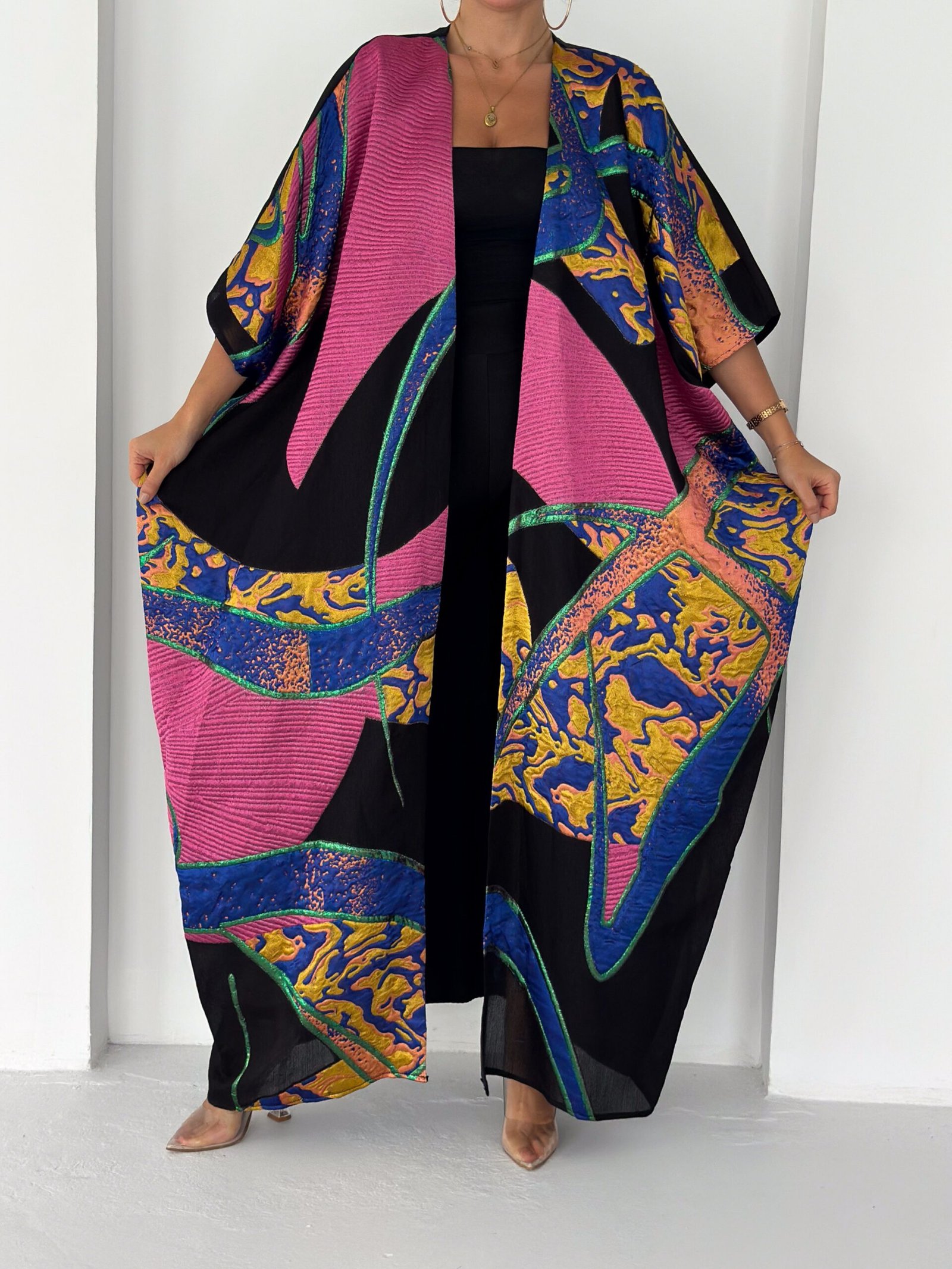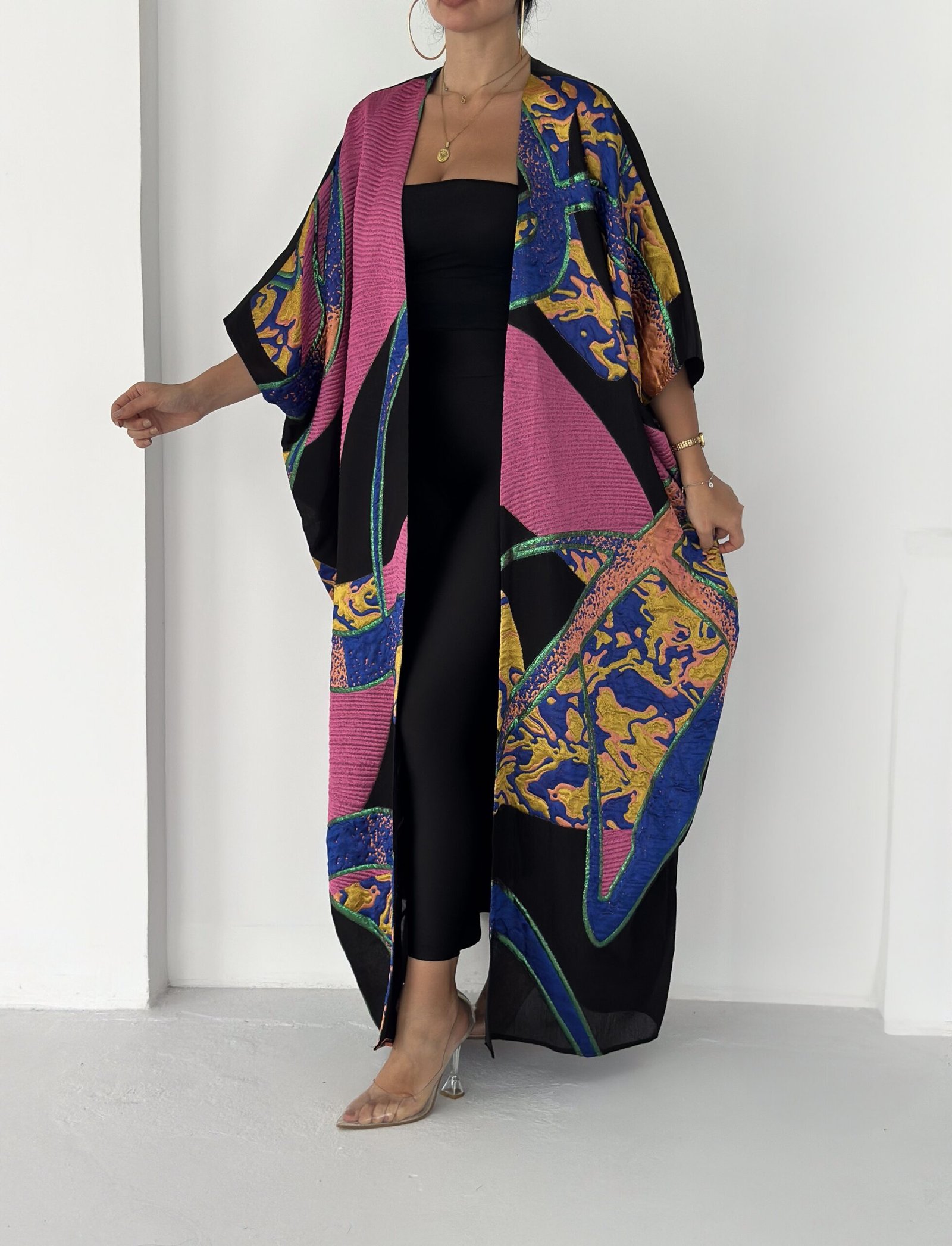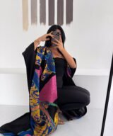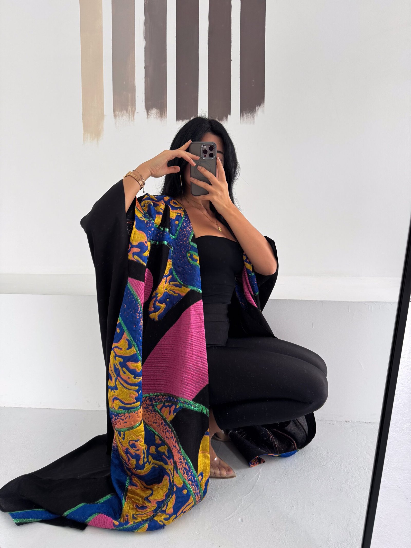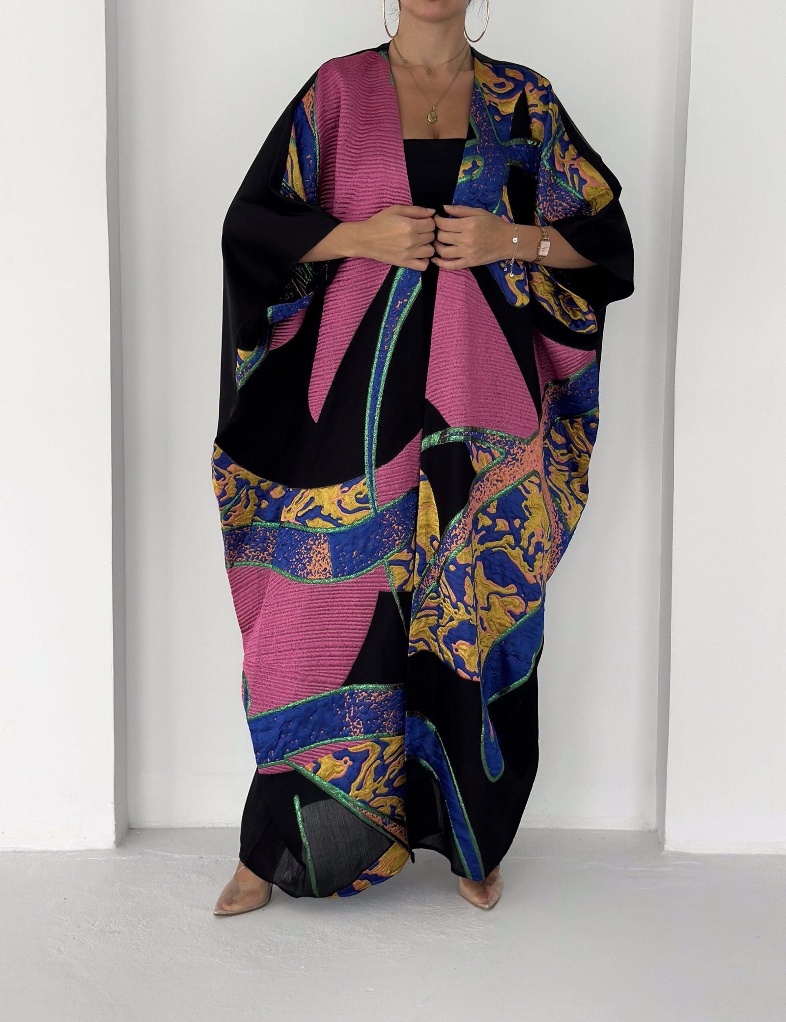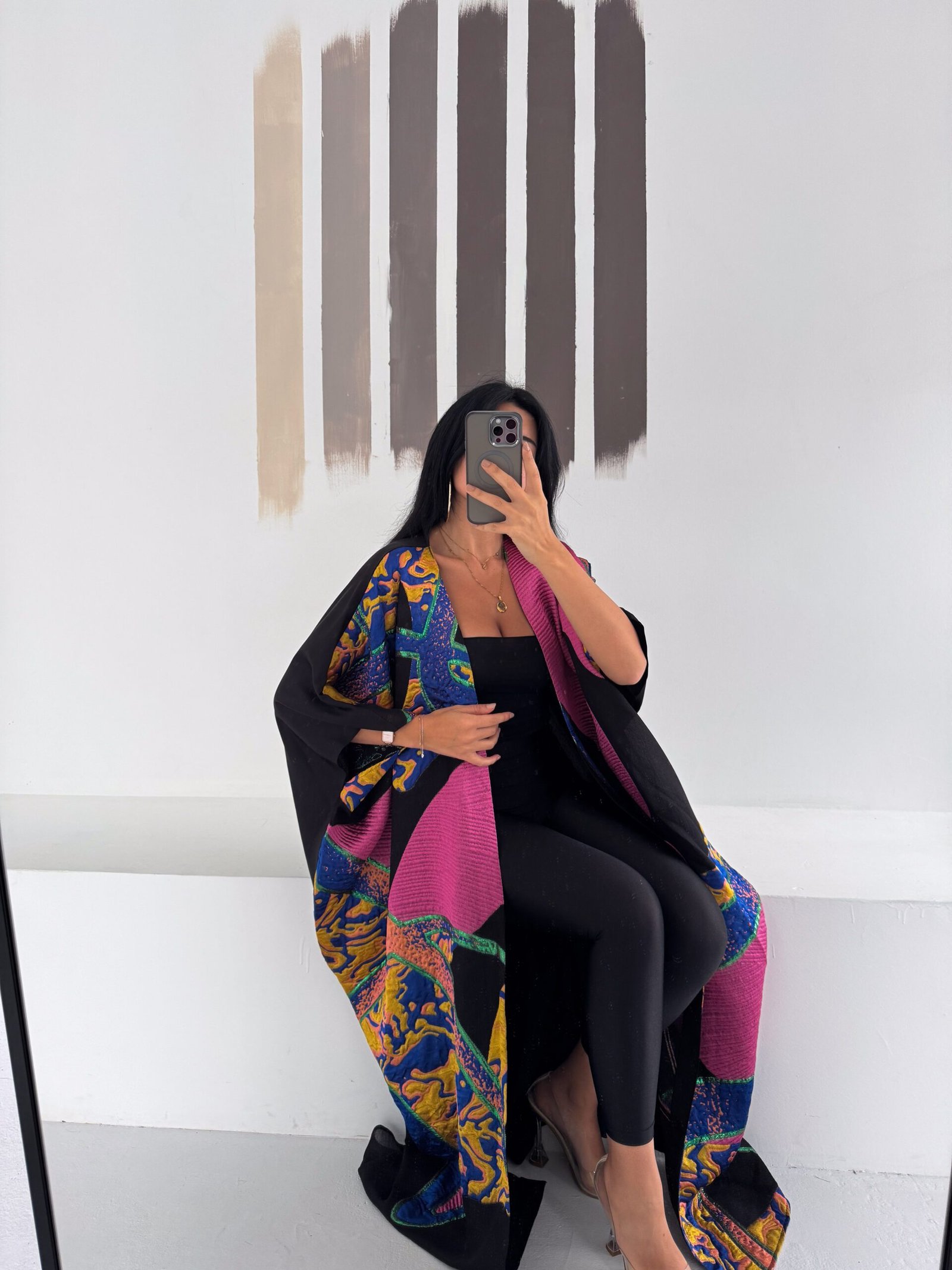 An elegant statement abaya inspired by the warm colors of a desert sunset. Designed on a soft black base with vibrant artistic patterns that blend beautifully to create a bold yet sophisticated look. Lightweight, flowy and perfect for elevating both daytime and evening outfits.