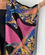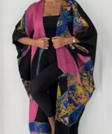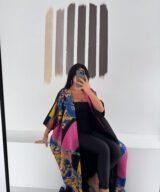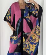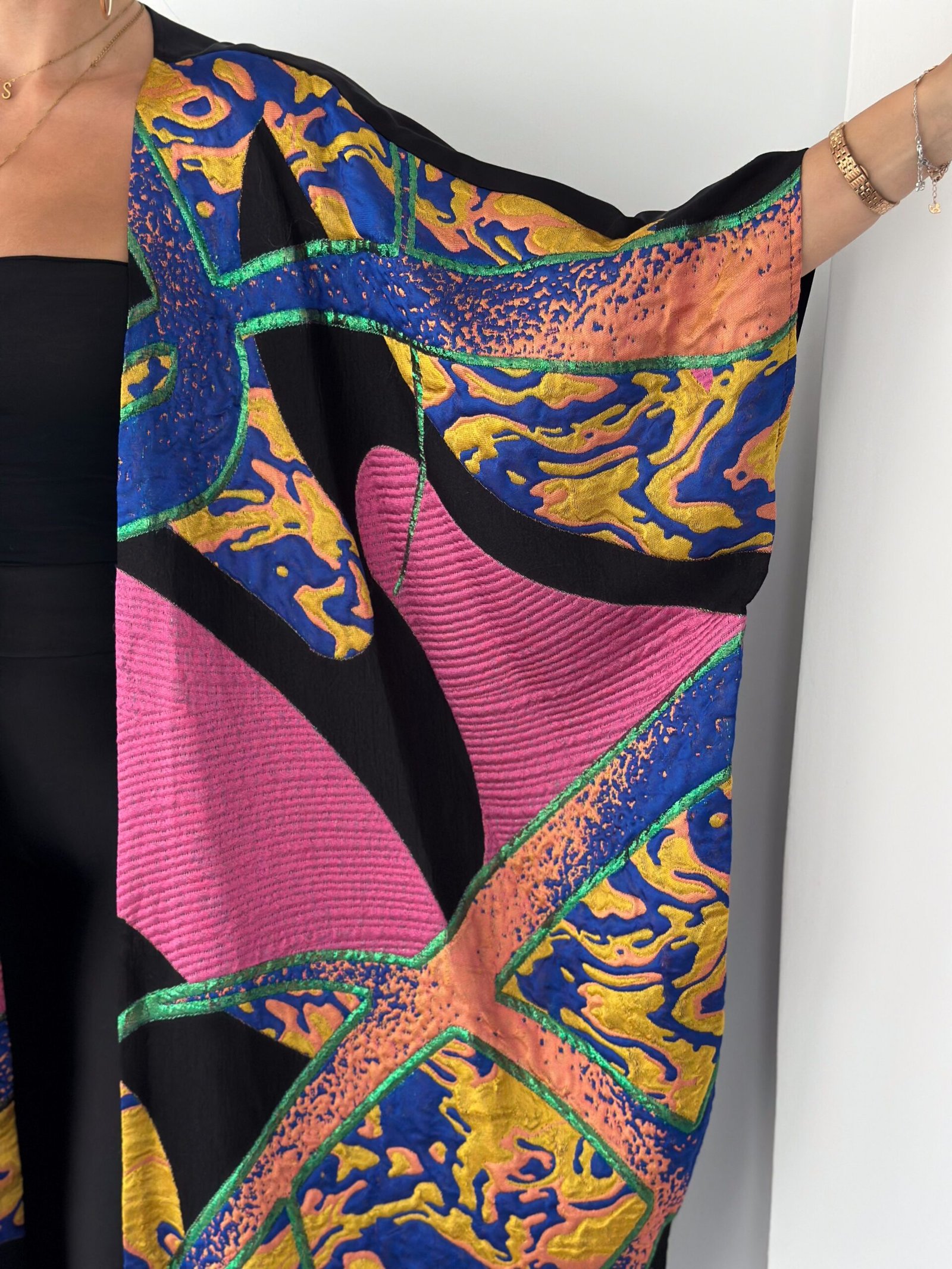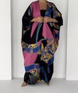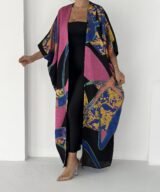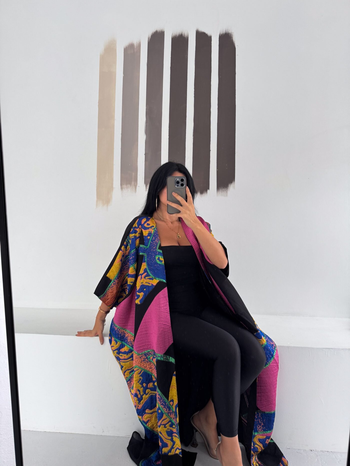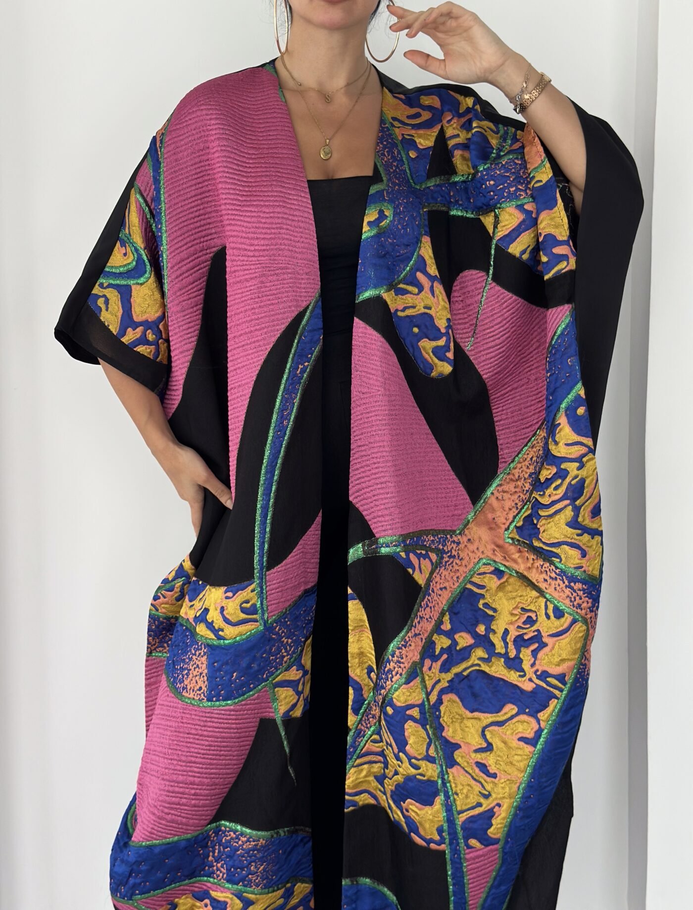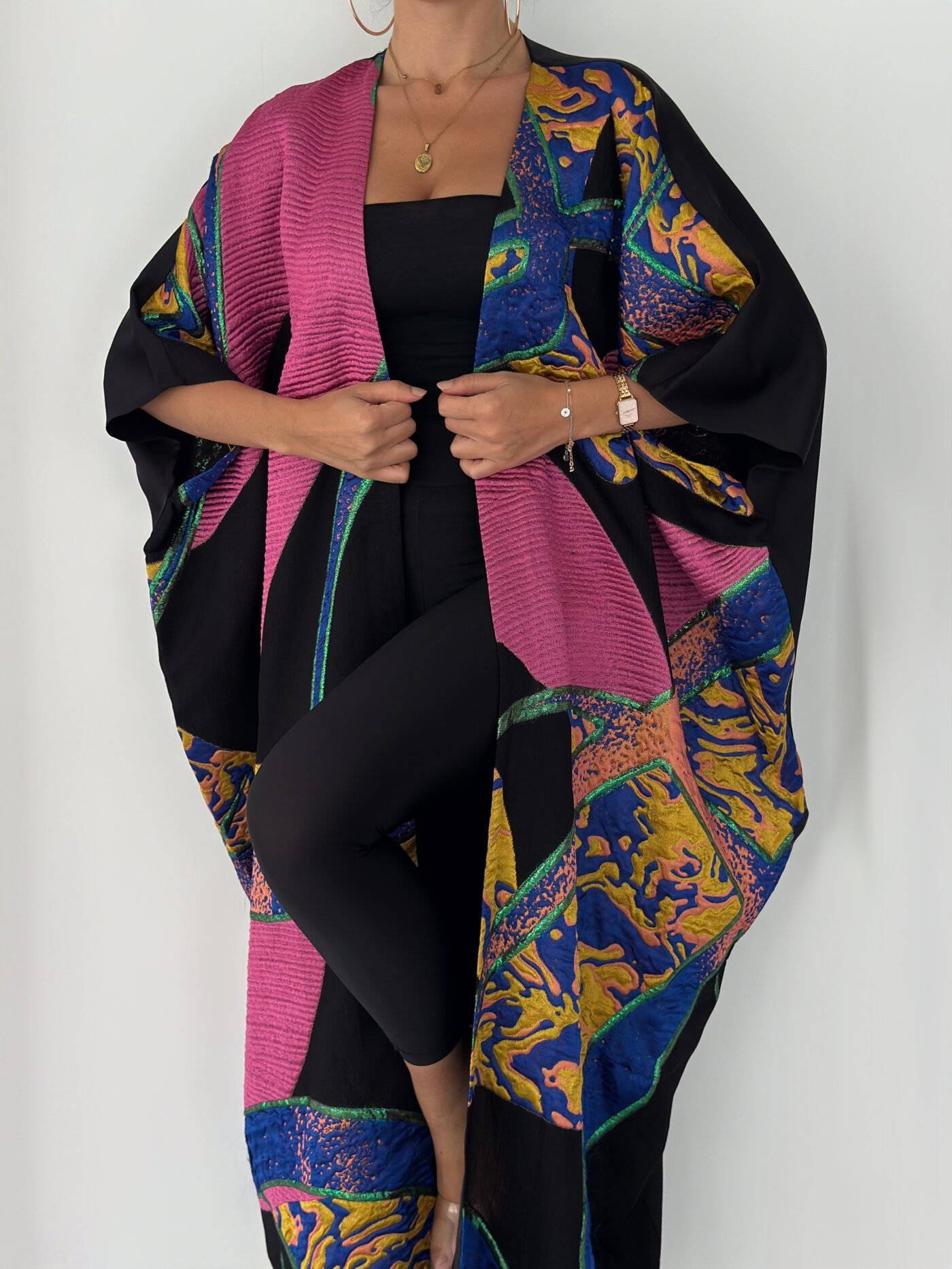 An elegant statement abaya inspired by the warm colors of a desert sunset. Designed on a soft black base with vibrant artistic patterns that blend beautifully to create a bold yet sophisticated look. Lightweight, flowy and perfect for elevating both daytime and evening outfits.
