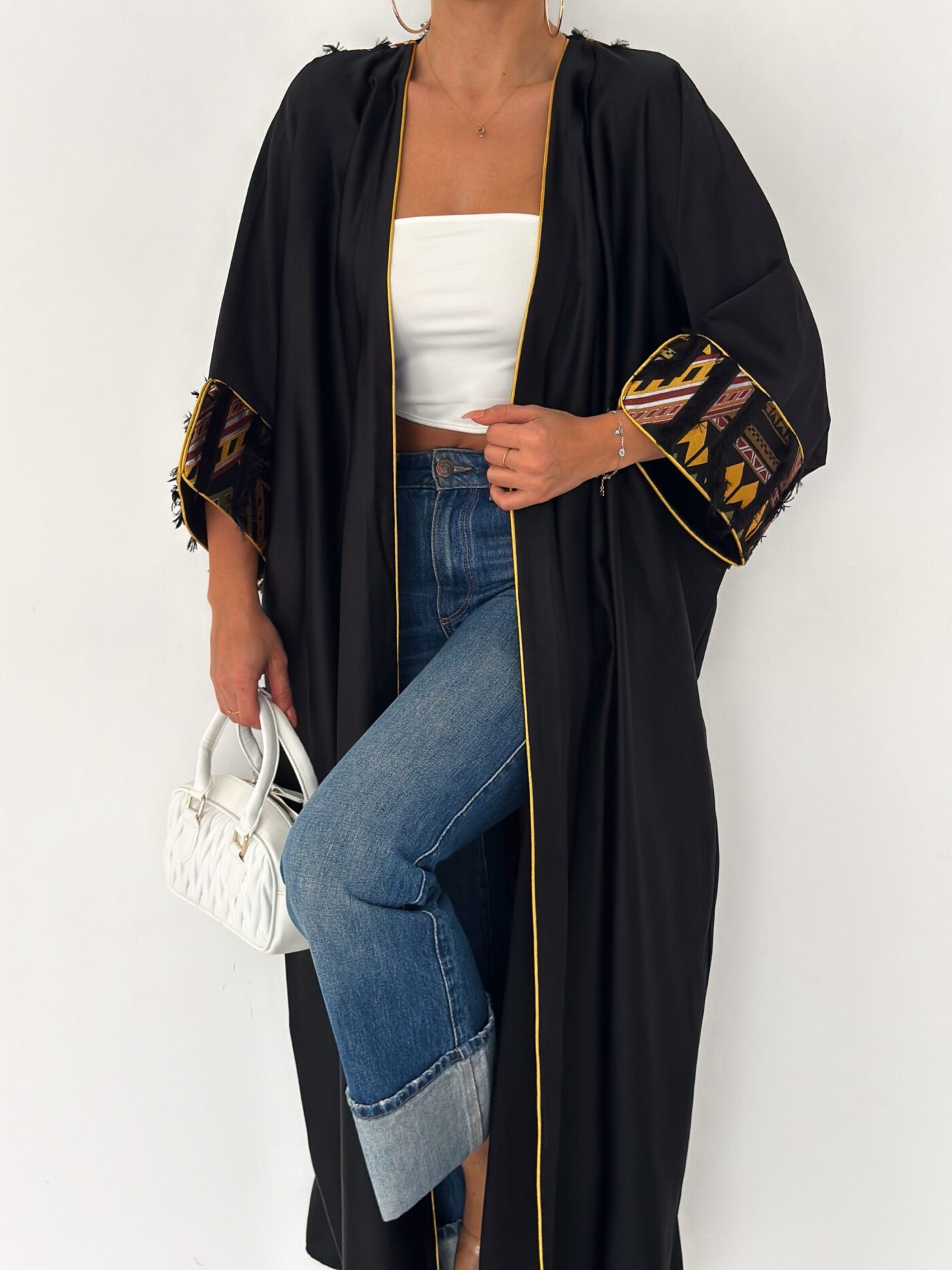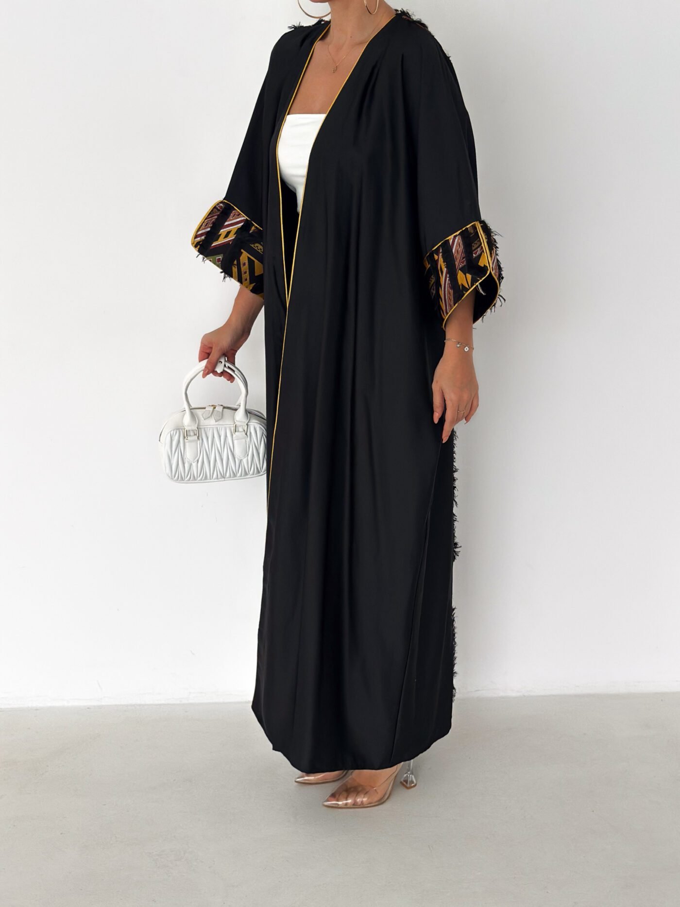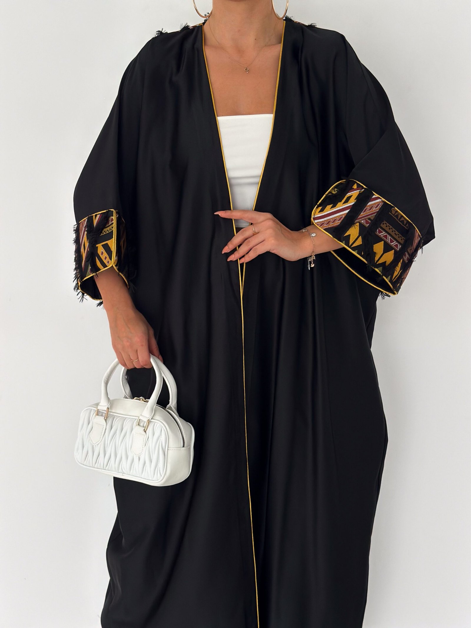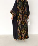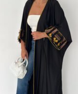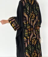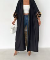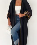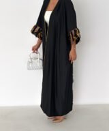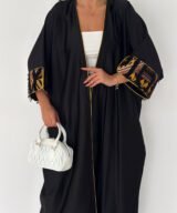 A modern black abaya designed with a relaxed, flowing silhouette and subtle golden piping that frames the look beautifully.