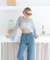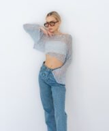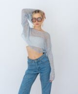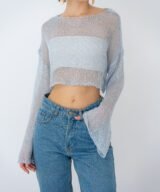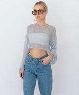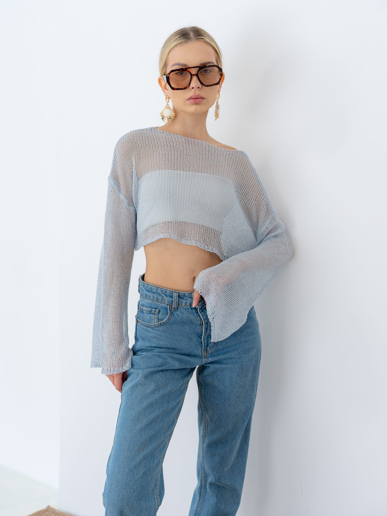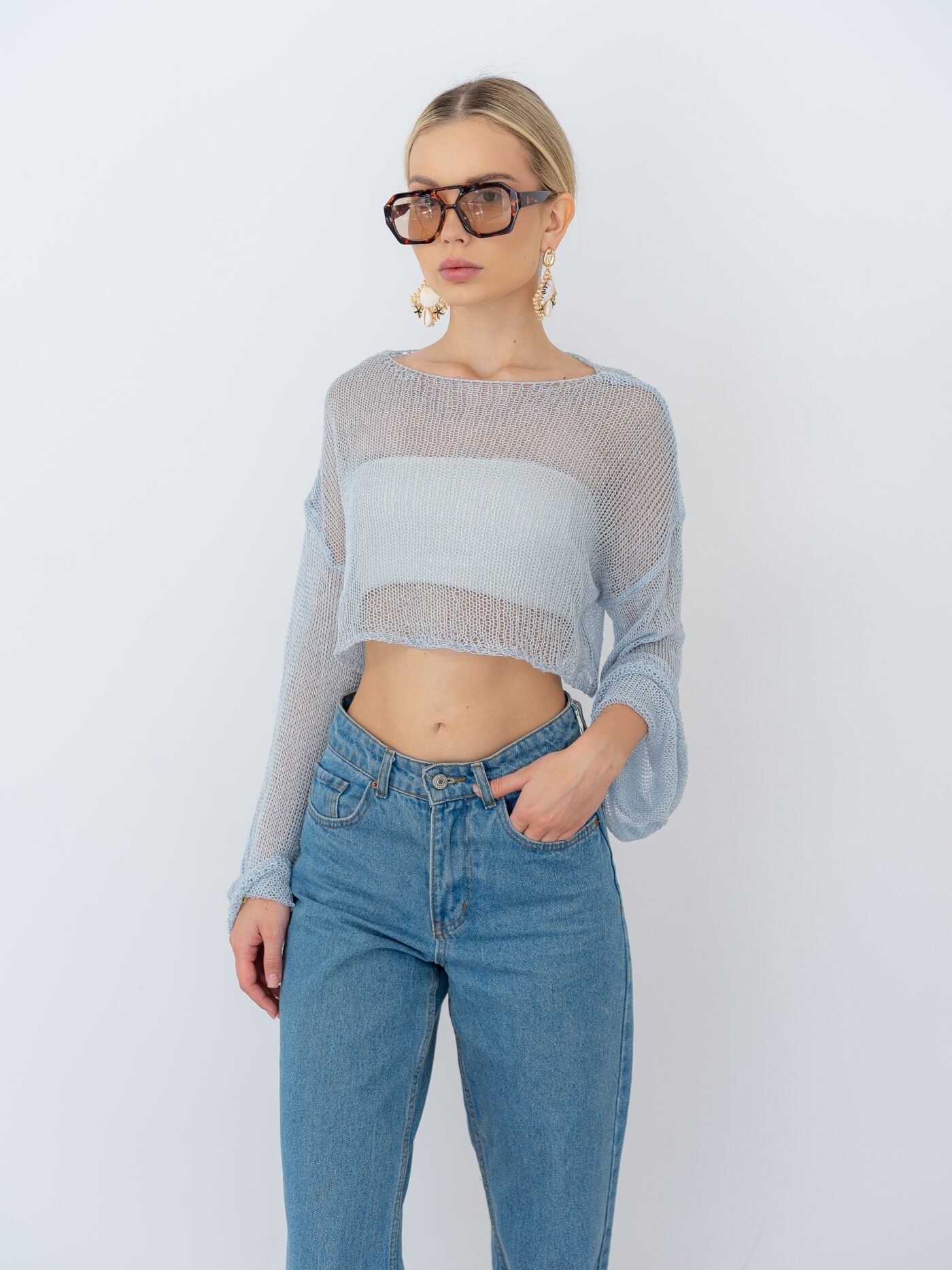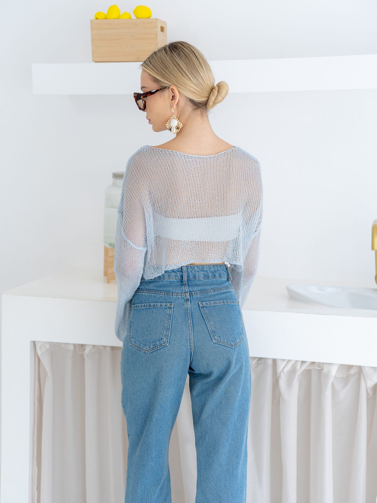 A lightweight sheer knit crop sweater in light blue. Stylish and versatile for a bold, modern outfit.
