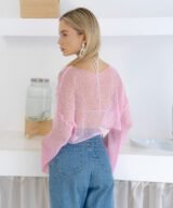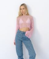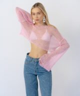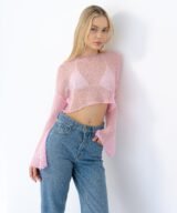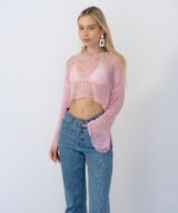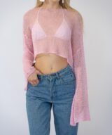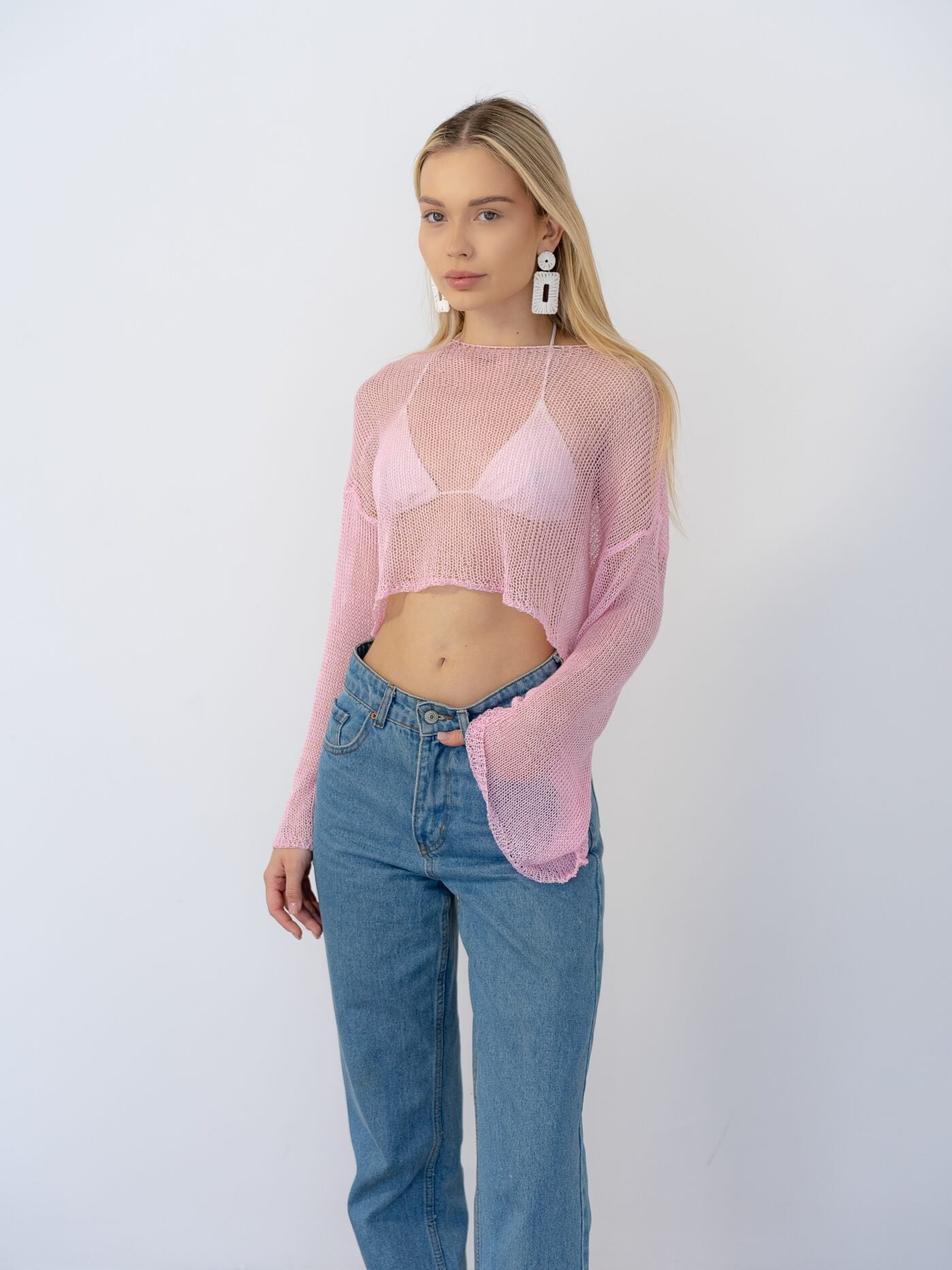 A trendy sheer knit crop sweater in soft pink. Perfect for layering over a bralette or bikini for a chic casual look.