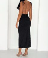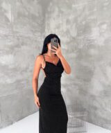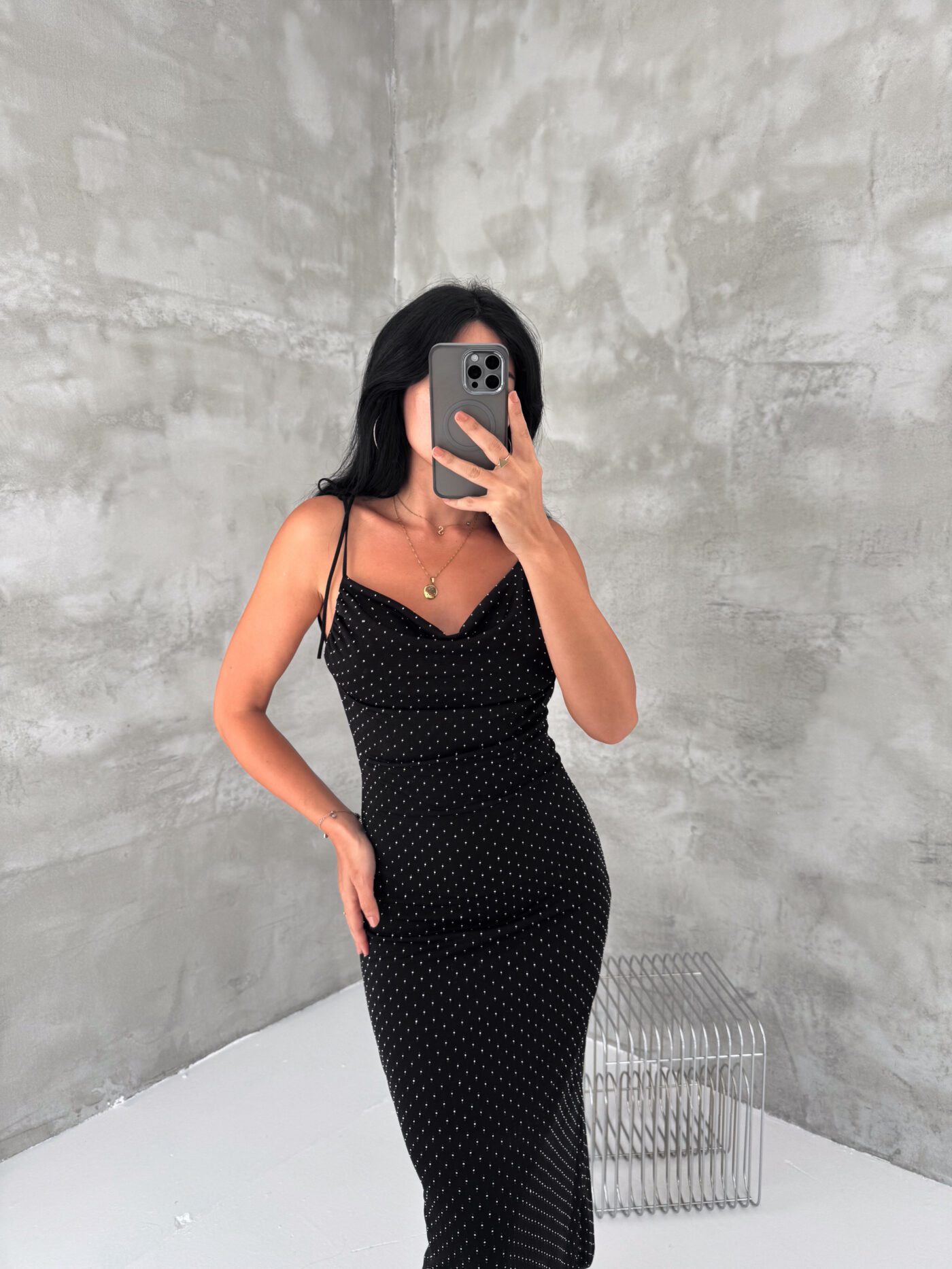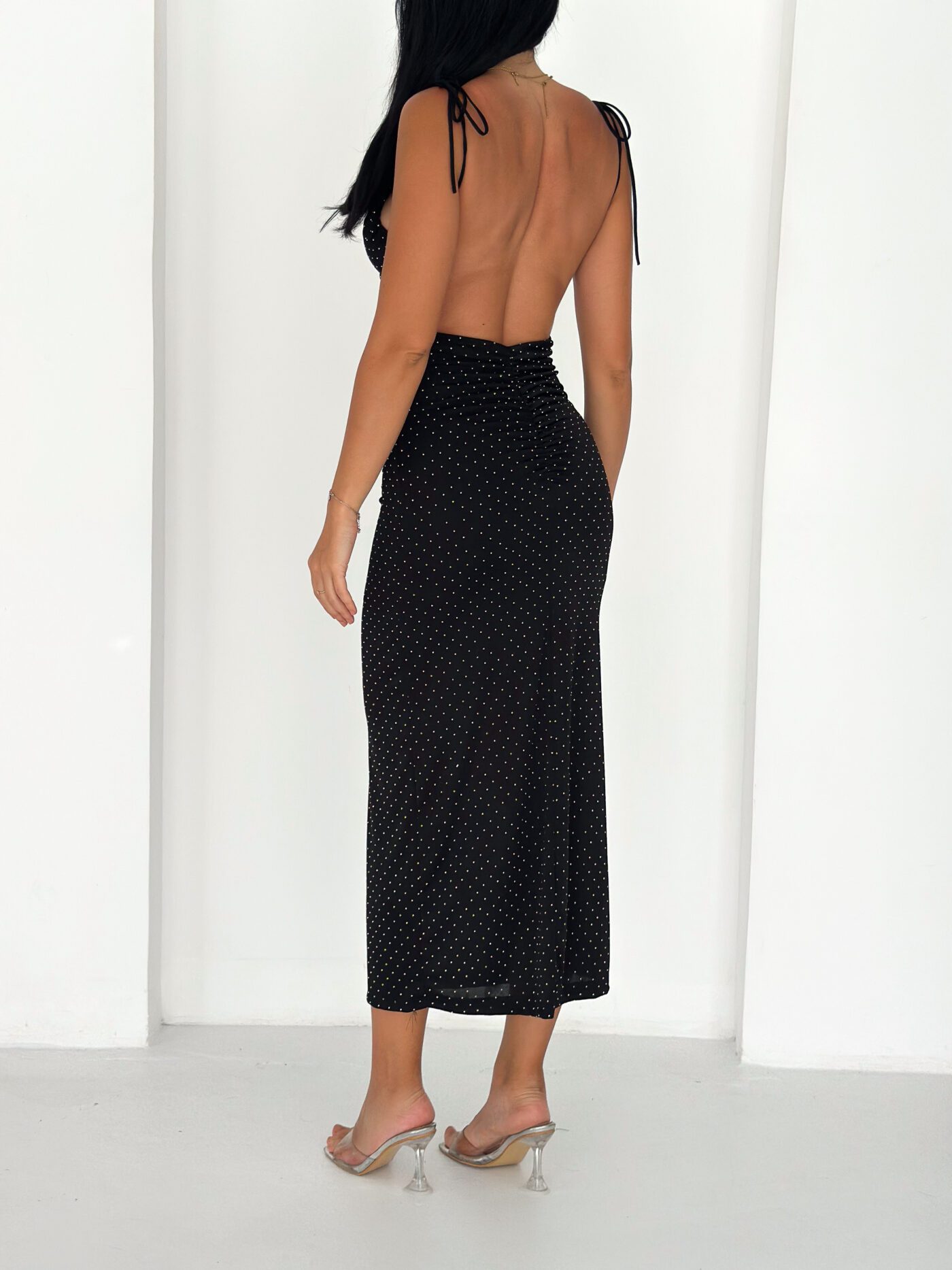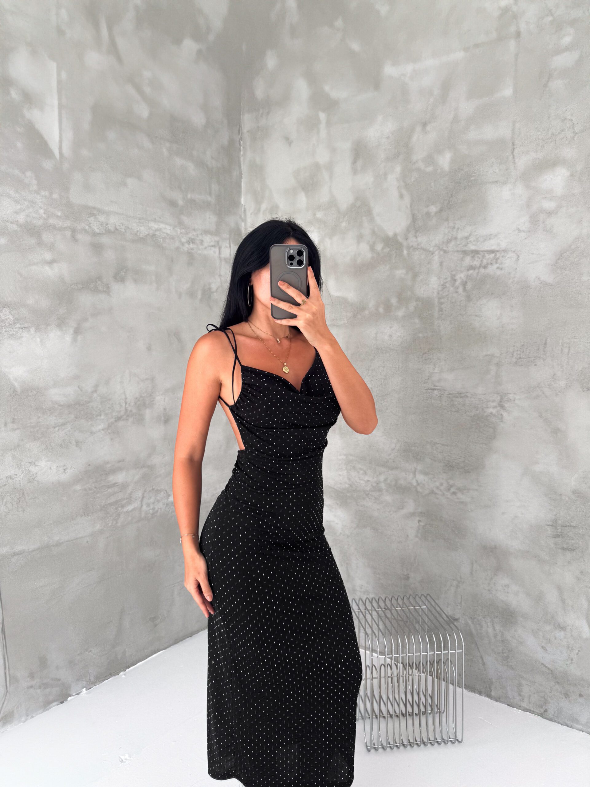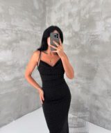 An elegant satin midi dress designed with delicate silver dotted details that create a soft shimmer. The dress features thin shoulder straps and a flattering fitted silhouette that beautifully enhances the body shape. Perfect for evening outings, dinners, or special occasions when you want a simple yet sophisticated look.