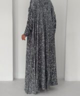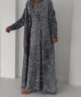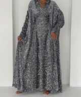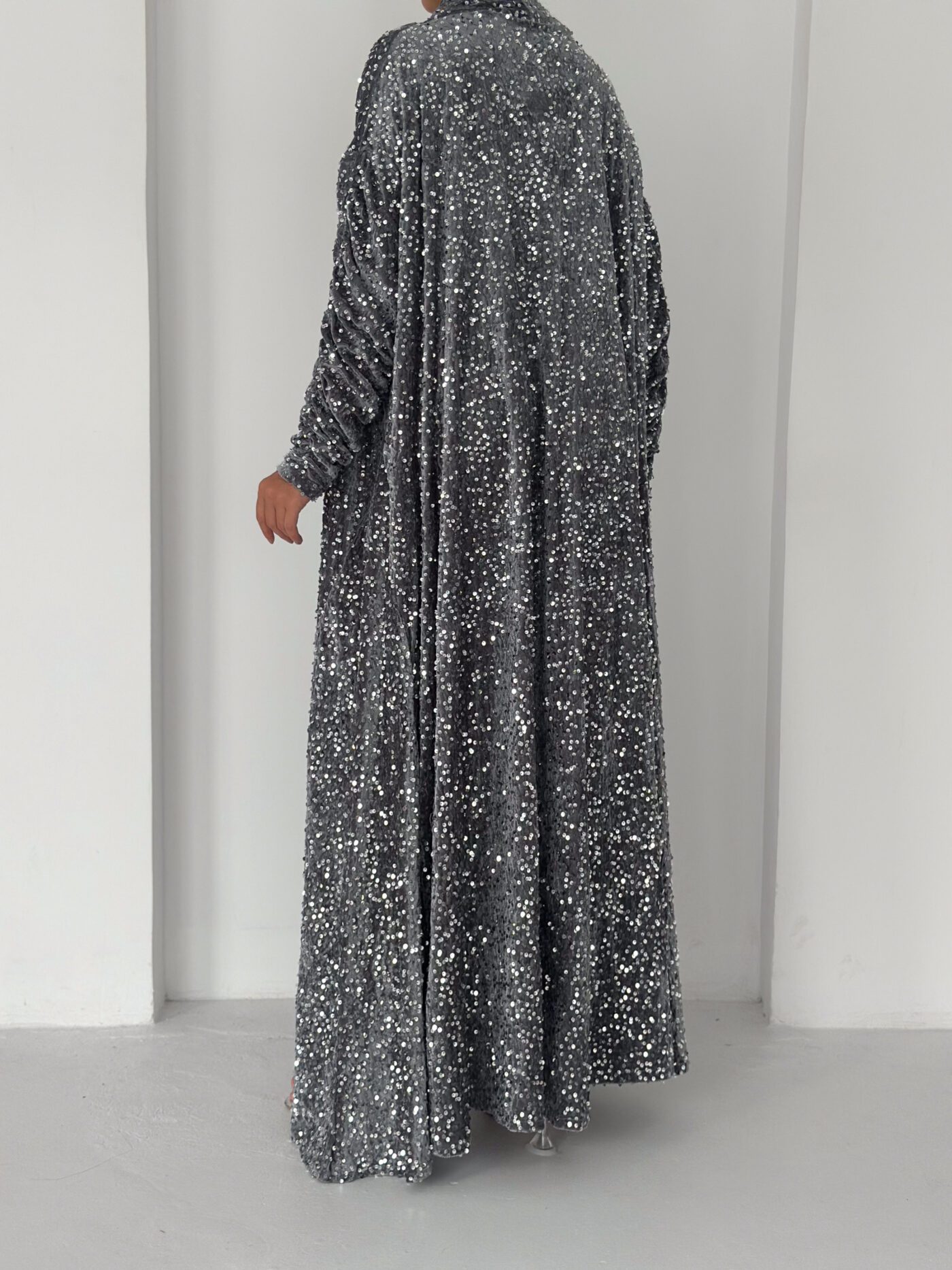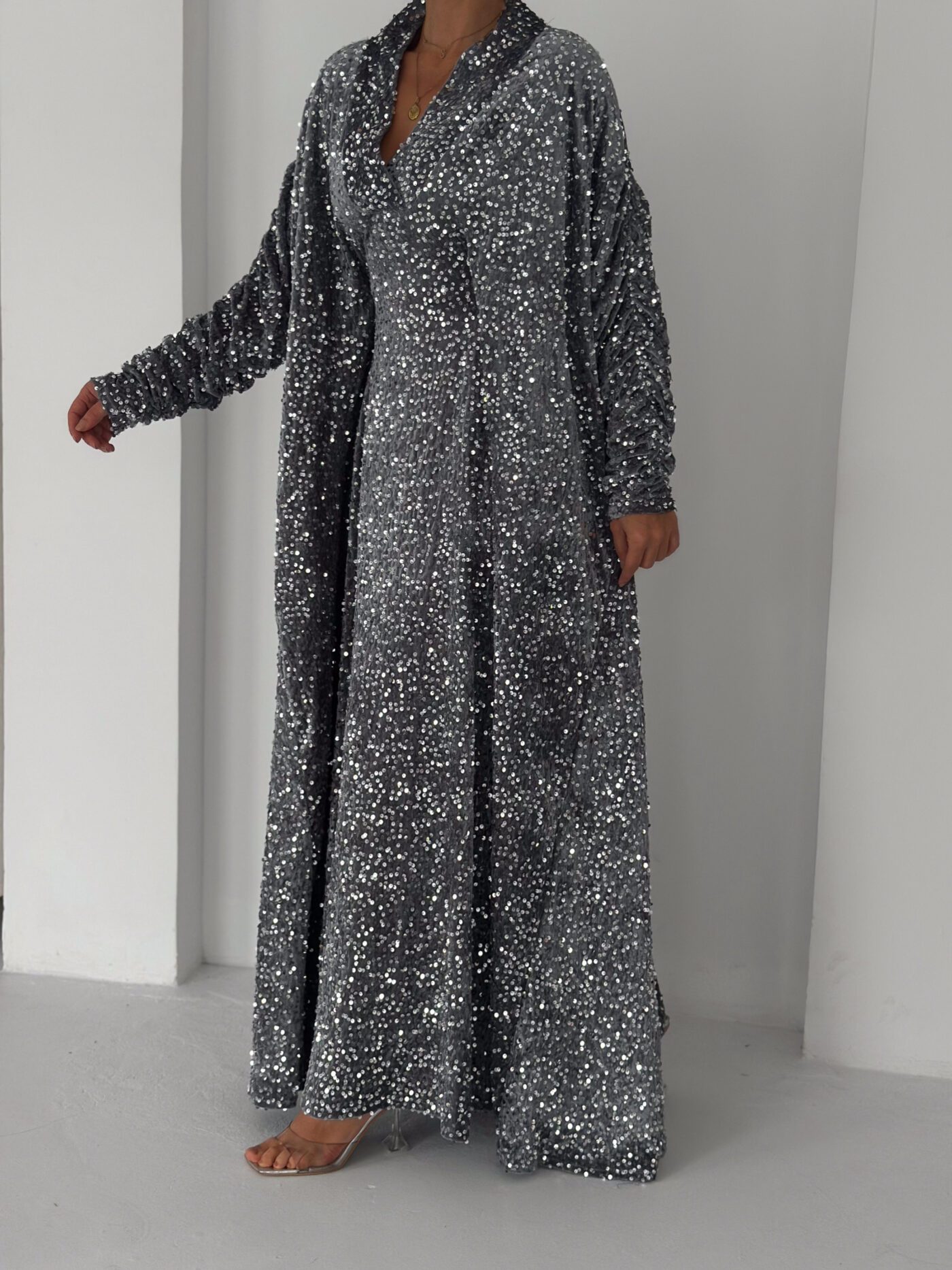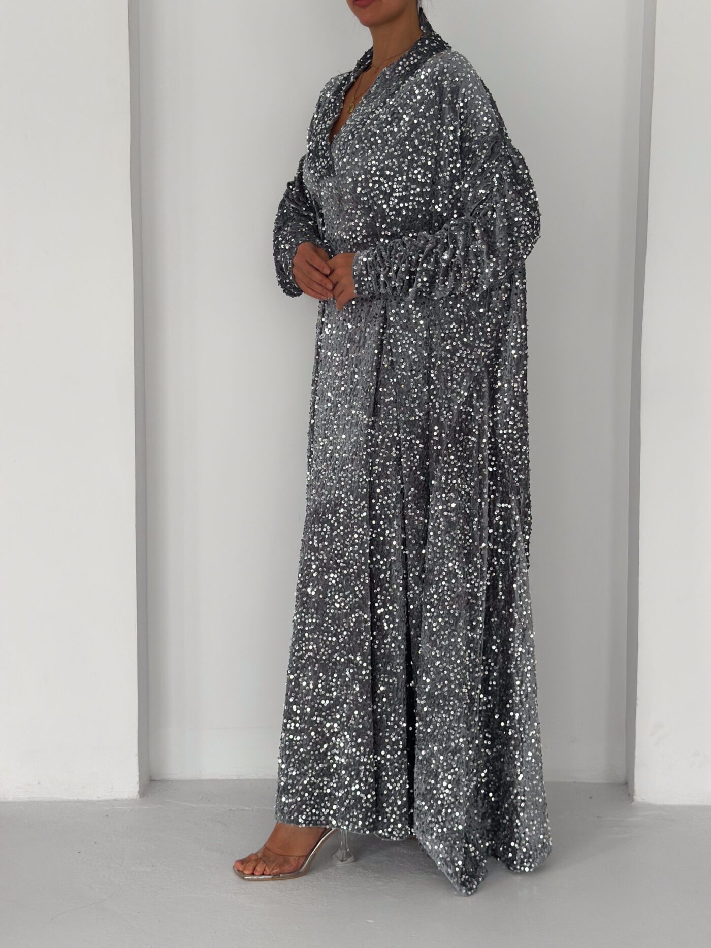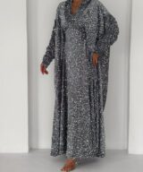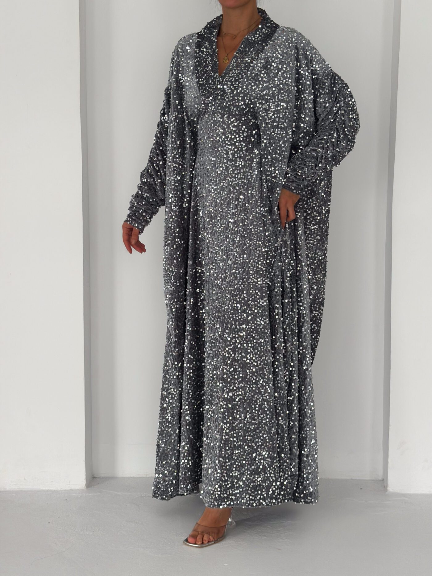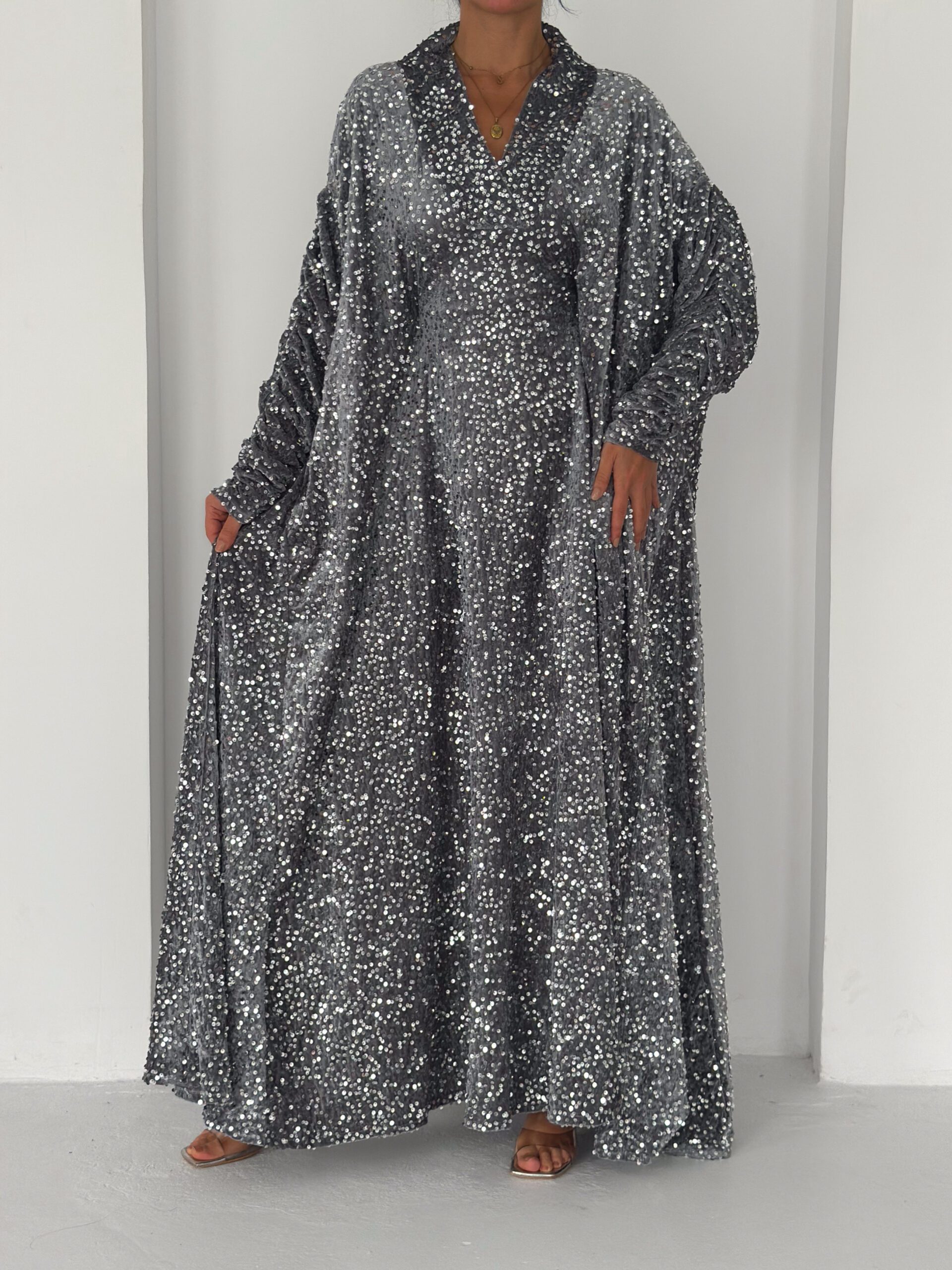 A statement velvet kaftan designed to shimmer with every movement. Crafted from rich, soft velvet and fully adorned with delicate silver beadwork, this piece captures the elegance of a star-lit night.