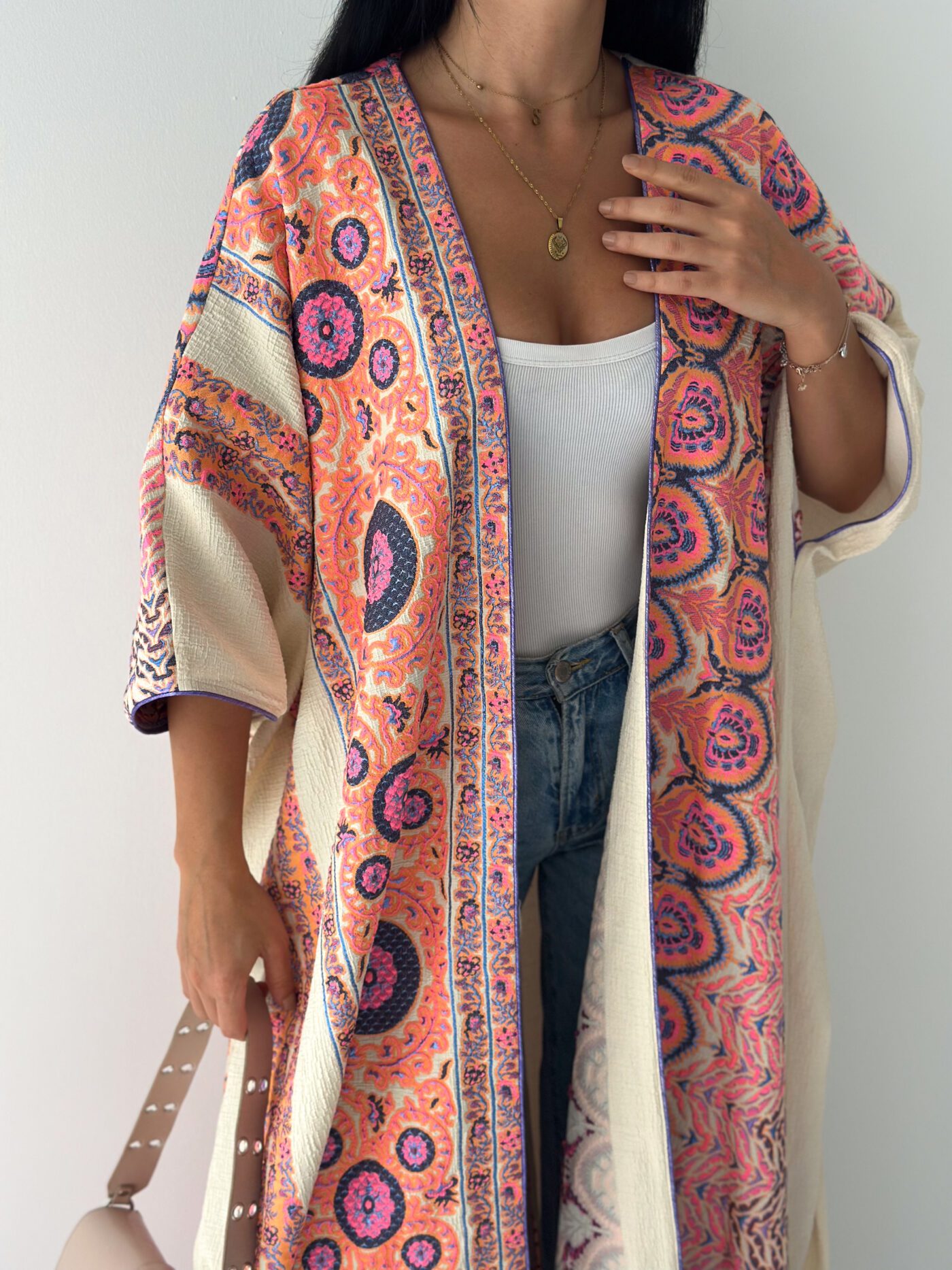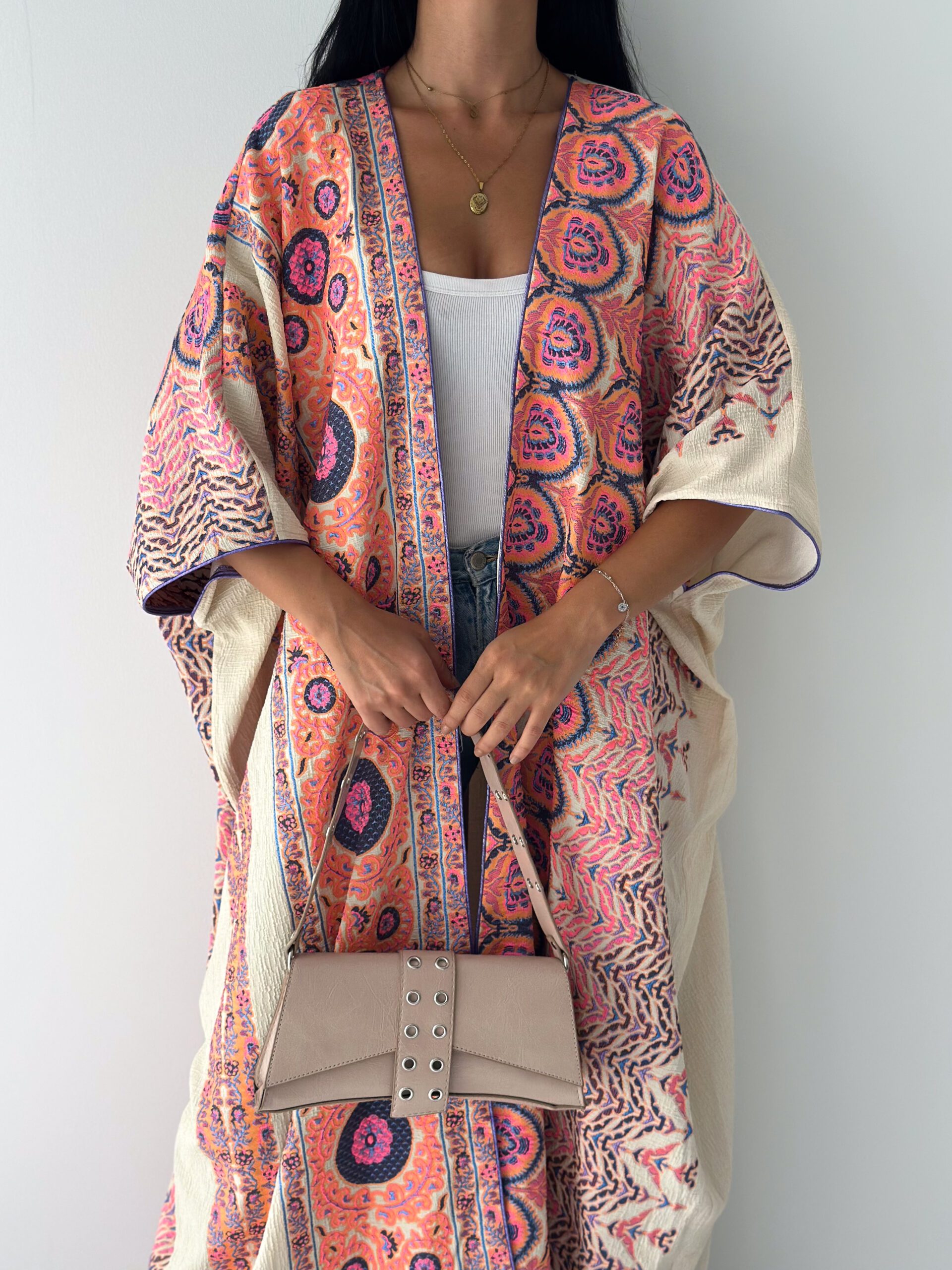 A statement abaya inspired by nomadic patterns and warm sunset tones. Designed with flowing fabric and vibrant oriental prints that add effortless elegance to any outfit. Perfect for layering over casual or chic looks, giving a relaxed yet luxurious vibe.