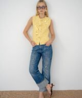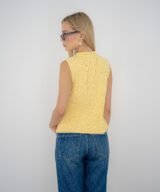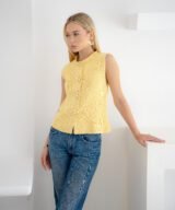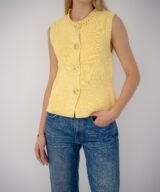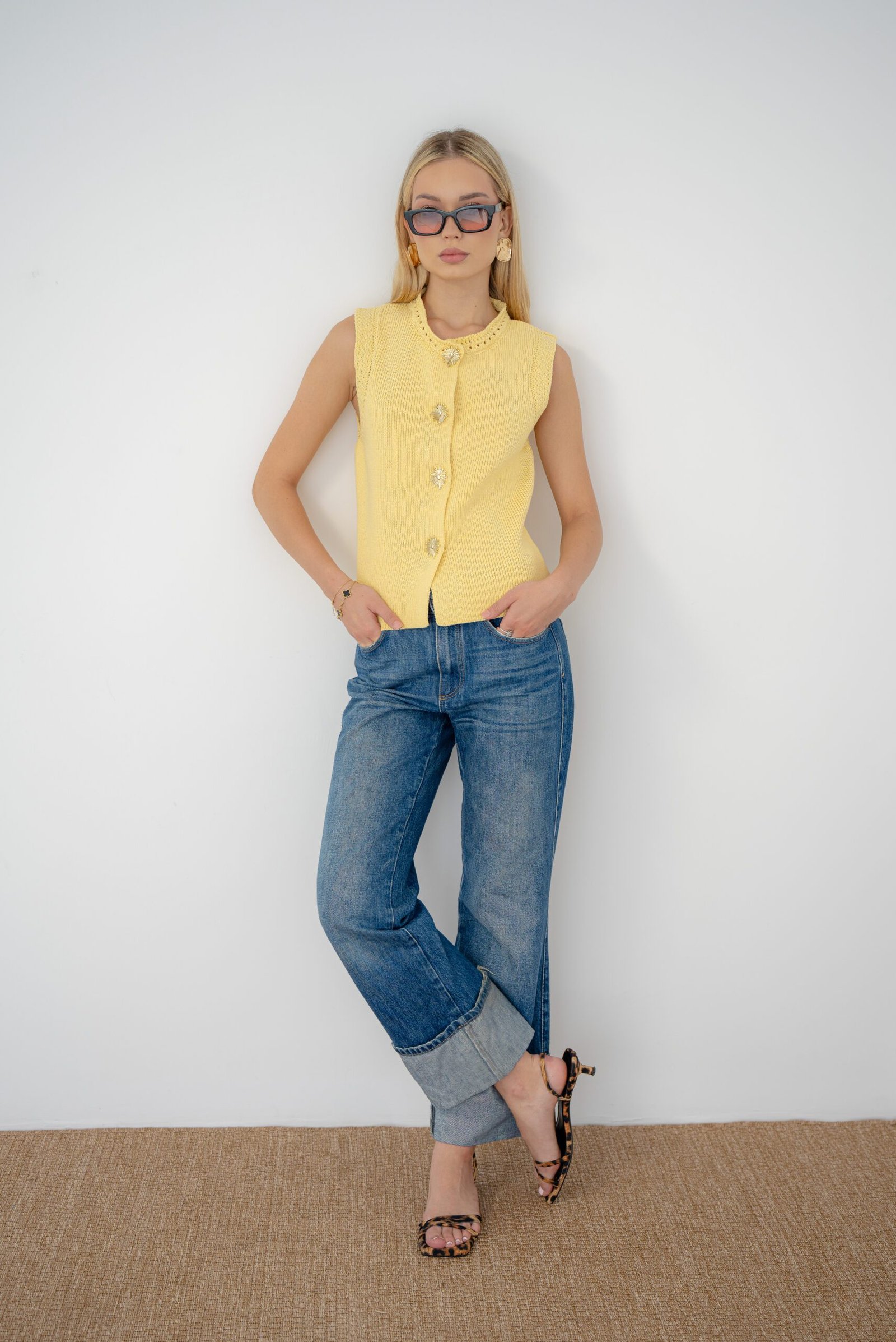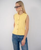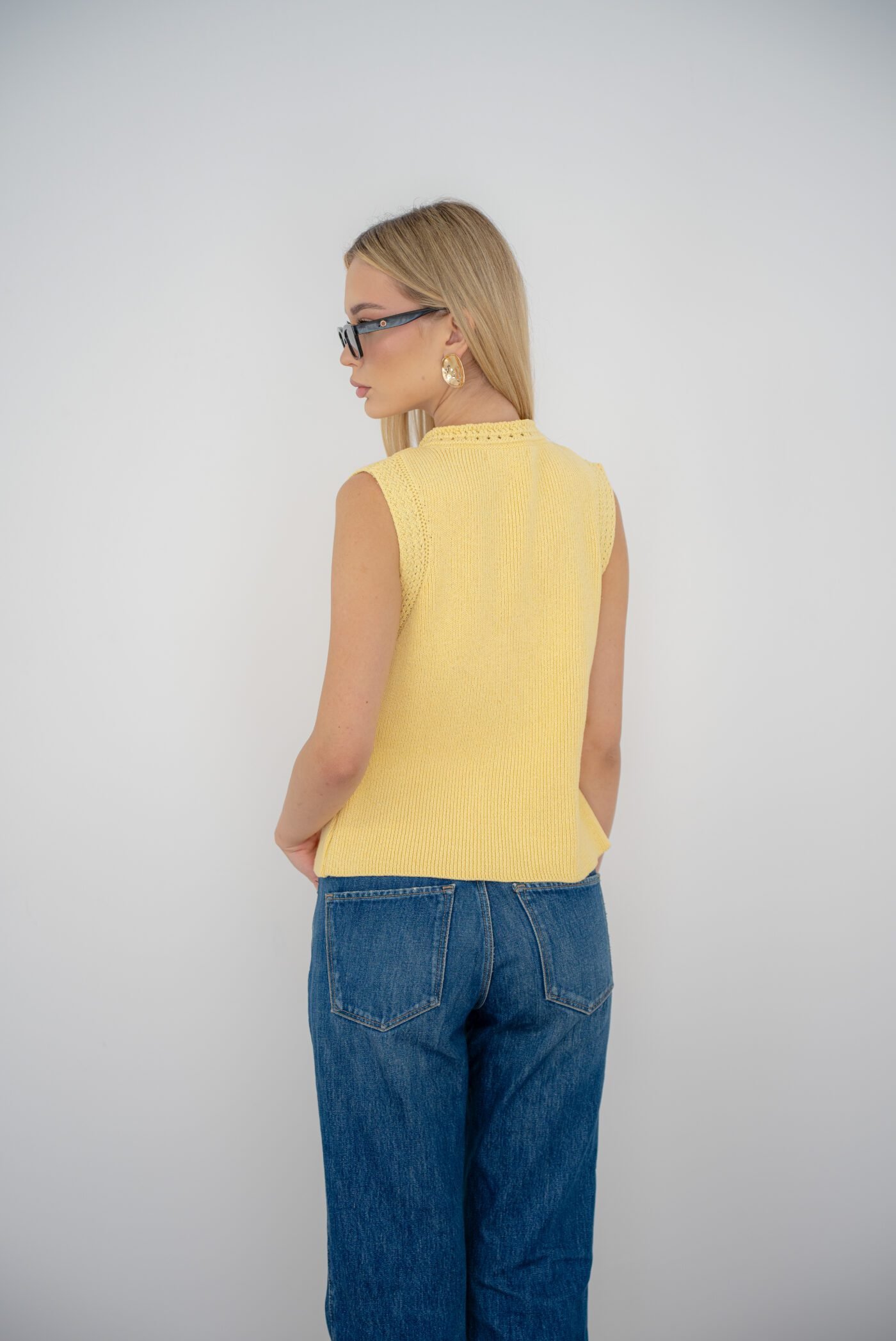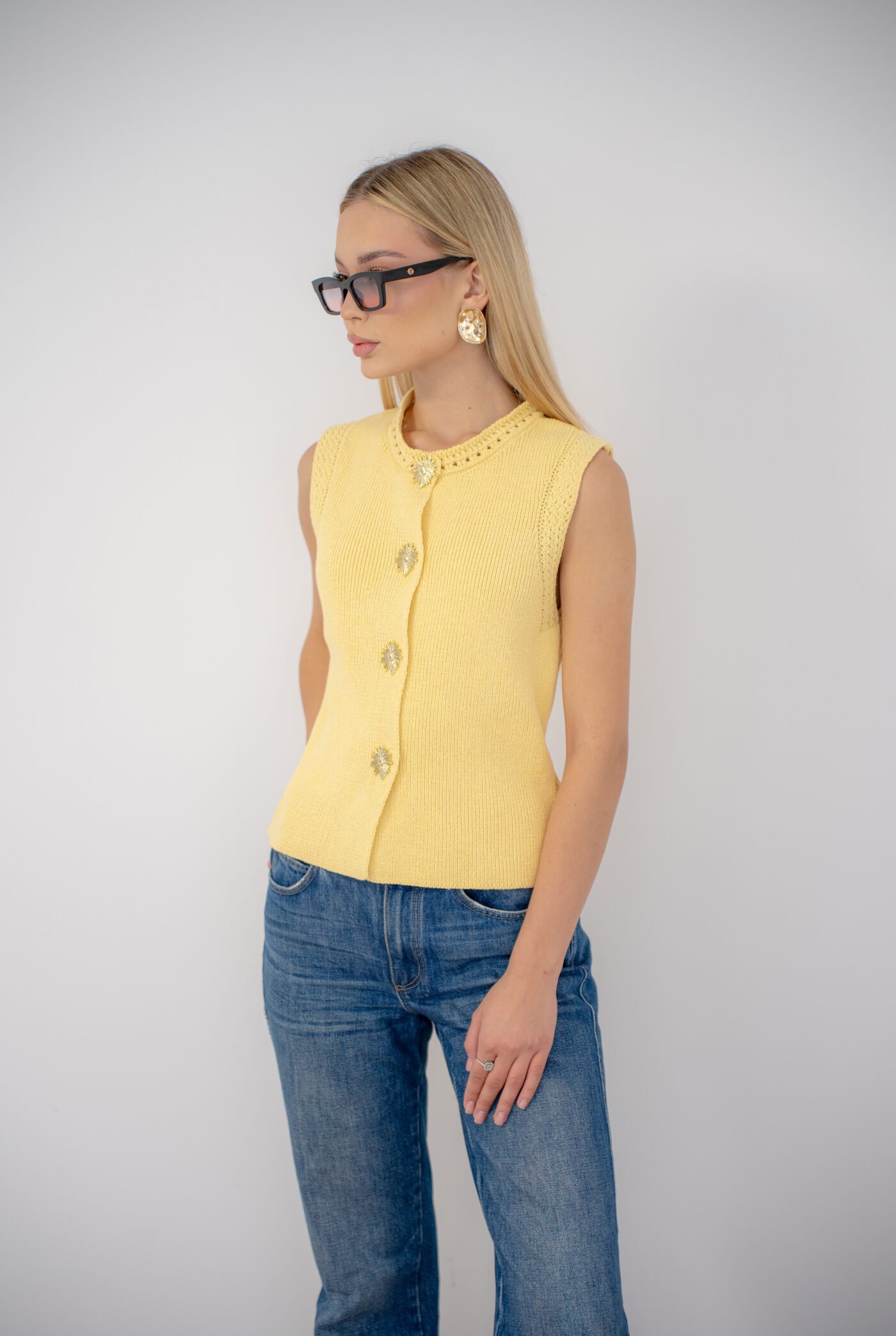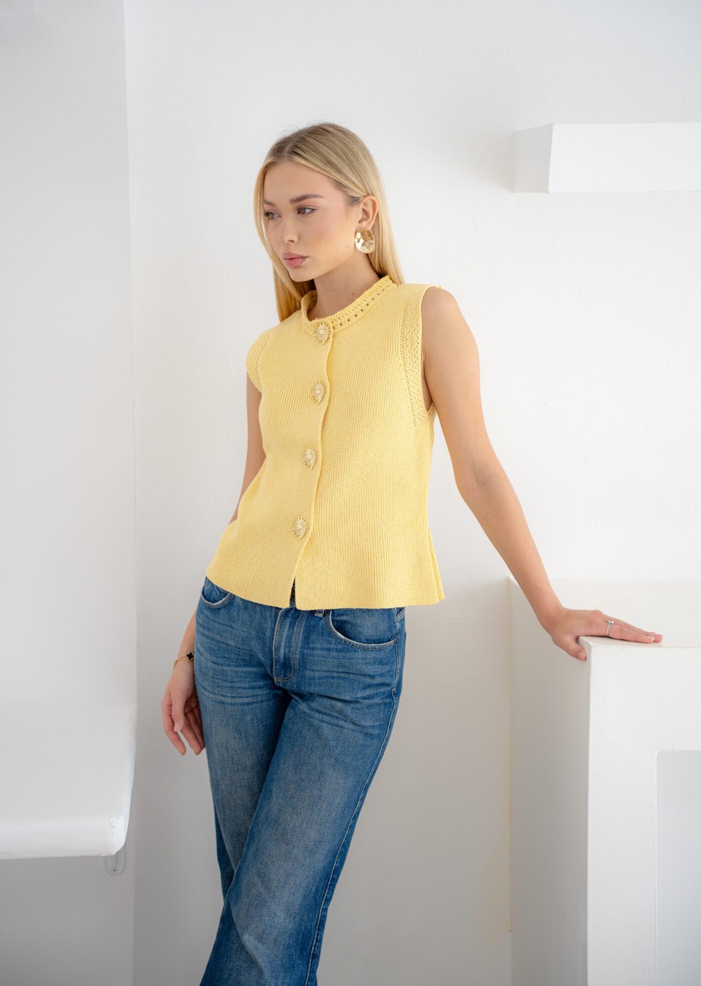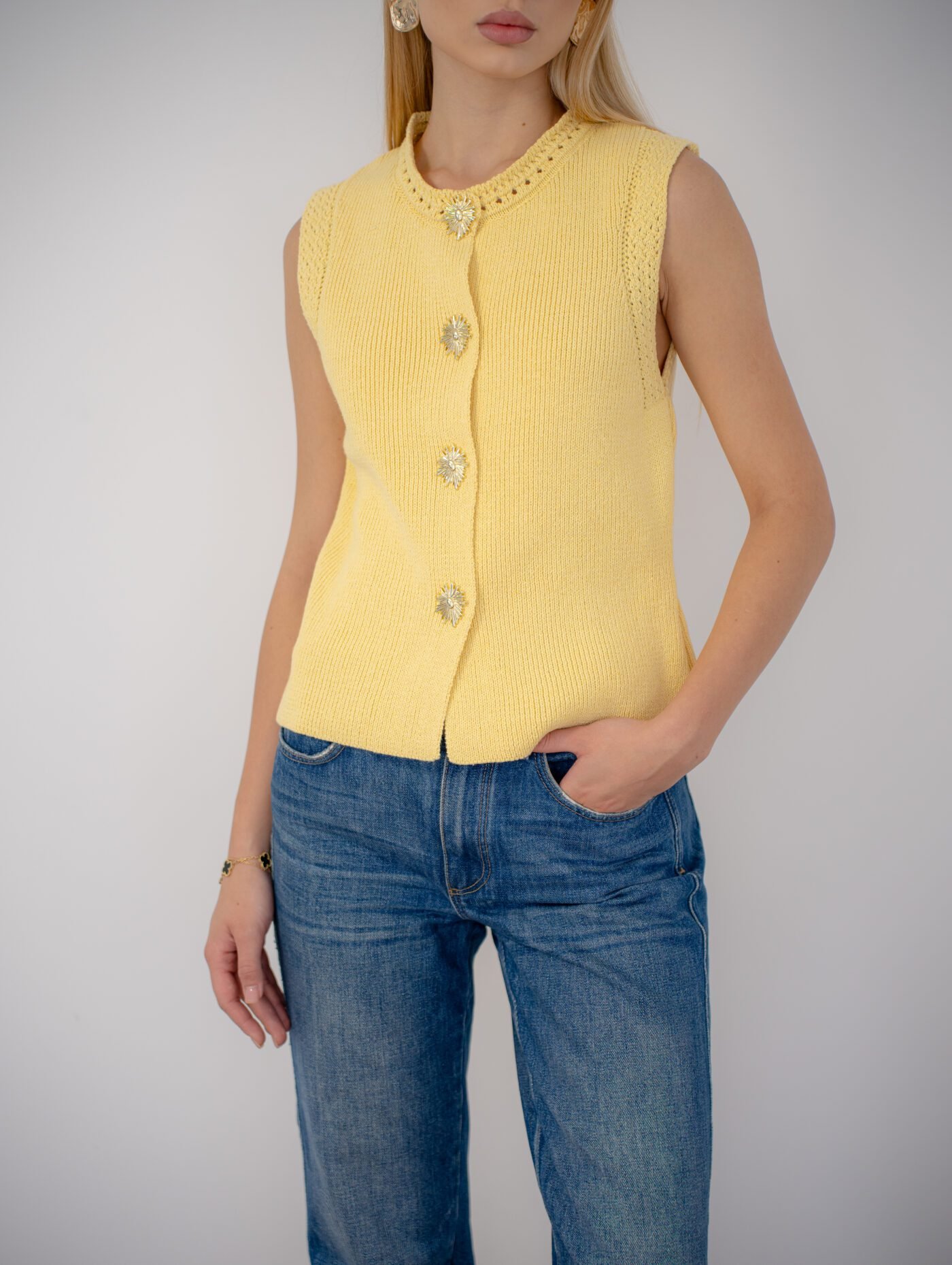 A sleeveless knit vest in pastel yellow, designed with crochet trim and unique gold sun buttons. Perfect for a fresh and stylish summer look.