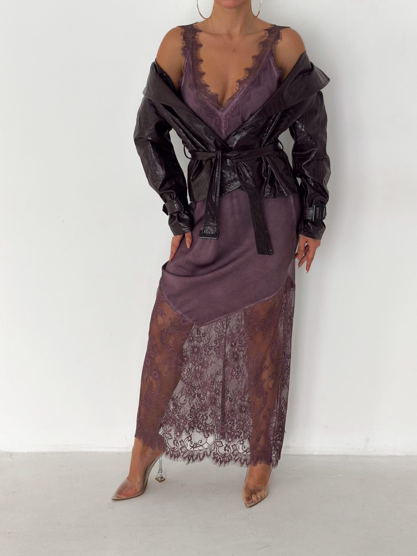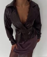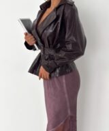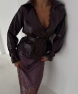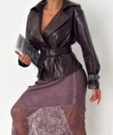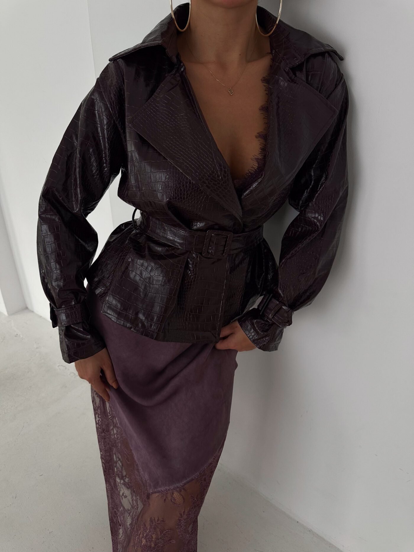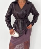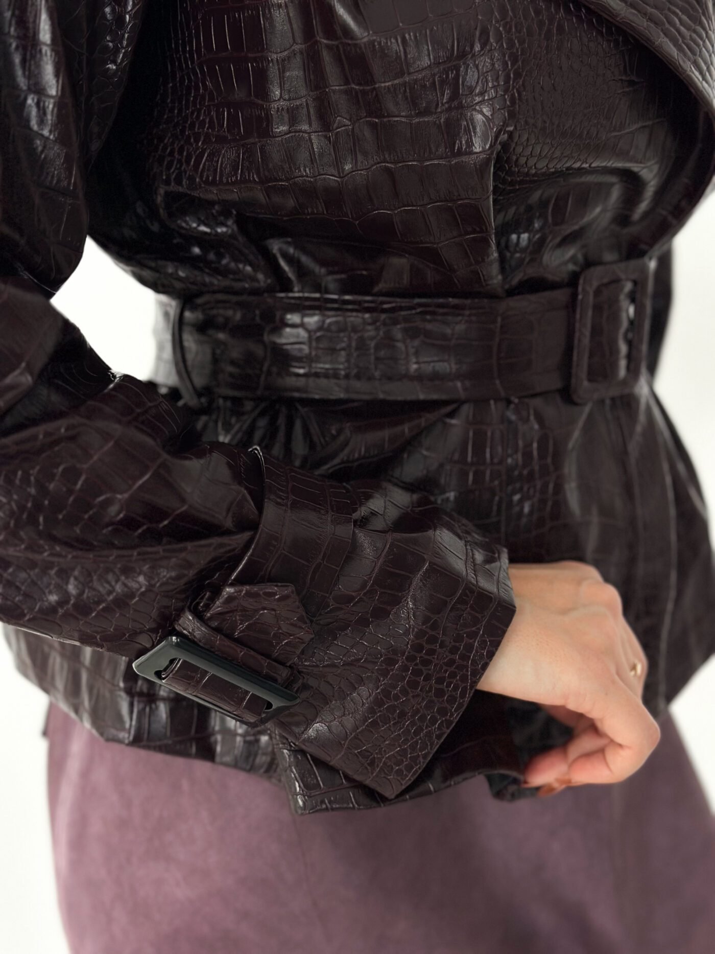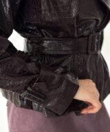 A stylish belted jacket crafted from textured faux leather with a crocodile-effect finish.