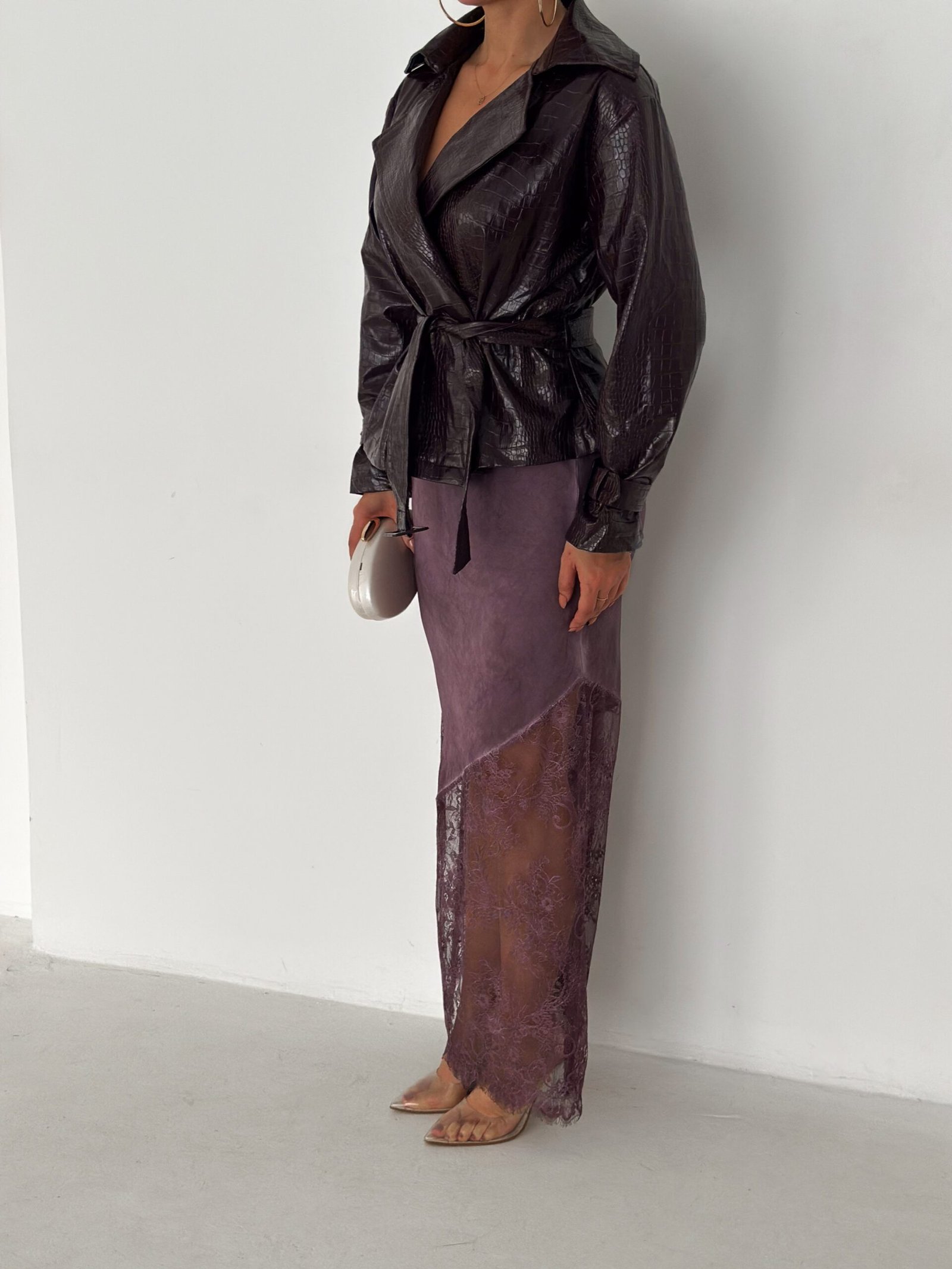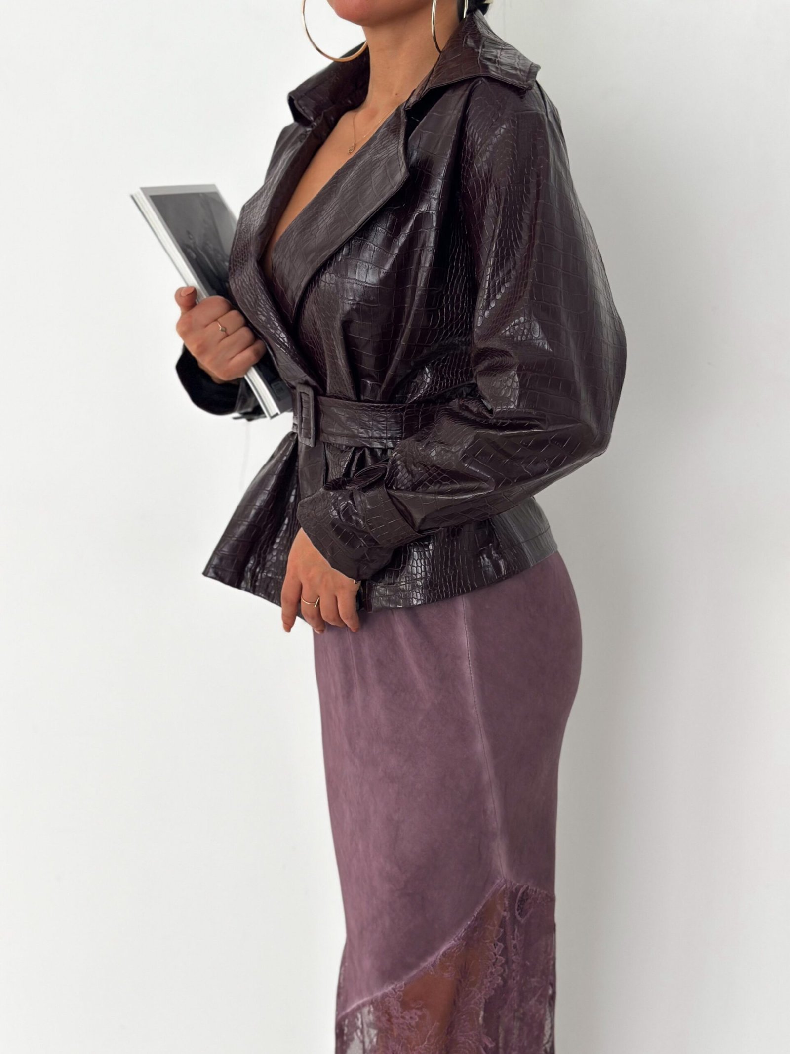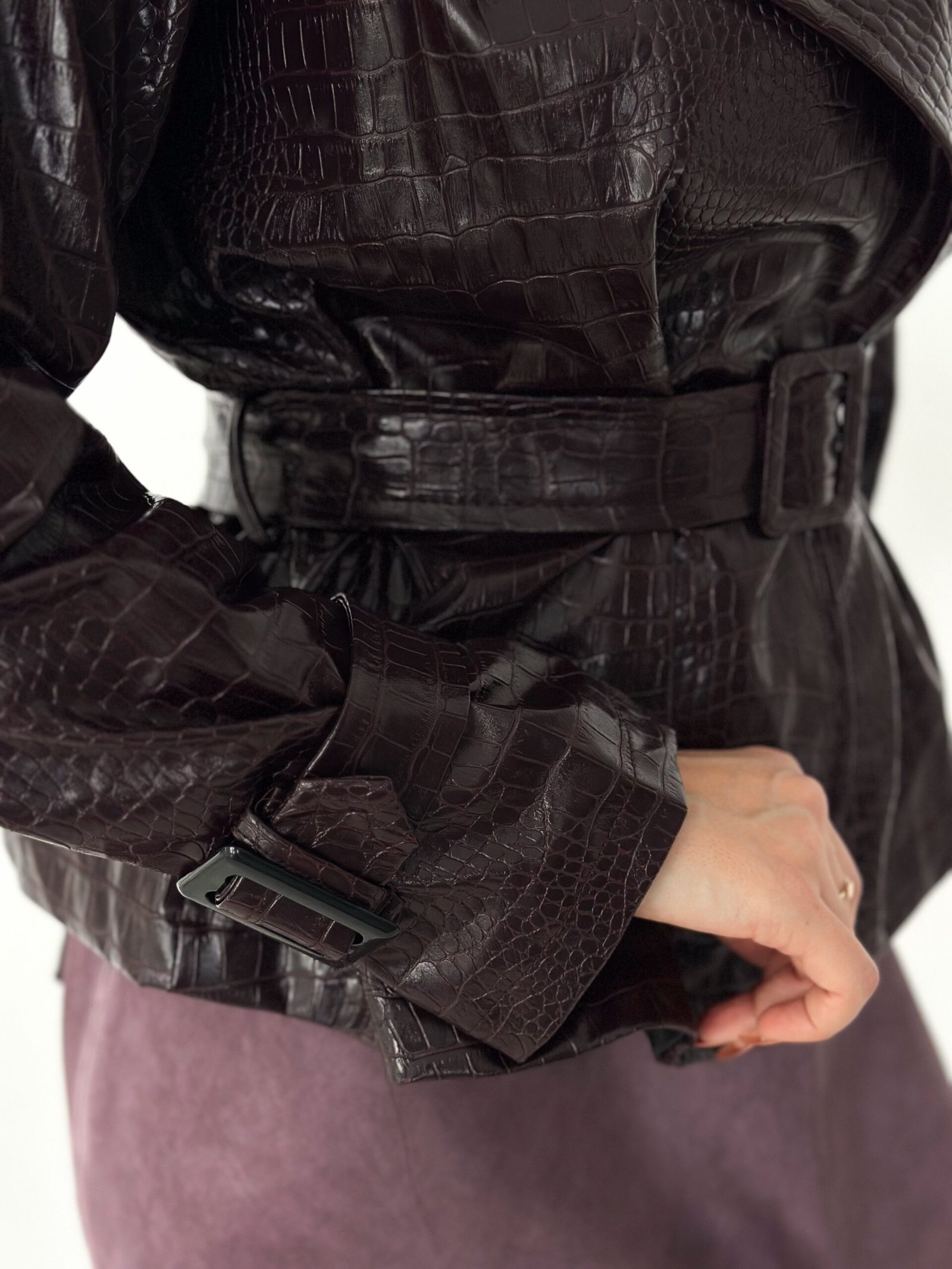 A stylish belted jacket crafted from textured faux leather with a crocodile-effect finish.