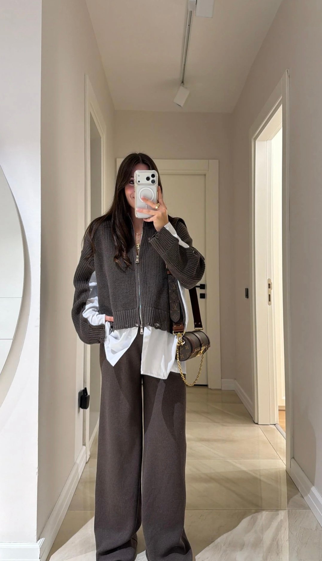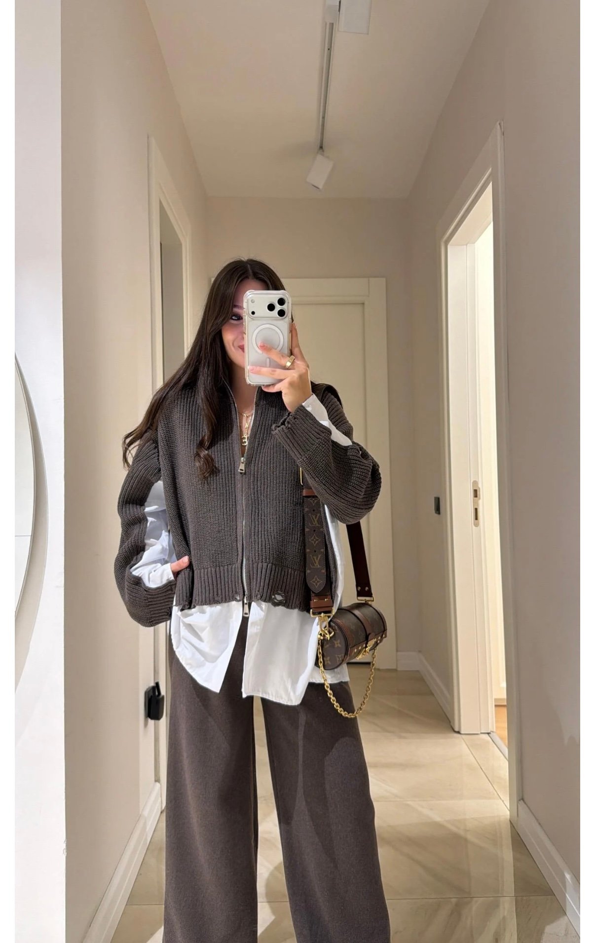 An effortlessly chic three-piece look featuring a soft knitted zip-up, a Black Beige Grey, and wide-leg pants. Designed for comfort and elegance in one easy outfit — fits perfectly for all body types.