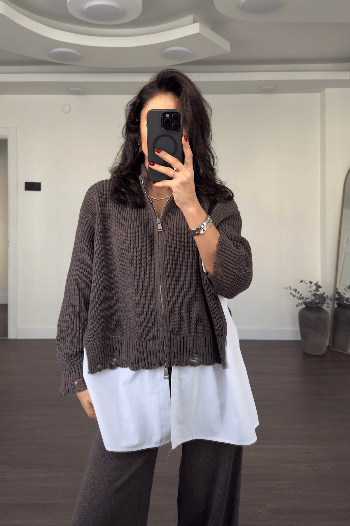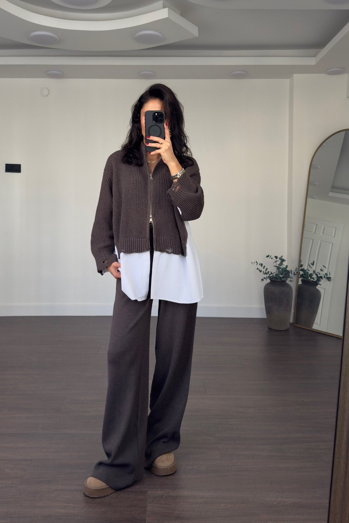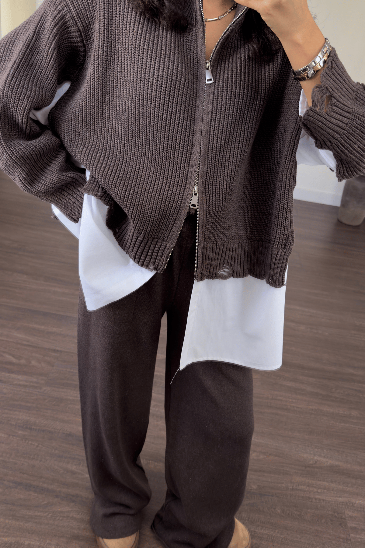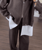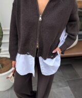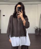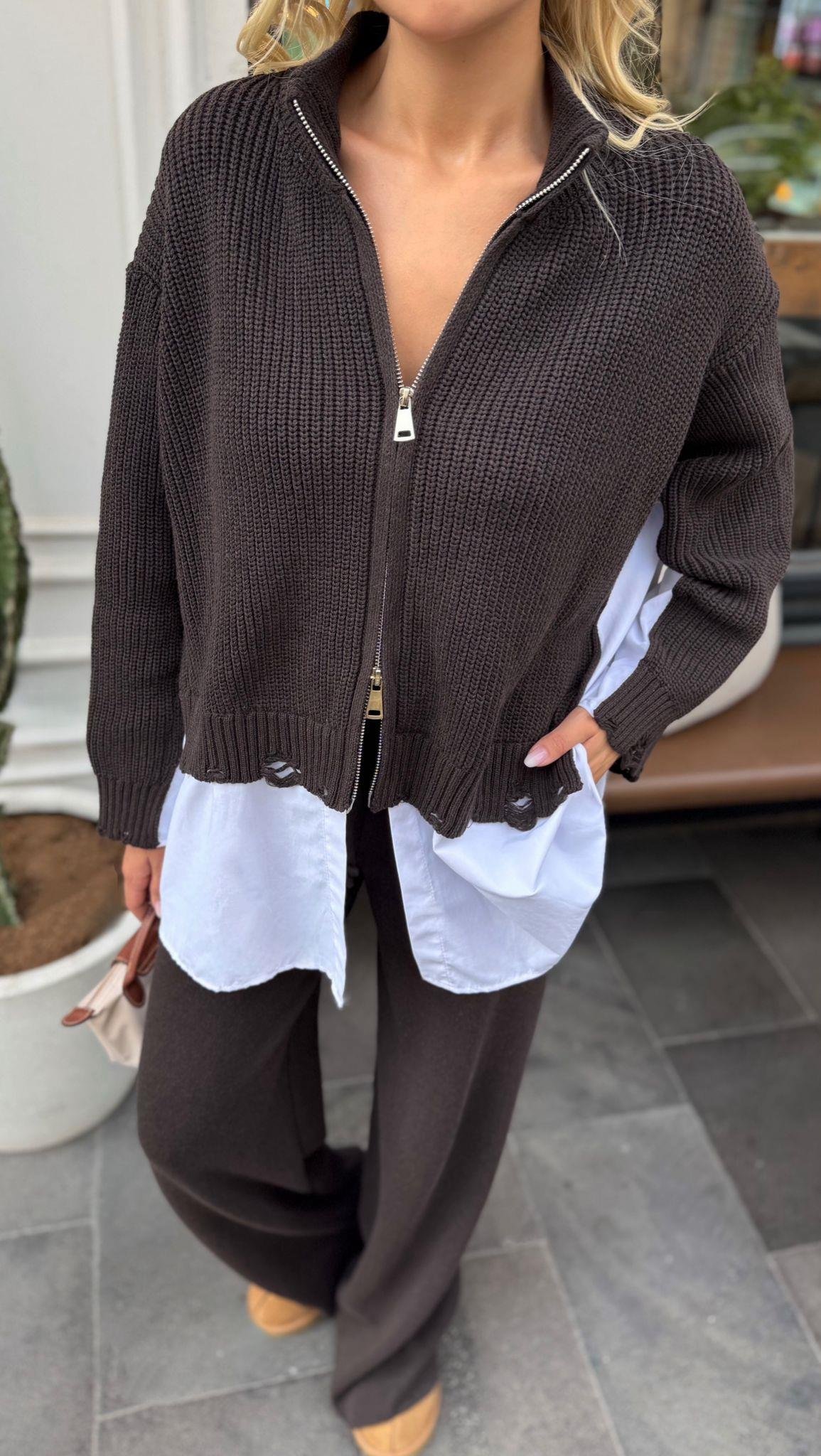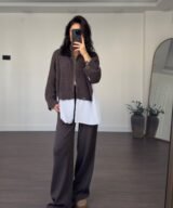 An effortlessly chic look featuring a soft knitted zip-up, a crisp white shirt, and wide-leg pants. Designed for comfort and elegance in one easy outfit — fits perfectly for all body types.