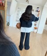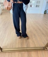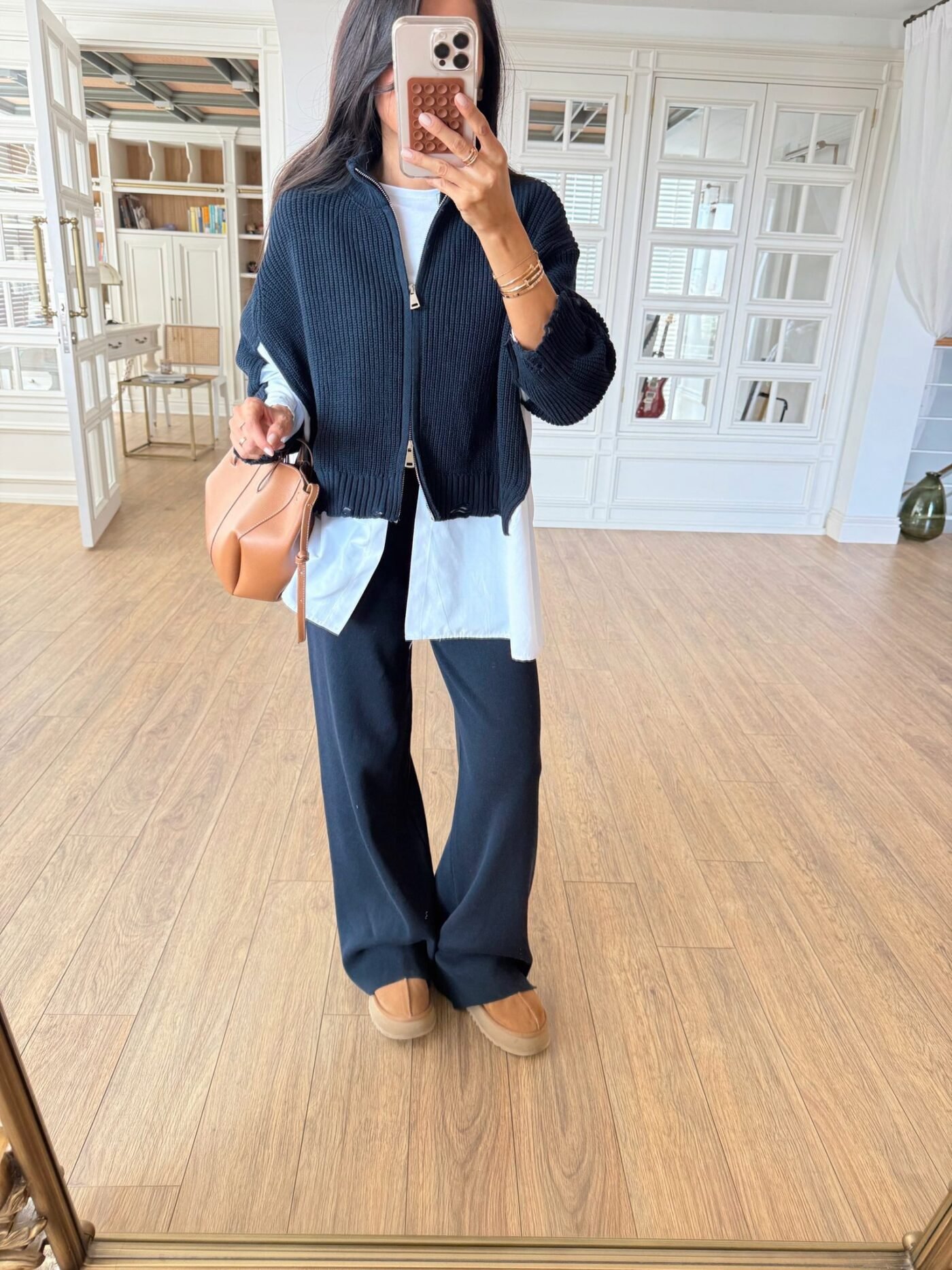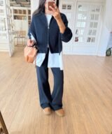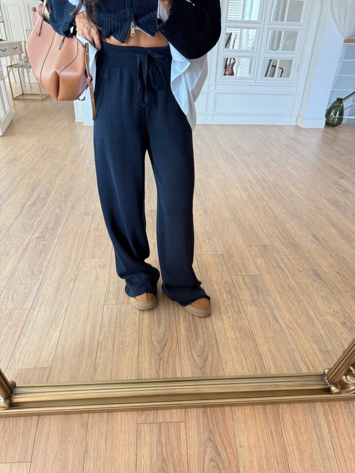 An effortlessly chic three-piece look featuring a soft knitted zip-up, a Black Beige Grey, and wide-leg pants. elegance in one easy outfit — fits perfectly for all body types.