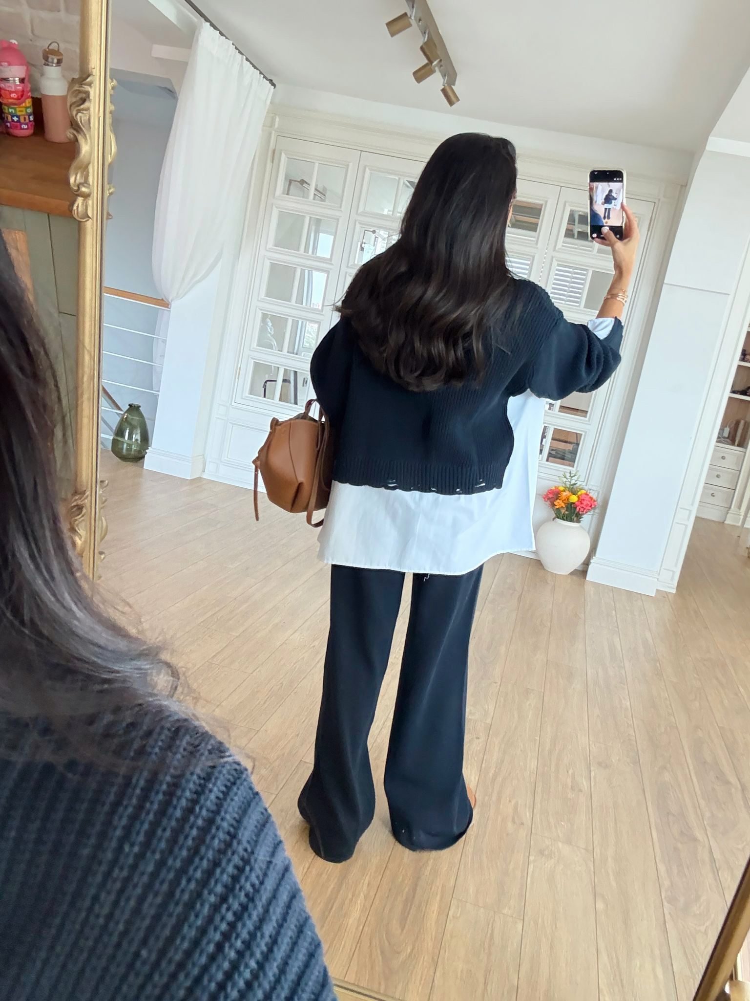 An effortlessly chic three-piece look featuring a soft knitted zip-up, a Black Beige Grey, and wide-leg pants. elegance in one easy outfit — fits perfectly for all body types.