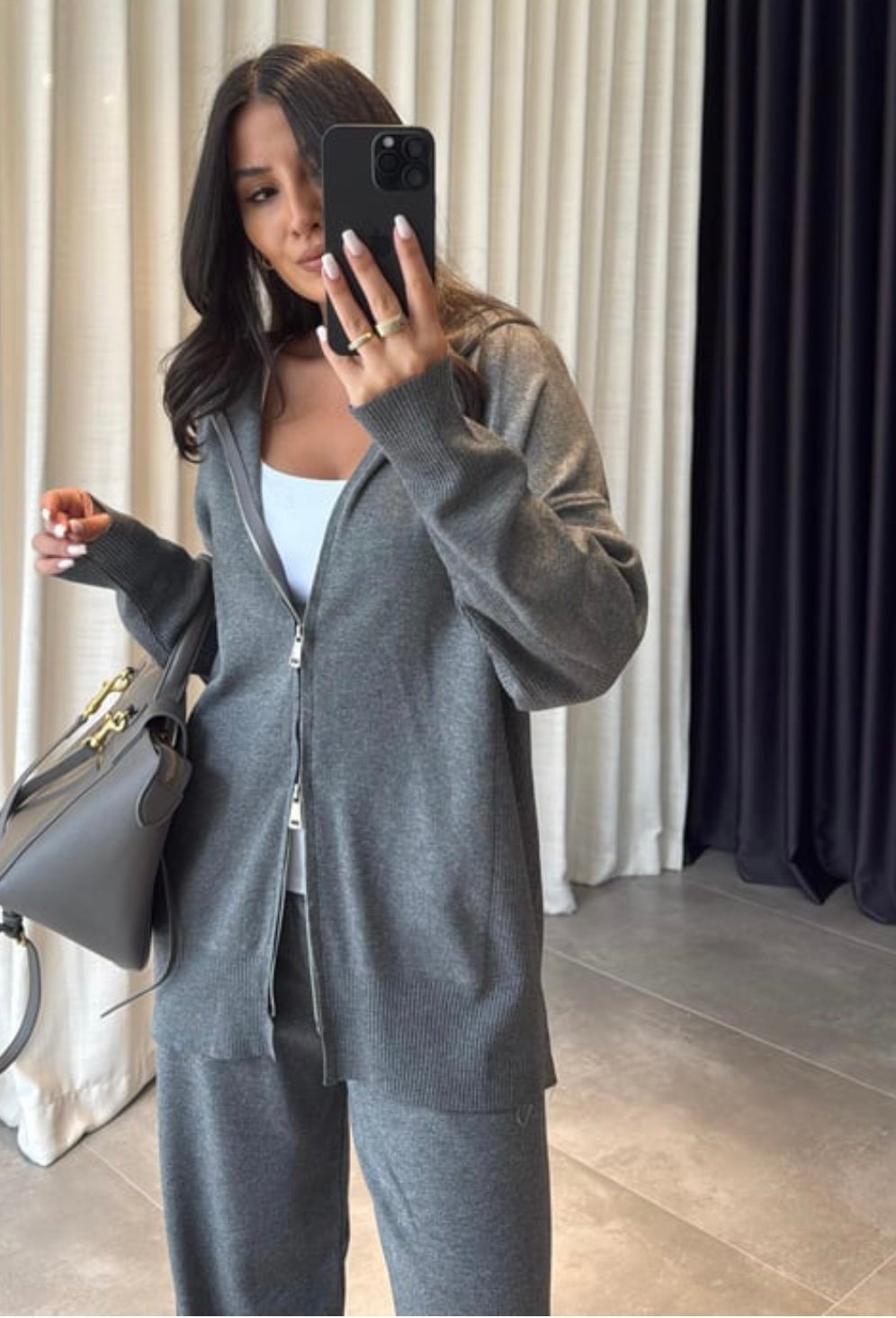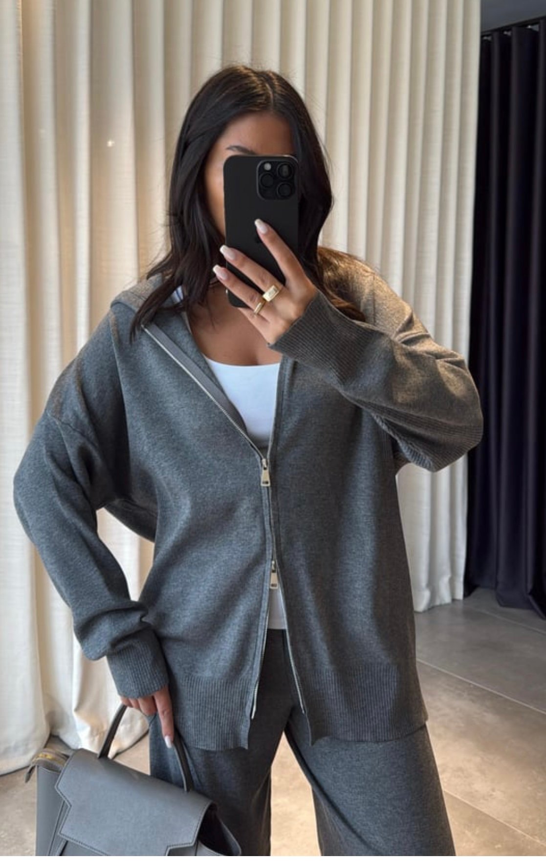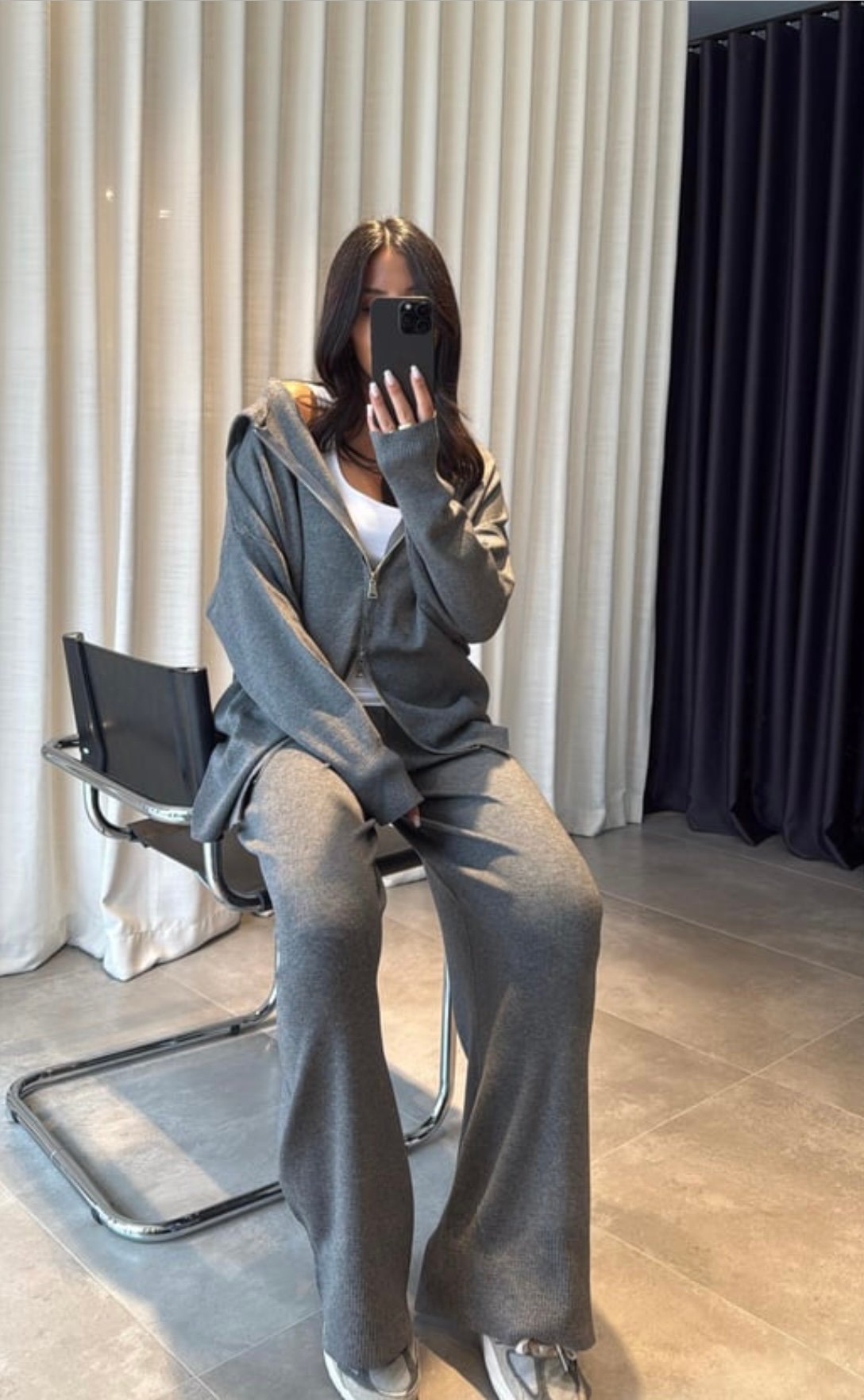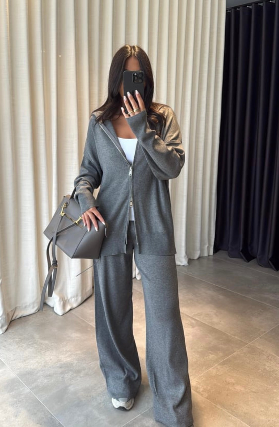 The Essential Knit Duo is your go-to everyday comfort set. Soft, lightweight, and effortlessly elegant—this set features a relaxed zip-up knit top paired with matching wide-leg pants for a clean, minimal look.