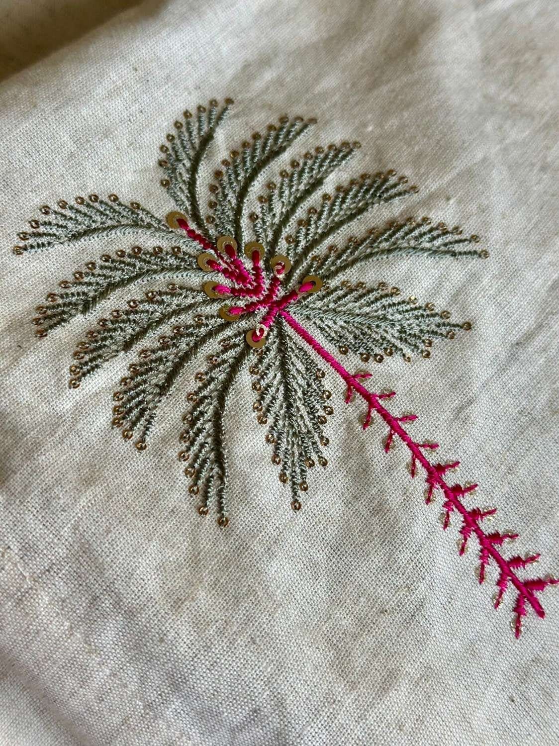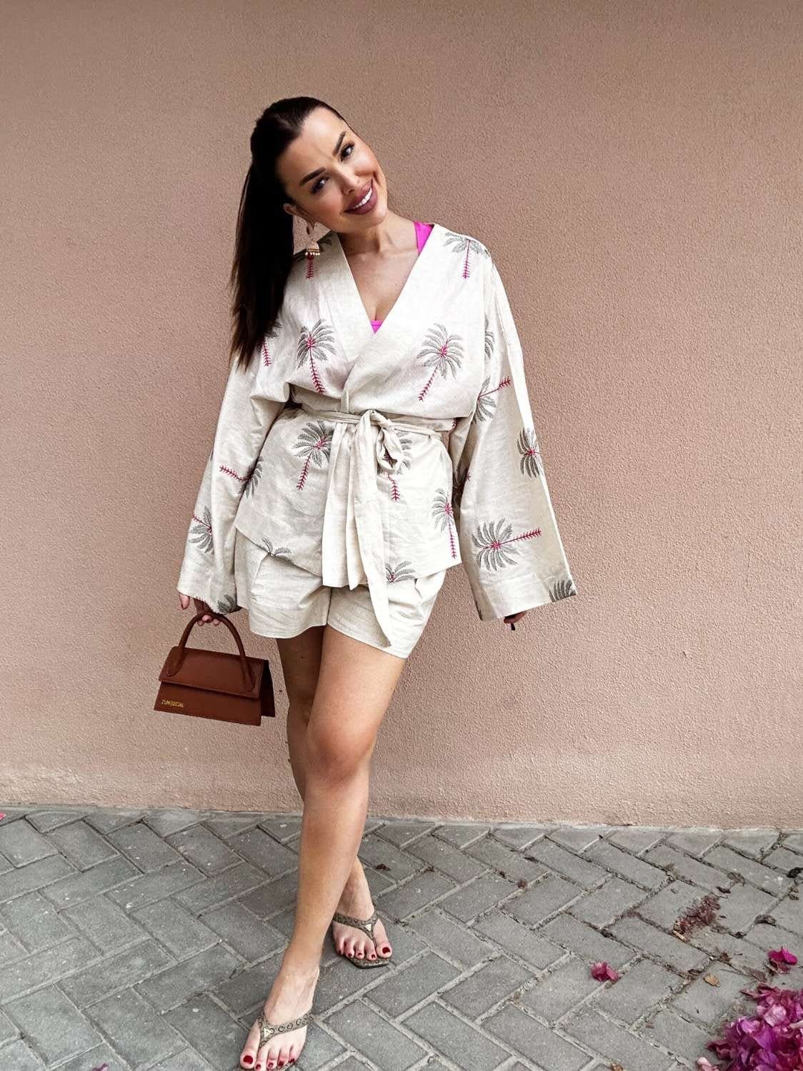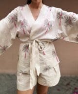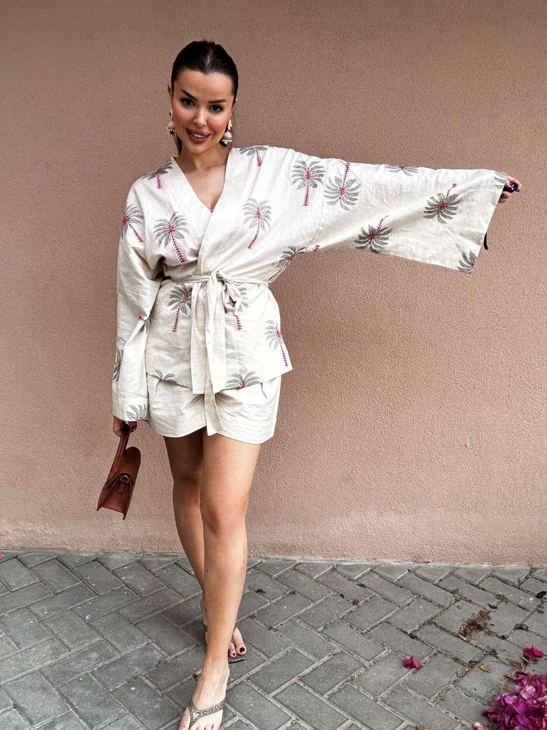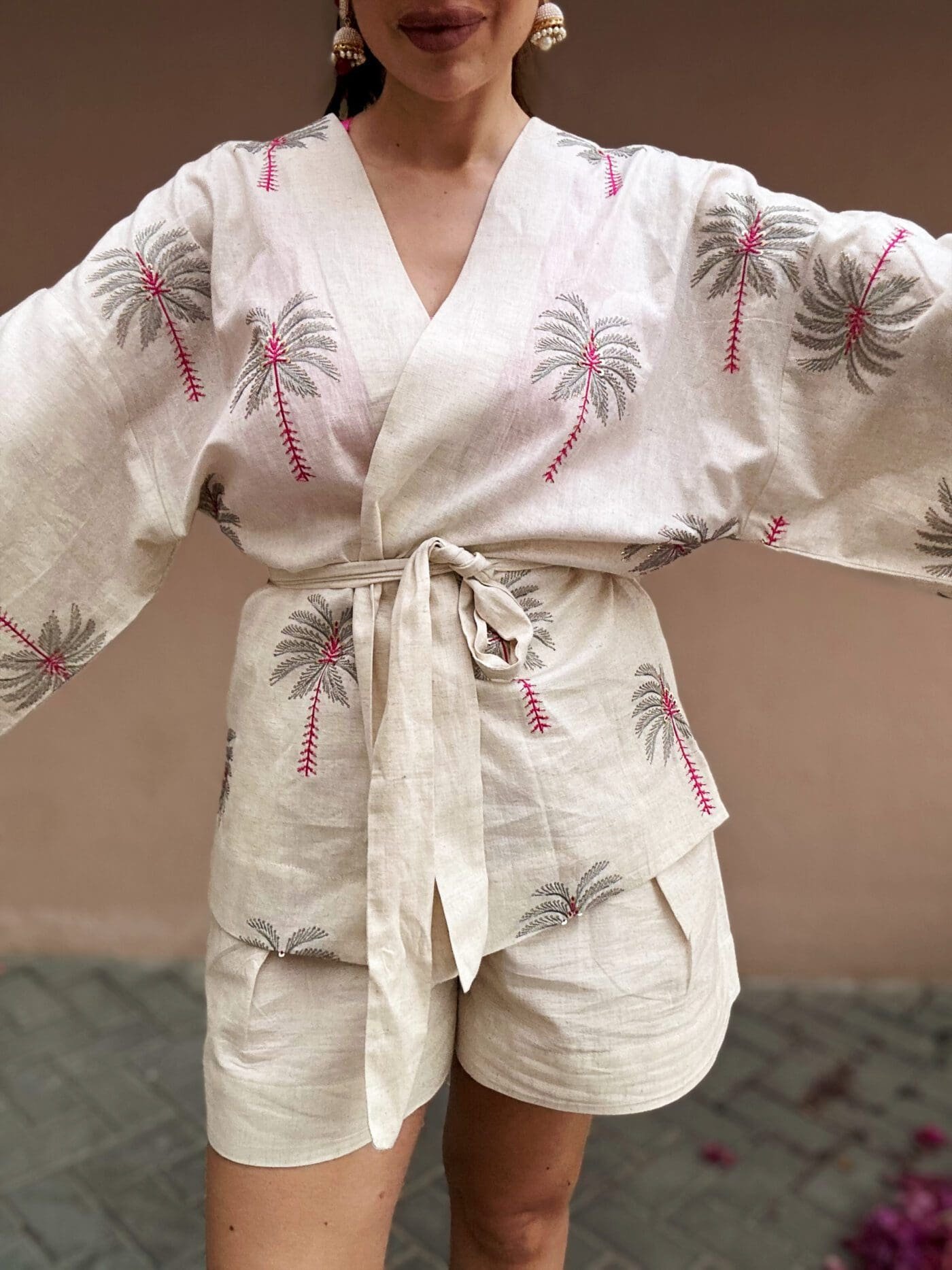 Introducing the Palm Pure Linen Set, available in two sizes: SM and ML. Featuring high-waisted shorts and an oversized cardigan, both crafted from 100% pure linen with handmade “The Palm” embroidery print. Experience luxurious comfort and effortless style in every wear.