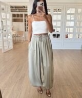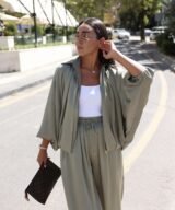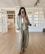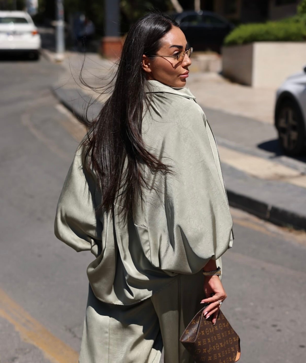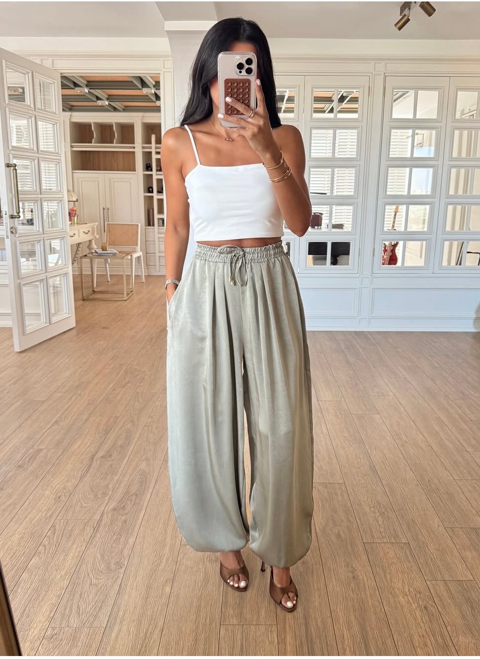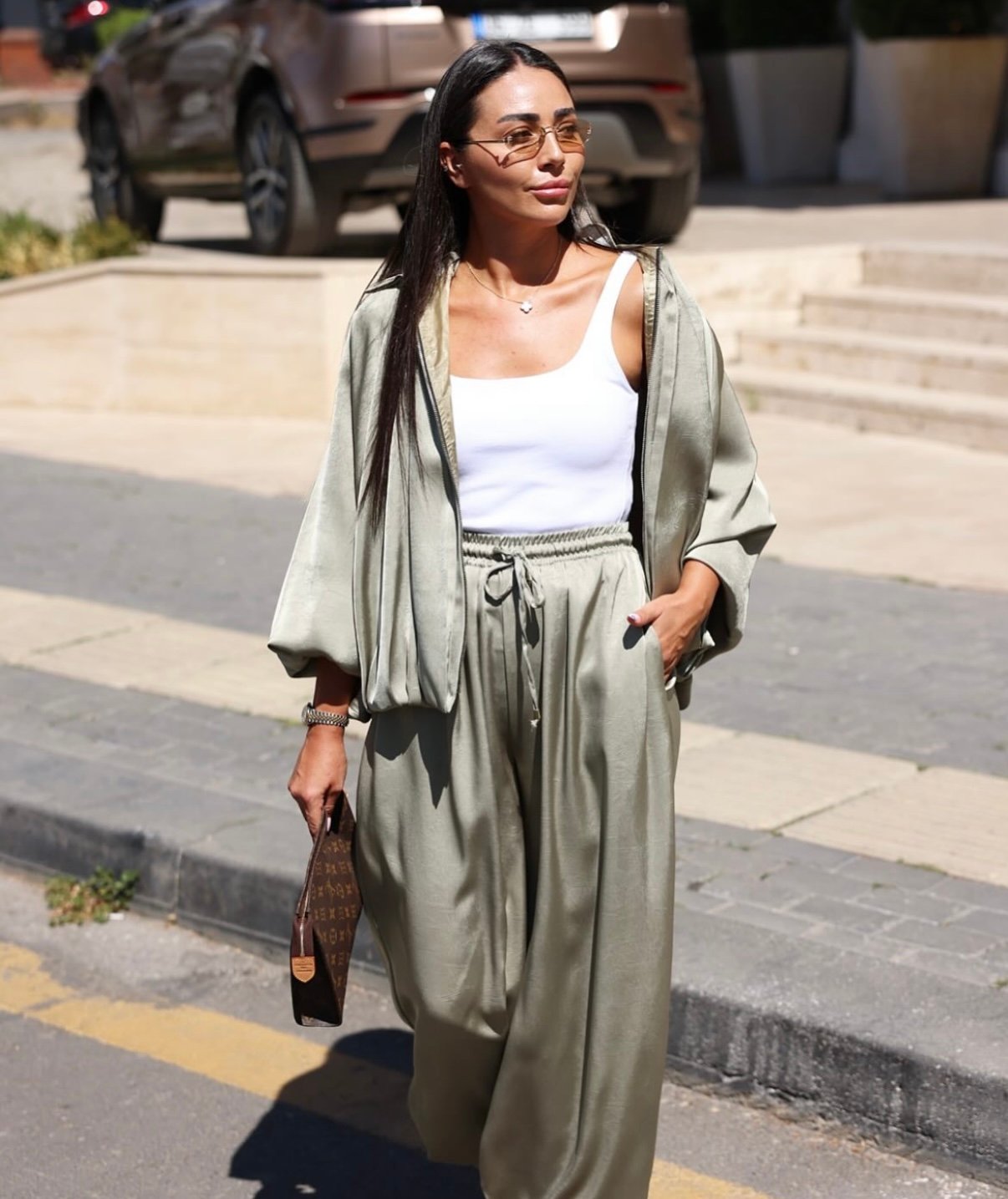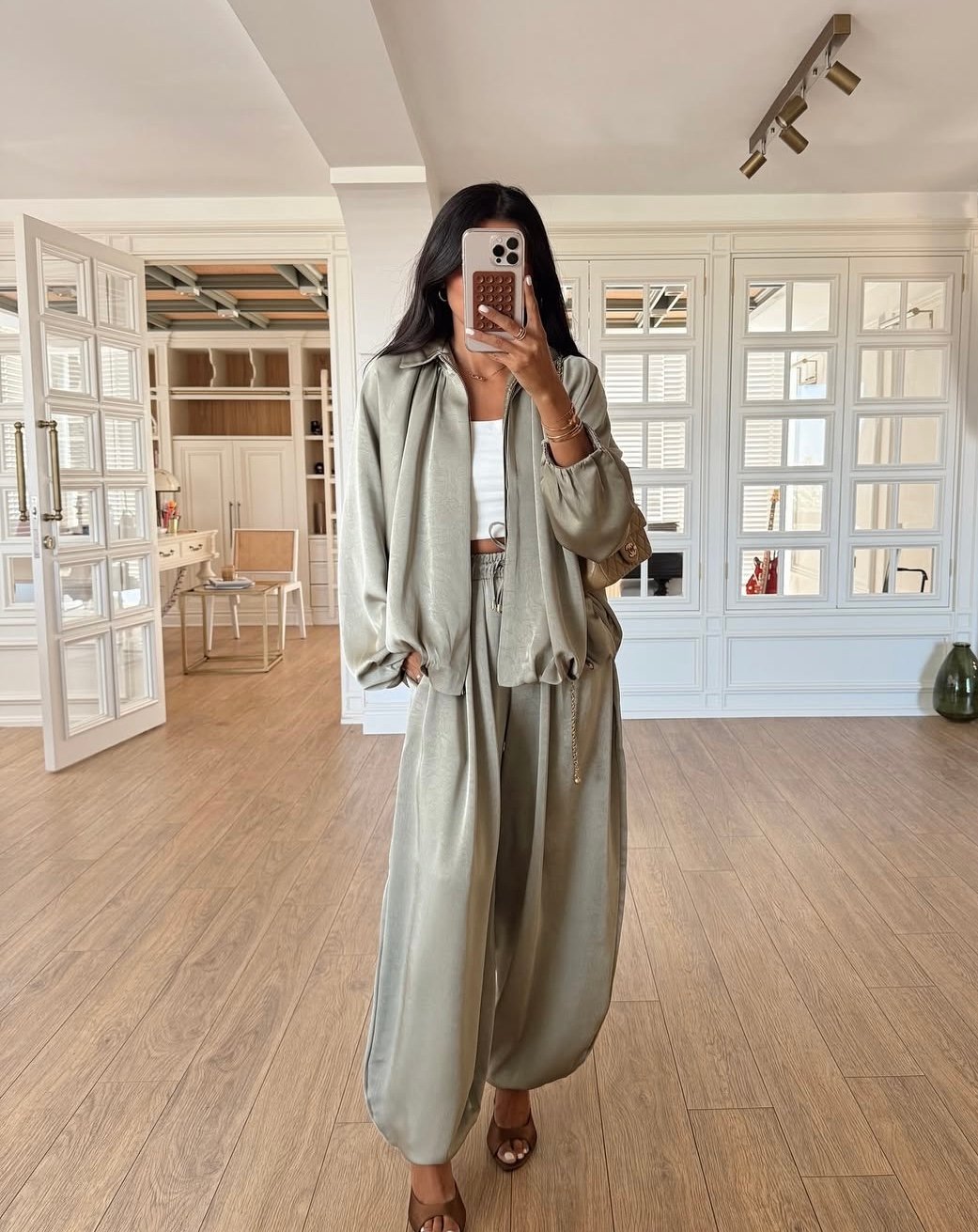 Effortlessly elegant and endlessly comfortable — The Sage Flow Set is crafted from a silky, lightweight fabric with a subtle shine. It features a relaxed-fit jacket with soft balloon sleeves and matching wide-leg pants with an elastic waist and adjustable tie. Perfect for both casual outings and chic evenings — pair it with a simple crop top or tank for a polished modern look.