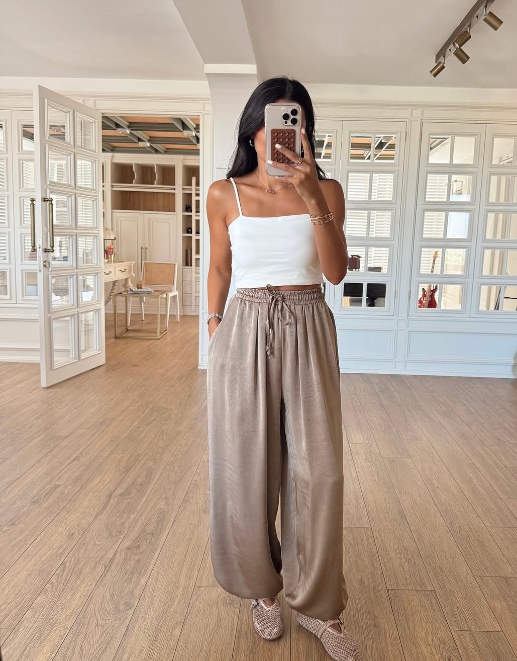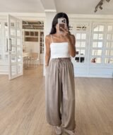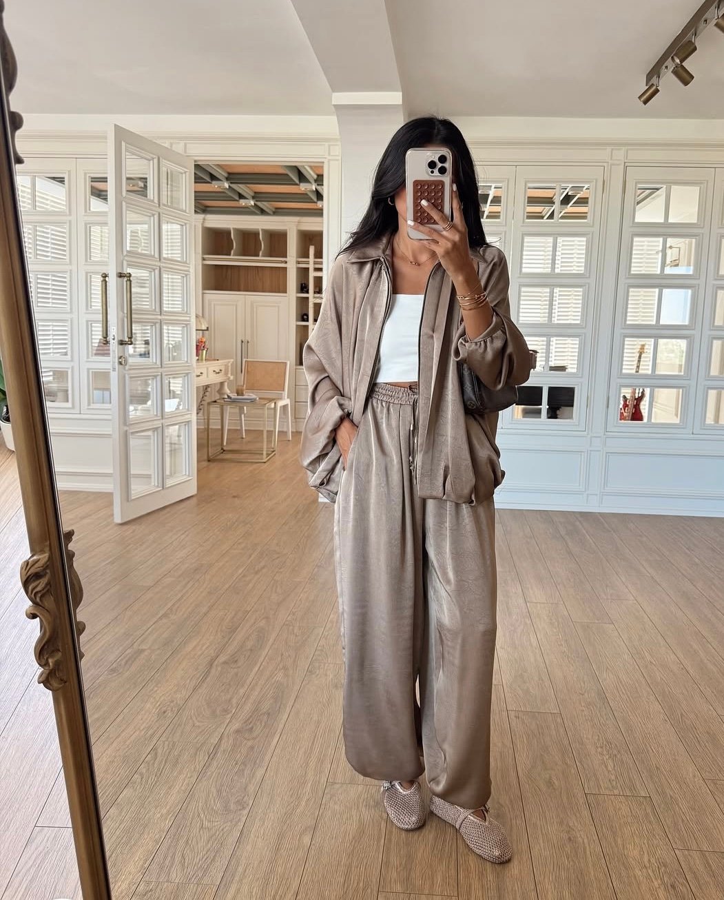 Effortlessly elegant and endlessly comfortable — The Sage Flow Set is crafted from a silky, lightweight fabric with a subtle shine. It features a relaxed-fit jacket with soft balloon sleeves and matching wide-leg pants with an elastic waist and adjustable tie. Perfect for both casual outings and chic evenings — pair it with a simple crop top or tank for a polished modern look.
