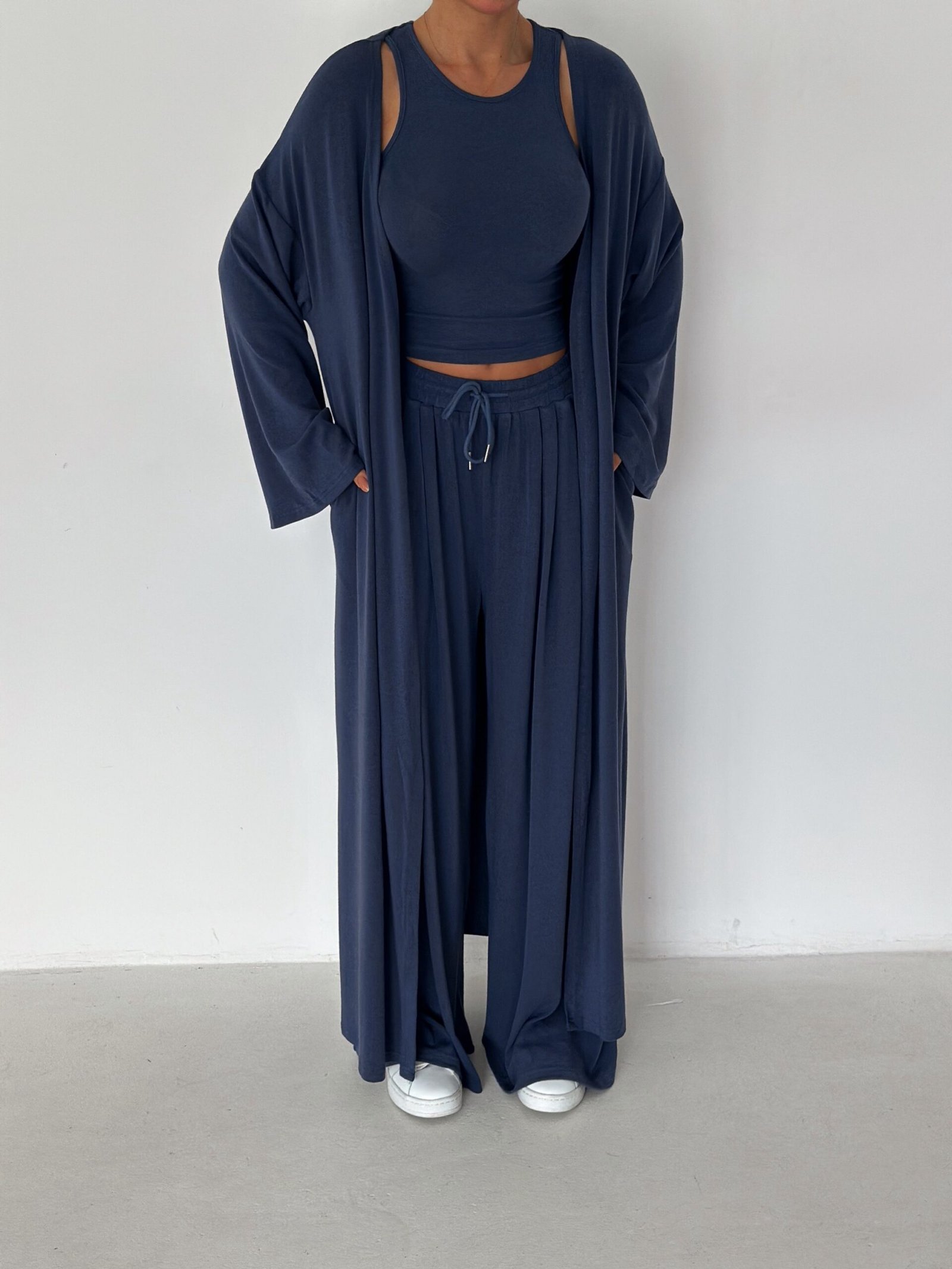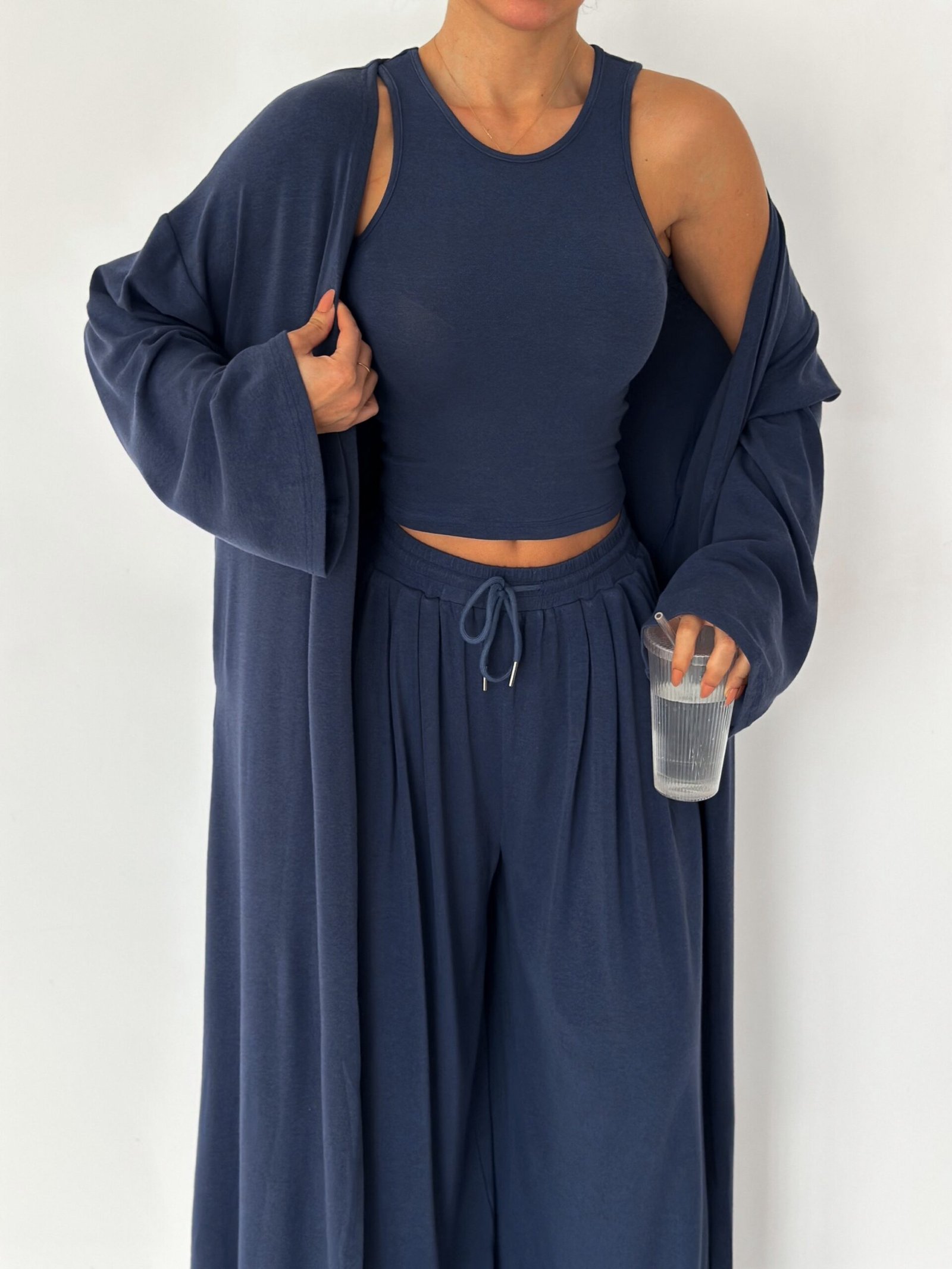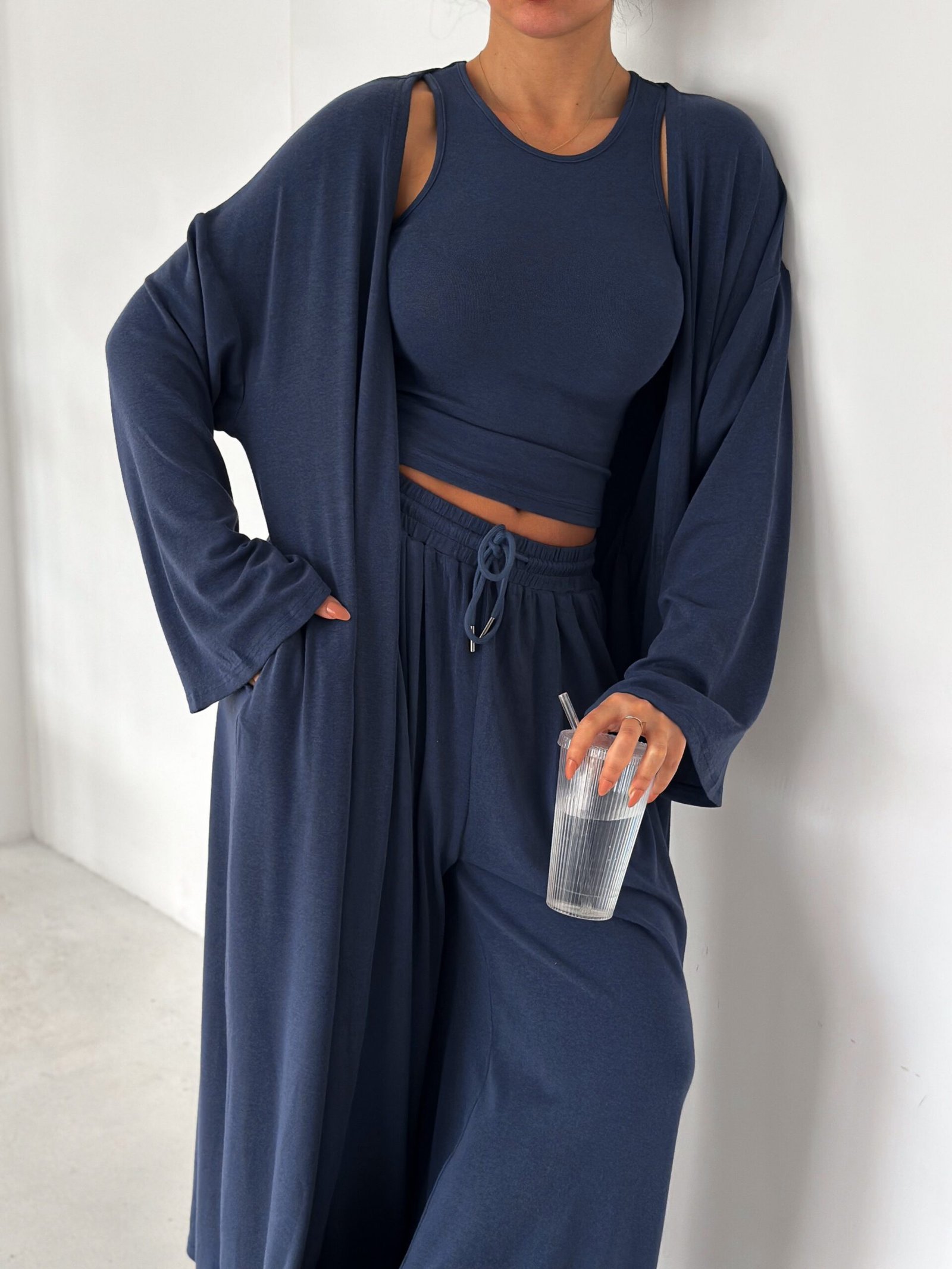 A three-piece elevated essential designed for women who love comfort with quiet luxury. Crafted from ultra-soft premium cotton with a natural, fluid drape that moves beautifully with the body. The Serenity Set brings together elegance, comfort, and effortless style—perfect for mornings, travel days, or a refined everyday look.
