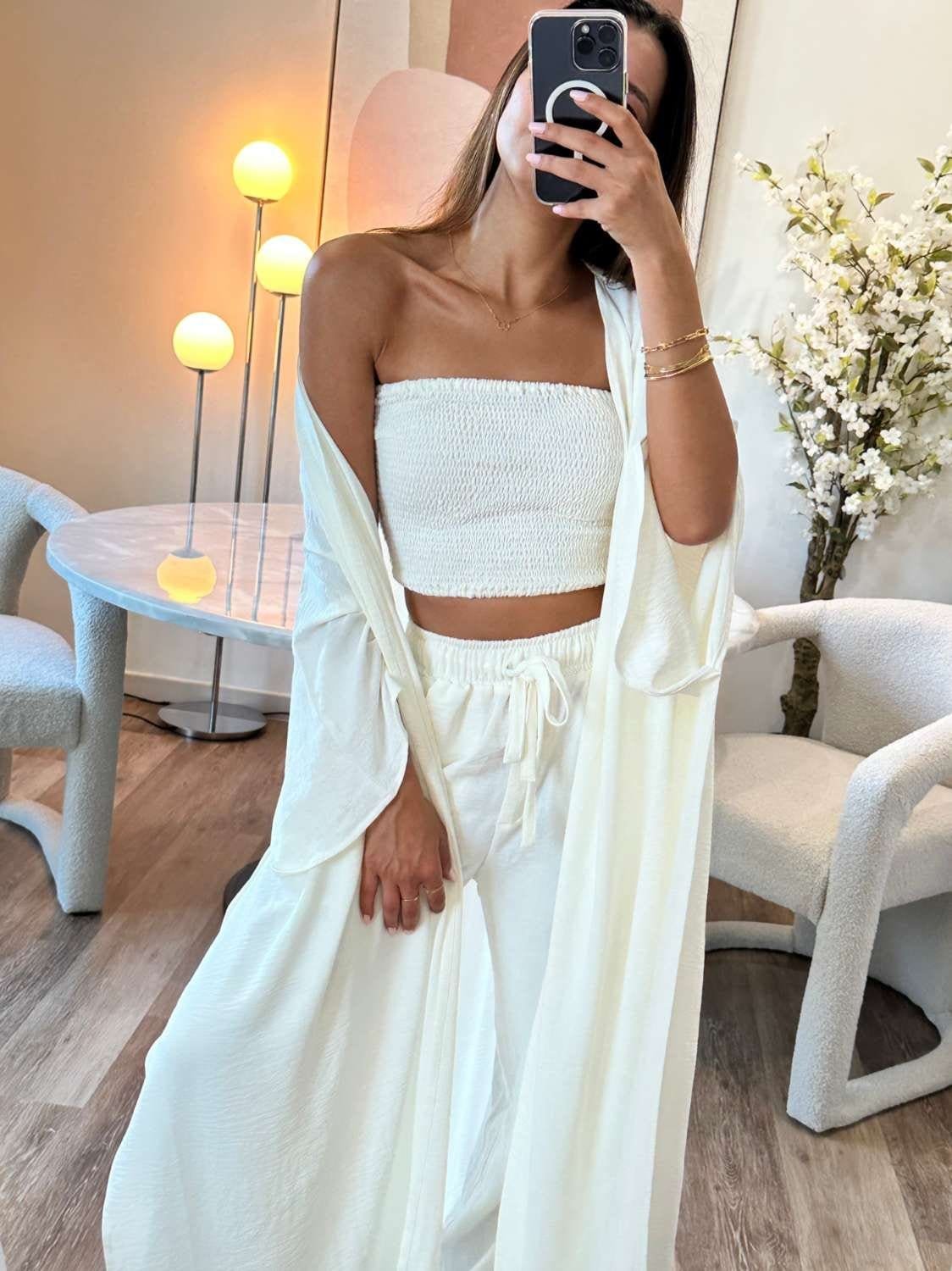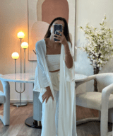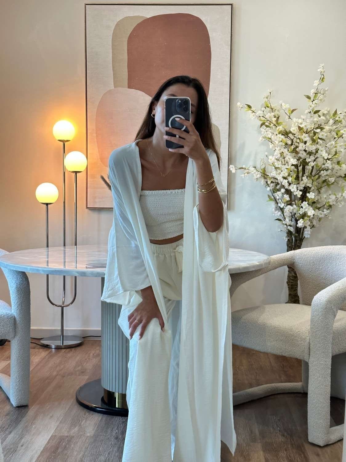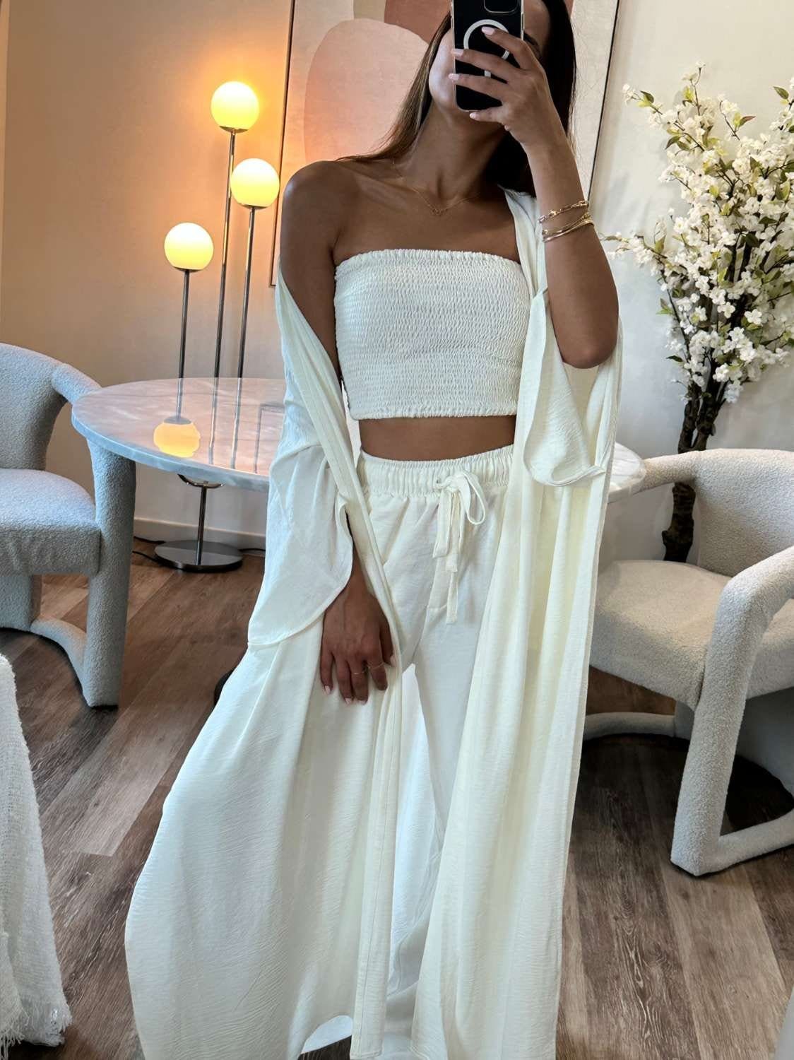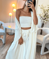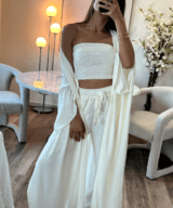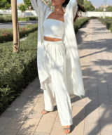 Embrace the carefree elegance of the “Breezy Elegance” 3-Piece Set. Stay cool and fashionable in the lightweight linen-cotton fabric, while the stretchy corset top, comfortable pants, and stylish cardigan offer endless possibilities for creating effortlessly chic outfits. Prepare to turn heads and enjoy the summer in style.