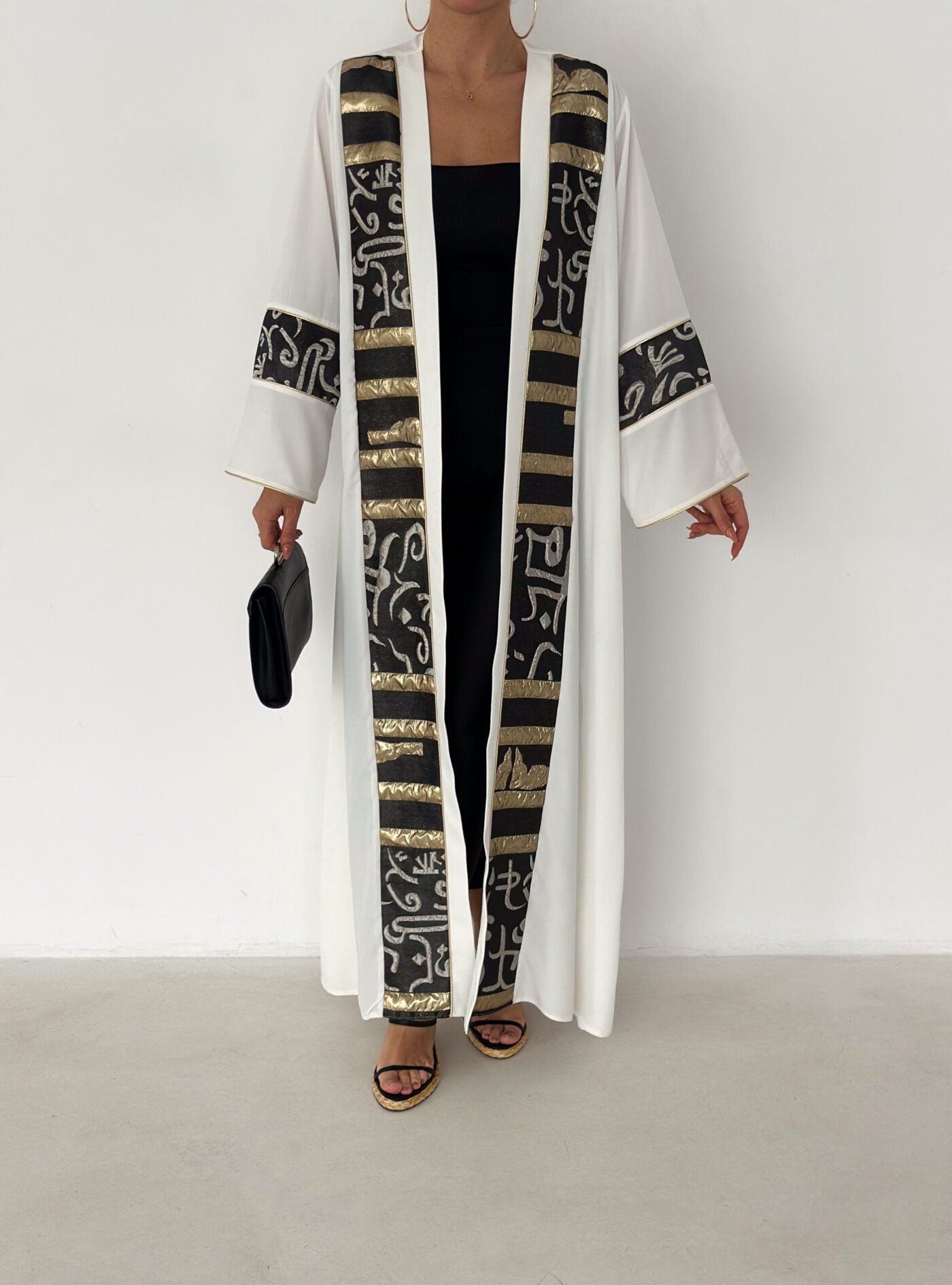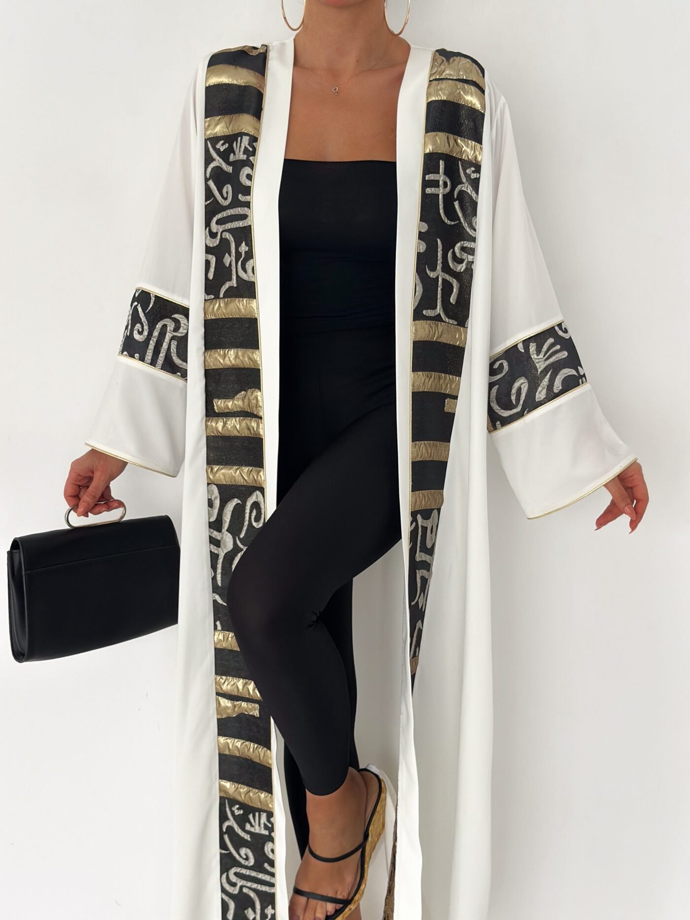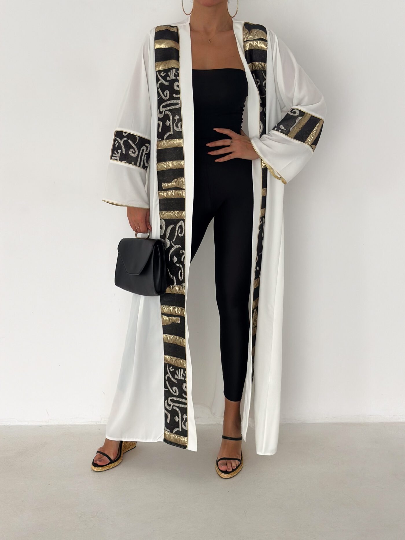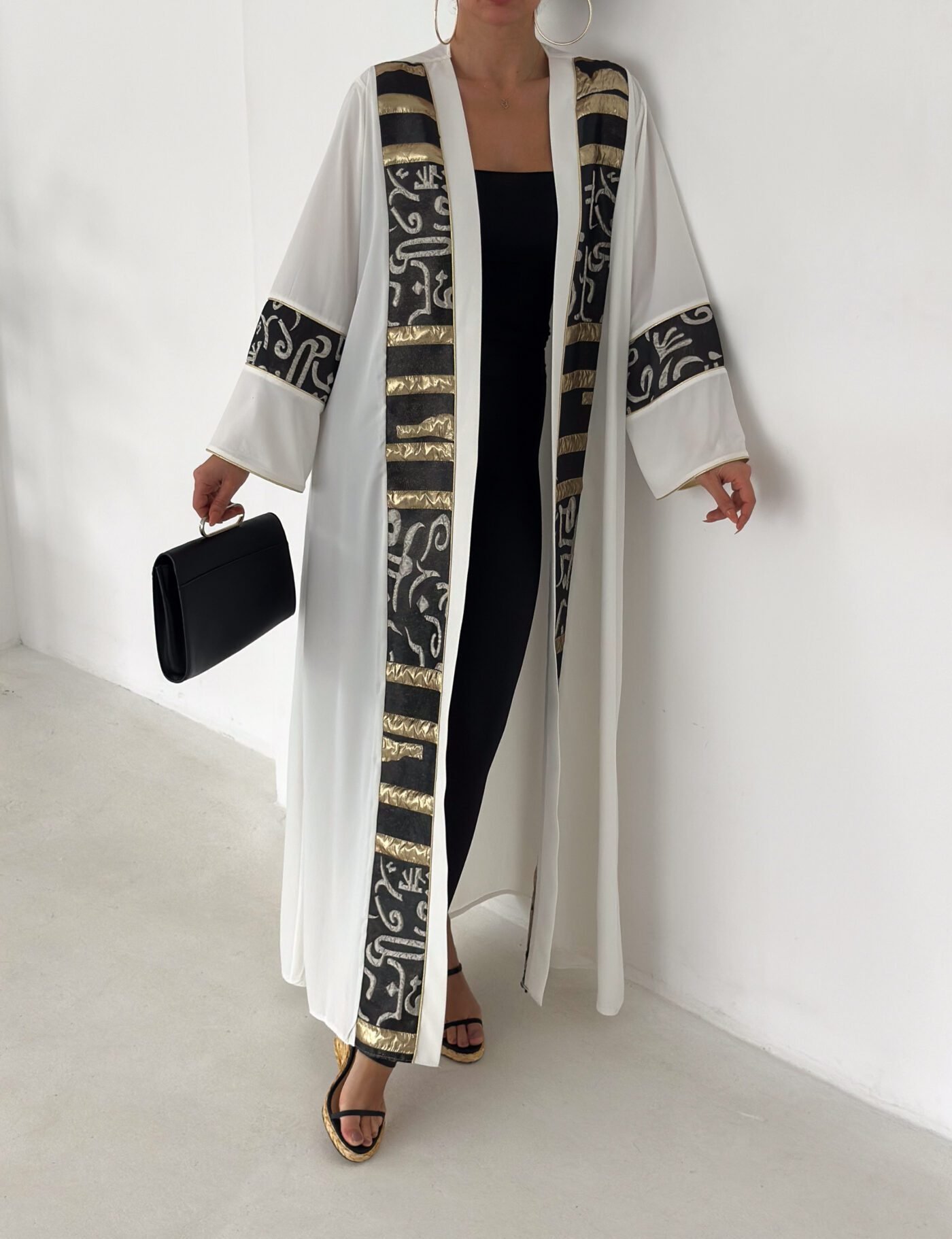 A refined open abaya designed with a flowing white silhouette, highlighted by bold black panels adorned with artistic patterns and subtle gold accents. Crafted from lightweight, airy fabric that drapes beautifully, offering both comfort and elegance. The wide sleeves and clean lines create a timeless look, perfect for both day and evening wear. Style it effortlessly over a black dress for a sophisticated and modern statement.