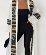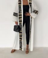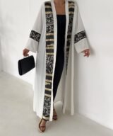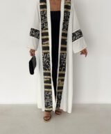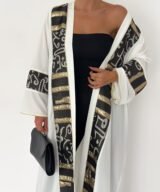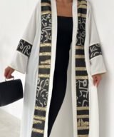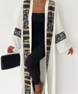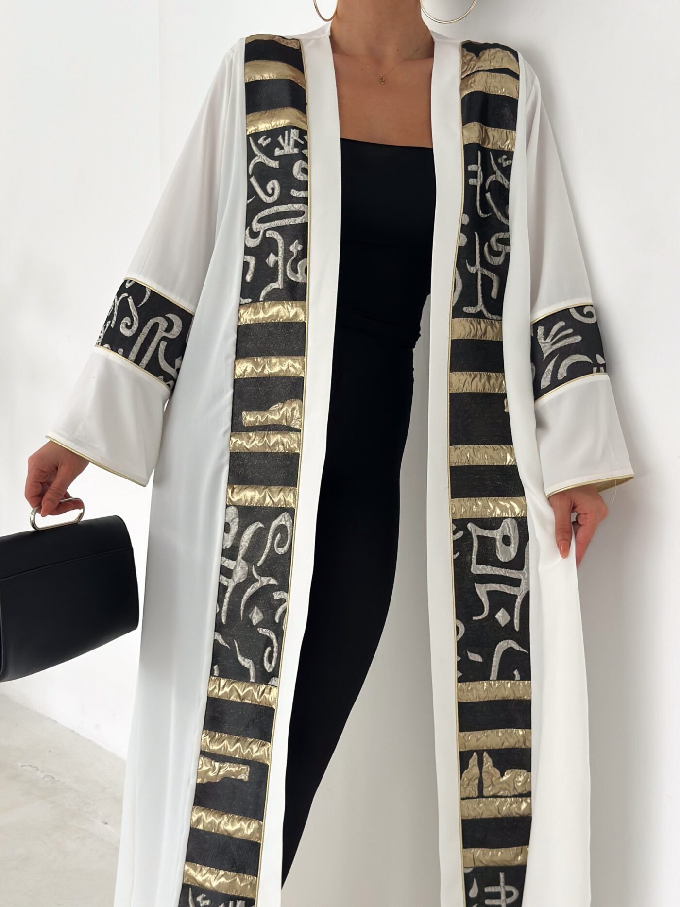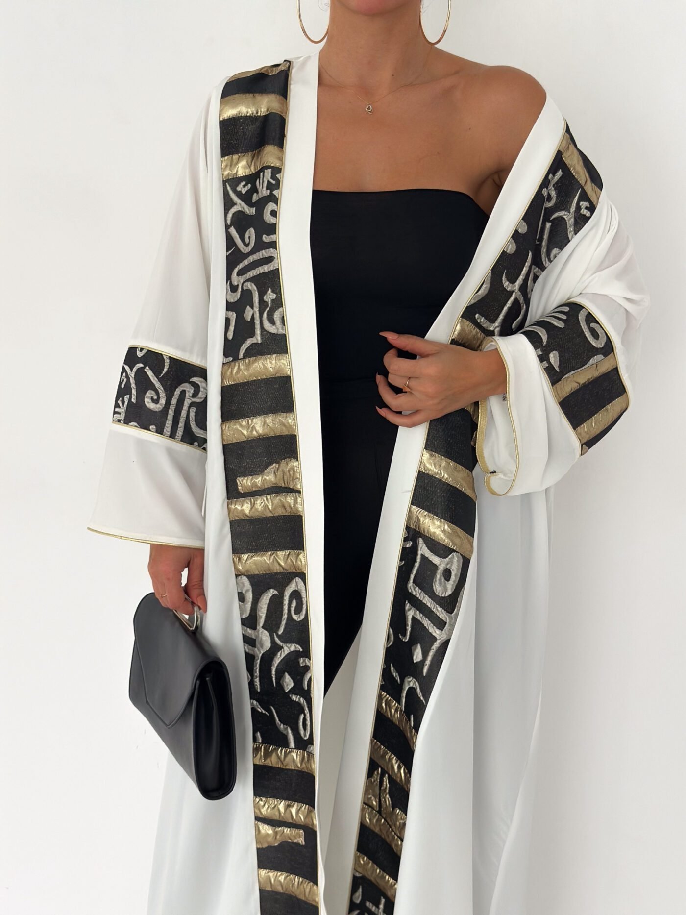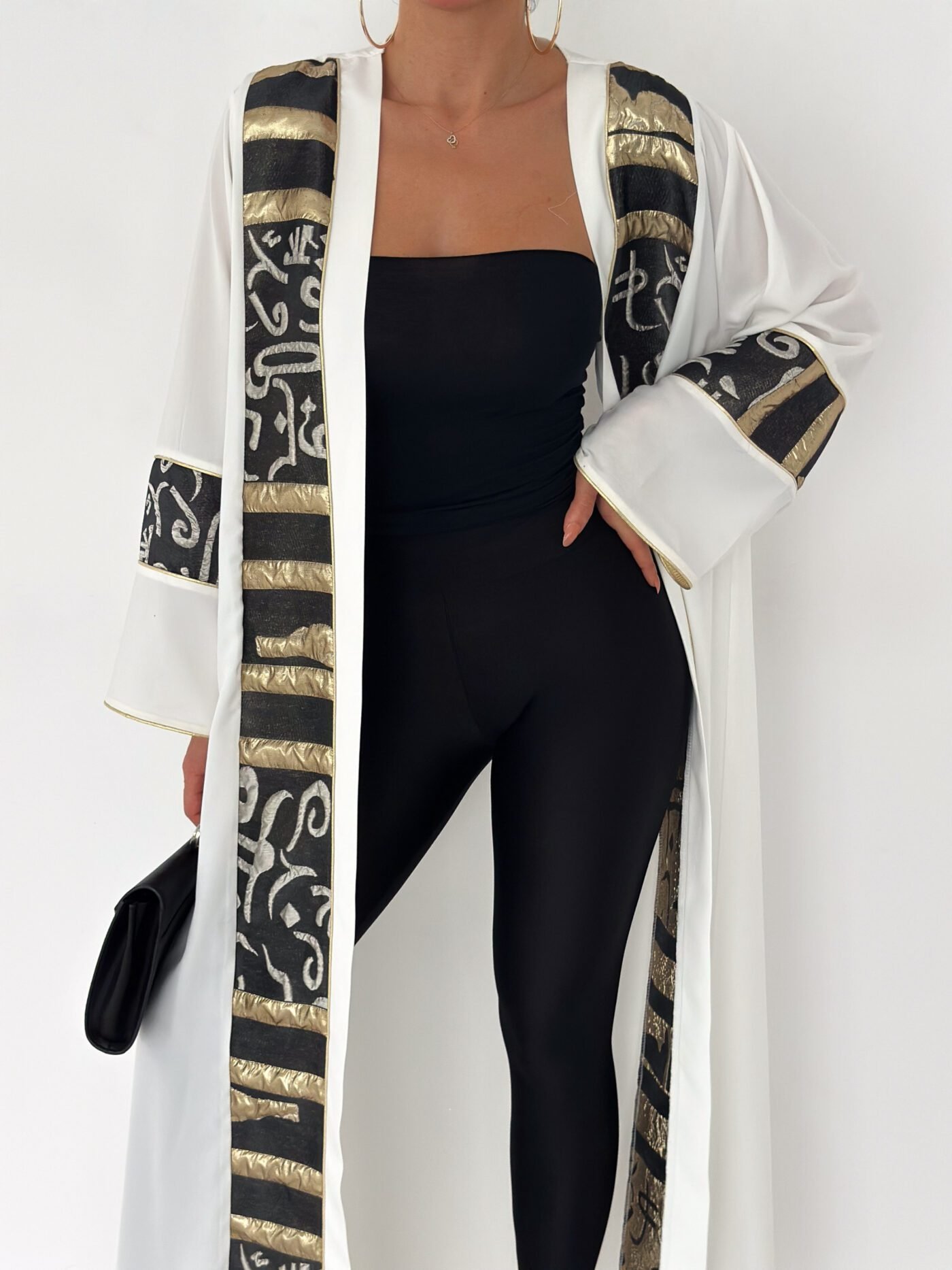 A refined open abaya designed with a flowing white silhouette, highlighted by bold black panels adorned with artistic patterns and subtle gold accents. Crafted from lightweight, airy fabric that drapes beautifully, offering both comfort and elegance. The wide sleeves and clean lines create a timeless look, perfect for both day and evening wear. Style it effortlessly over a black dress for a sophisticated and modern statement.