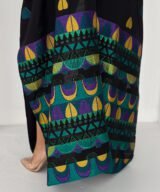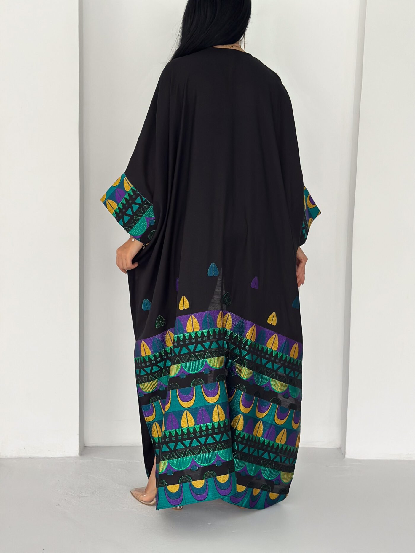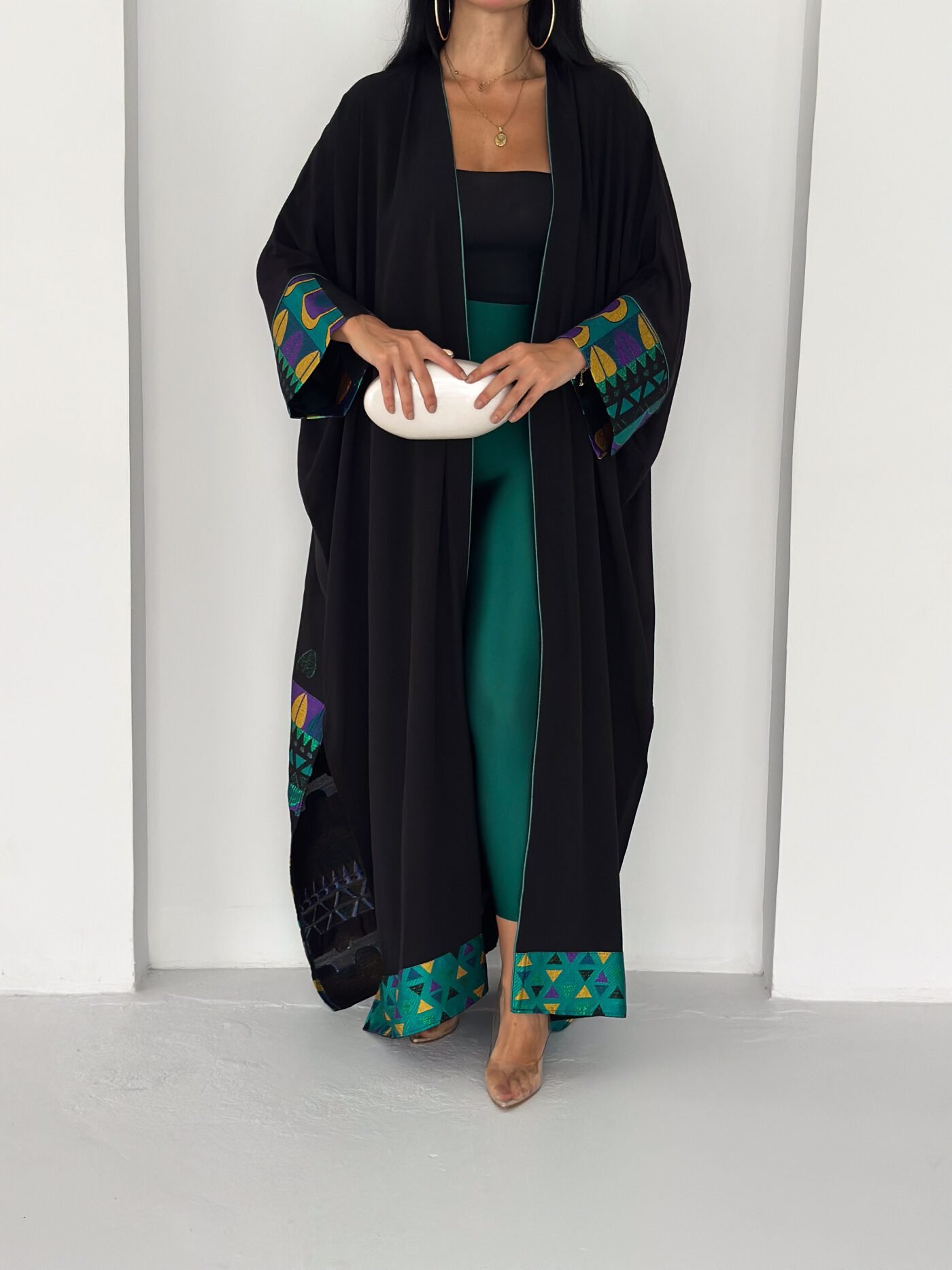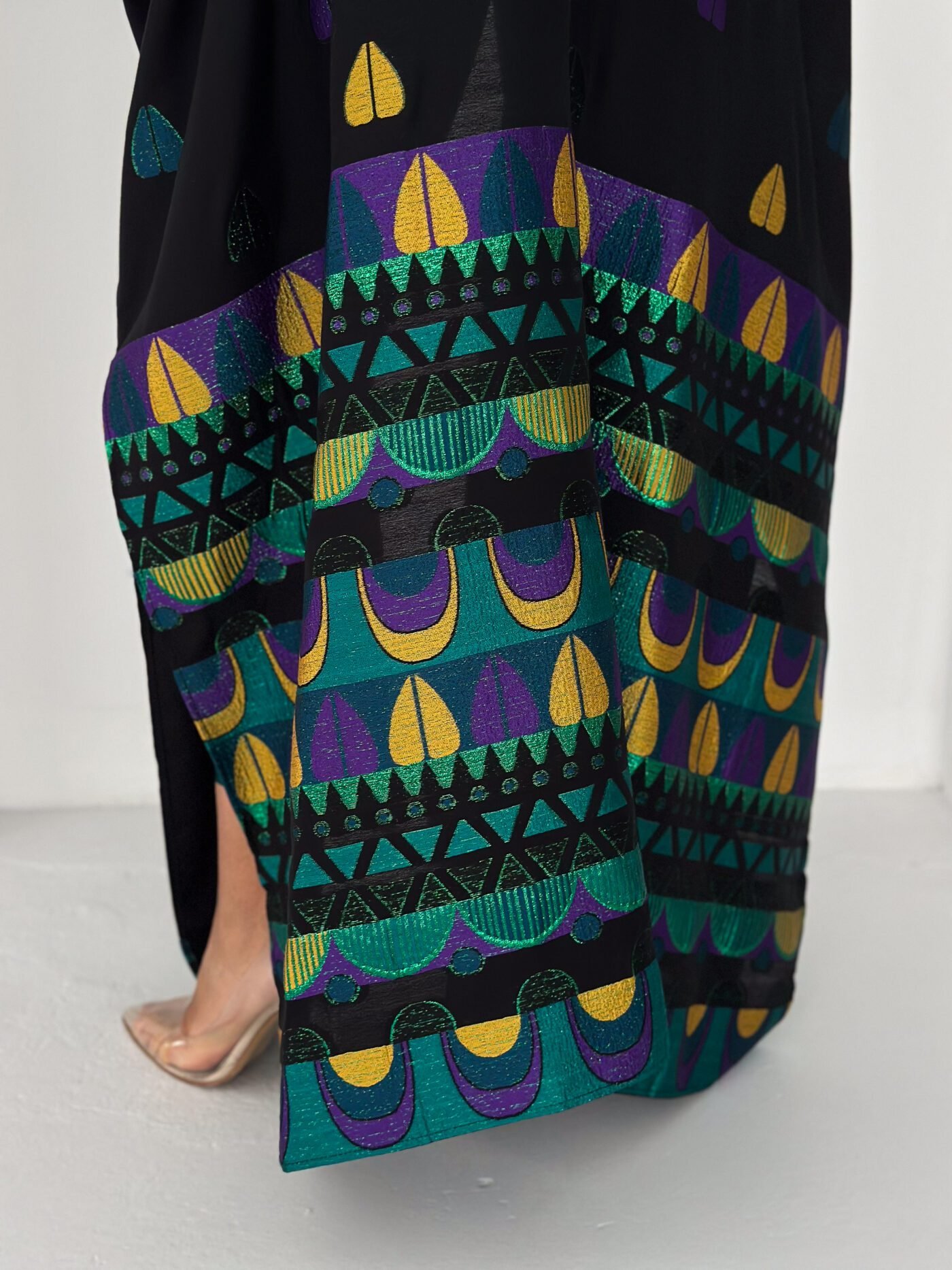 Detailed with rich emerald, purple, and gold geometric accents along the sleeves and hem, inspired by artistic mosaic patterns.