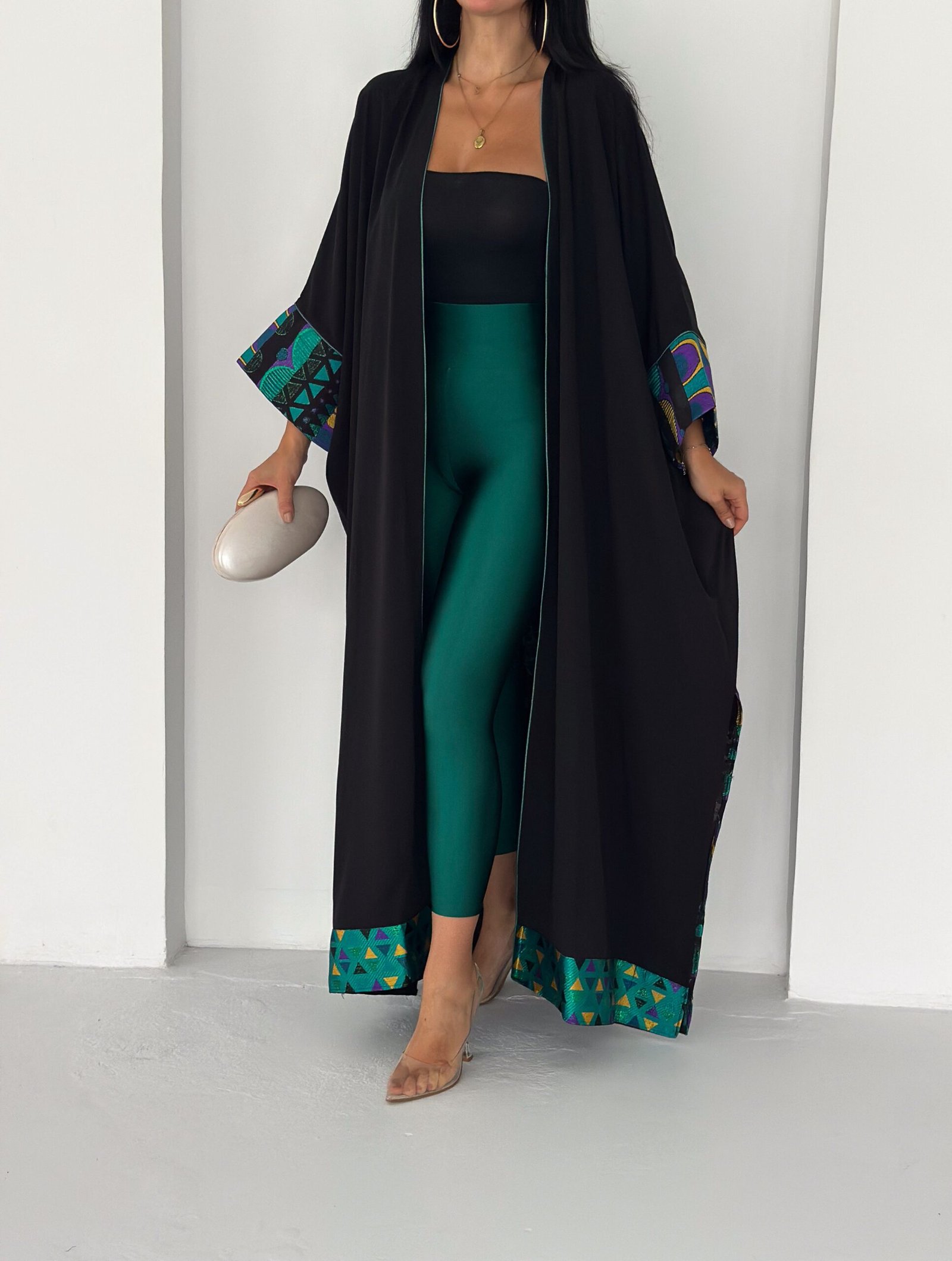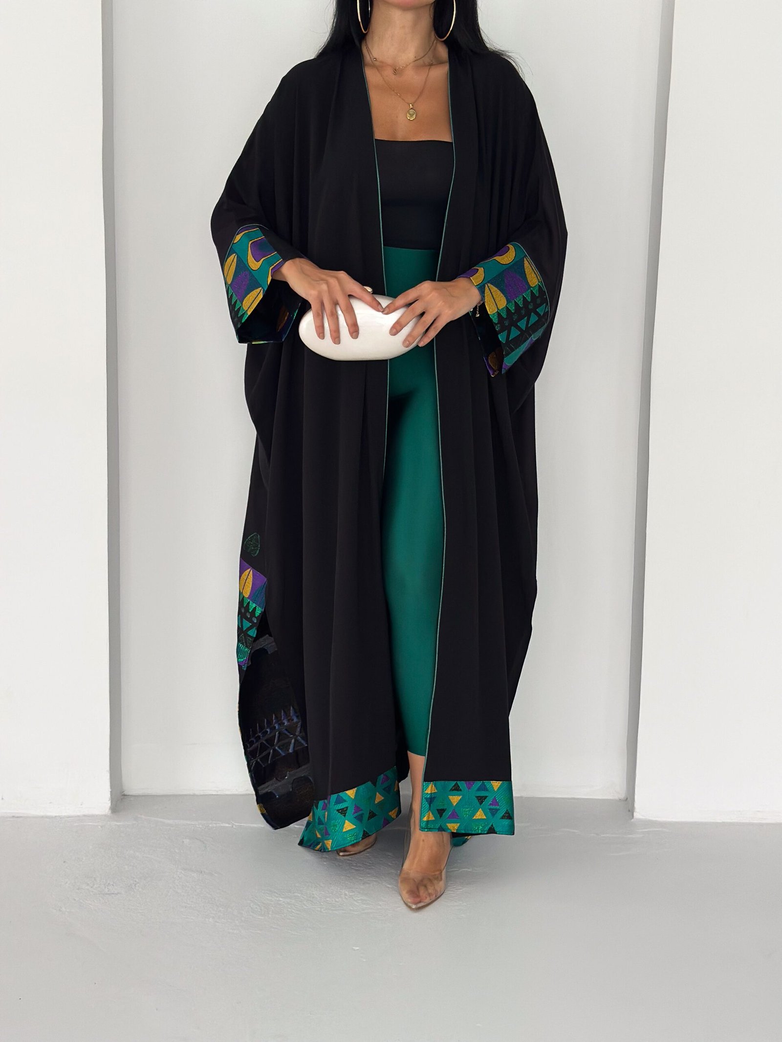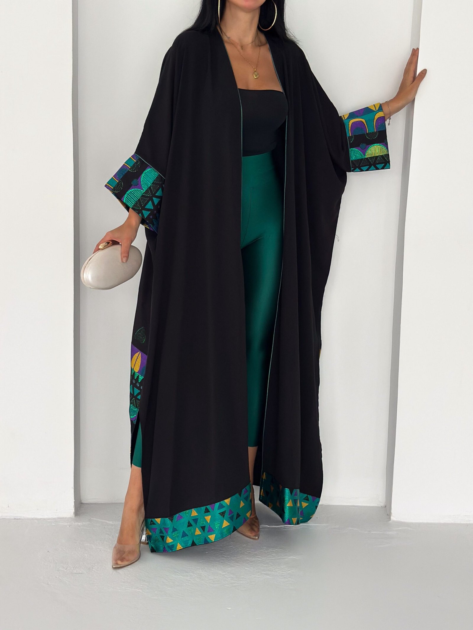 A statement black abaya designed with a flowing, oversized silhouette for effortless elegance.